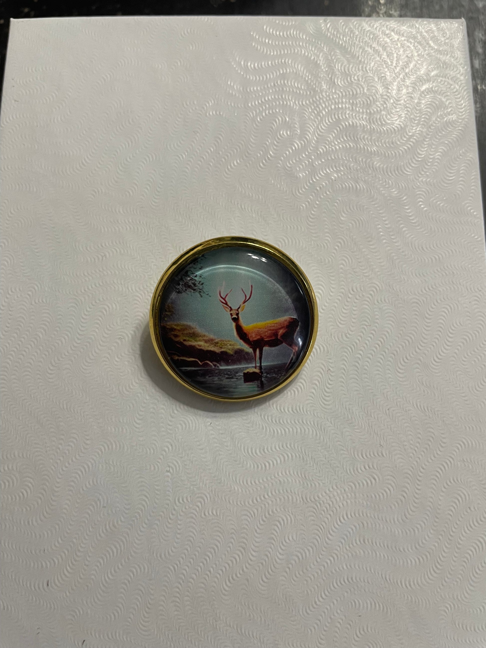 Cette broche dorée de 25 mm met en valeur une illustration détaillée d'un chevreuil, intégrée à une scène naturelle aux teintes chaleureuses. Les couleurs riches du paysage et la silhouette élégante du cerf sont sublimées par une finition lisse et brillante, offrant une belle profondeur visuelle.