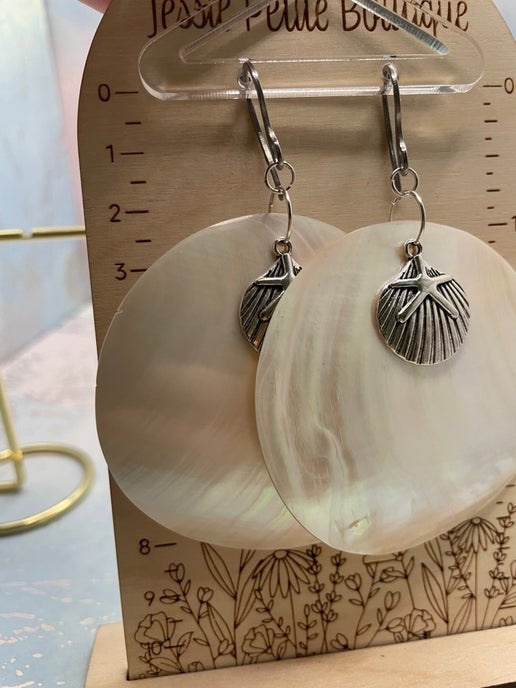 Boucle d'oreille coquillage 6 cm avec palourde+étoile de mer argentée-Acier inoxydable
