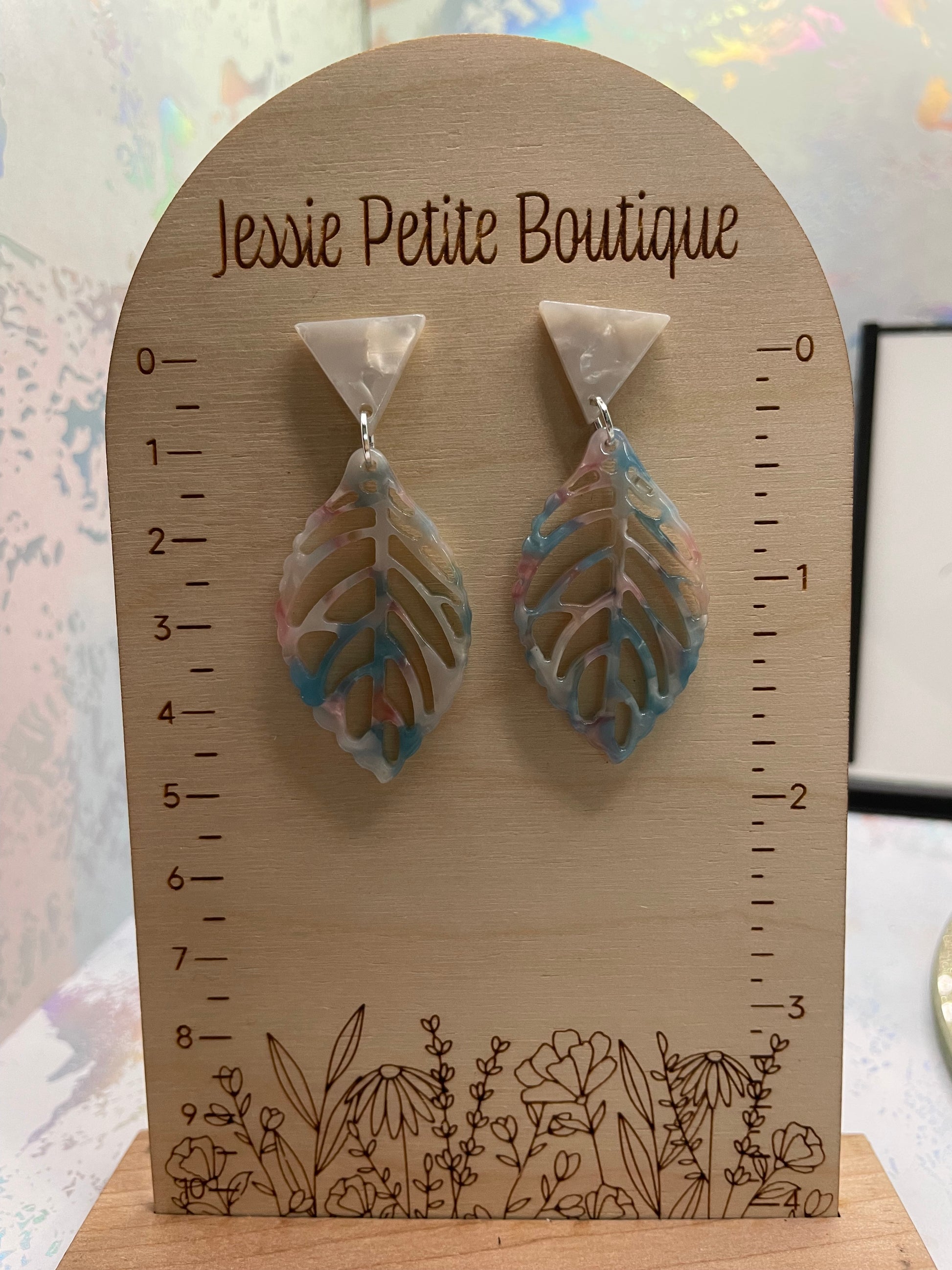 Ajoutez une touche de couleur vive à votre look avec ces élégantes boucles d'oreilles feuilles en acétate acrylique. Dans un magnifique mélange de bleu, de rose et de blanc, les pendants en forme de feuille sont associés à d'élégants boutons d'oreille triangulaires blancs pour un contraste géométrique unique. Leur légèreté assure un confort optimal tout au long de la journée, tandis que leur fermoir papillon assure un maintien parfait.