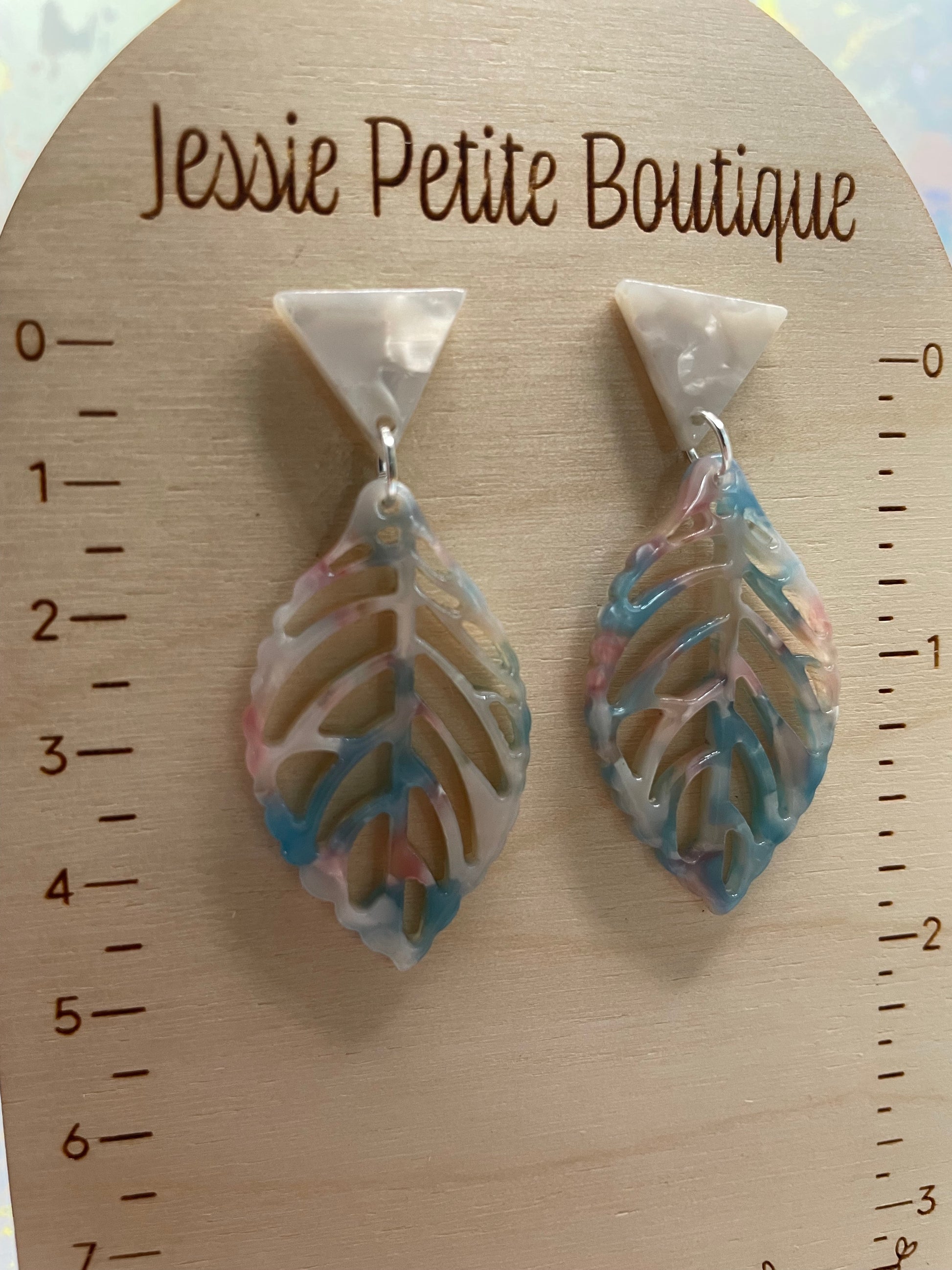 Boucles d'oreilles feuilles acrylique+bouton triangulaire