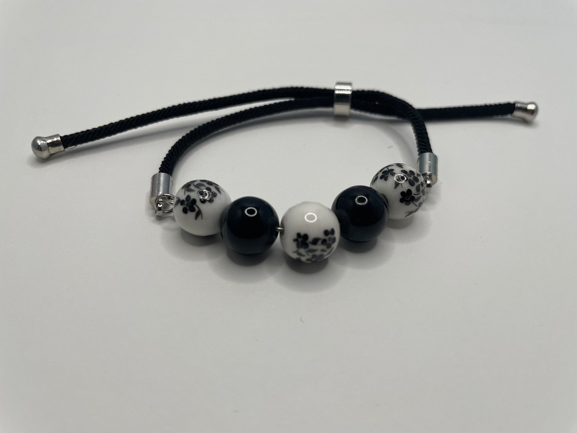 Bracelet corde ajustable billes de céramique – Noir et blanc floral