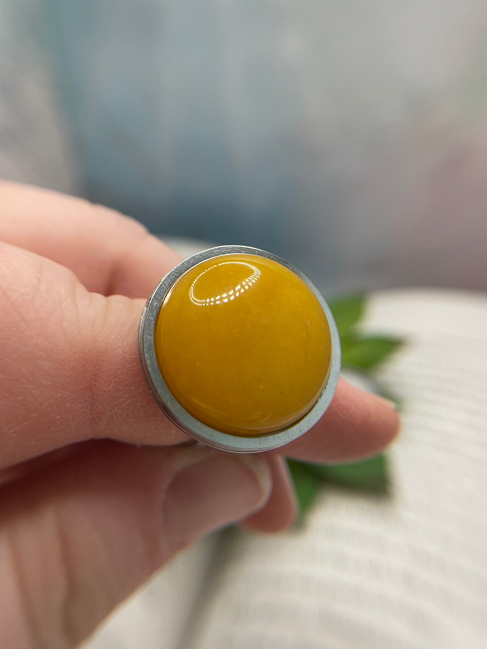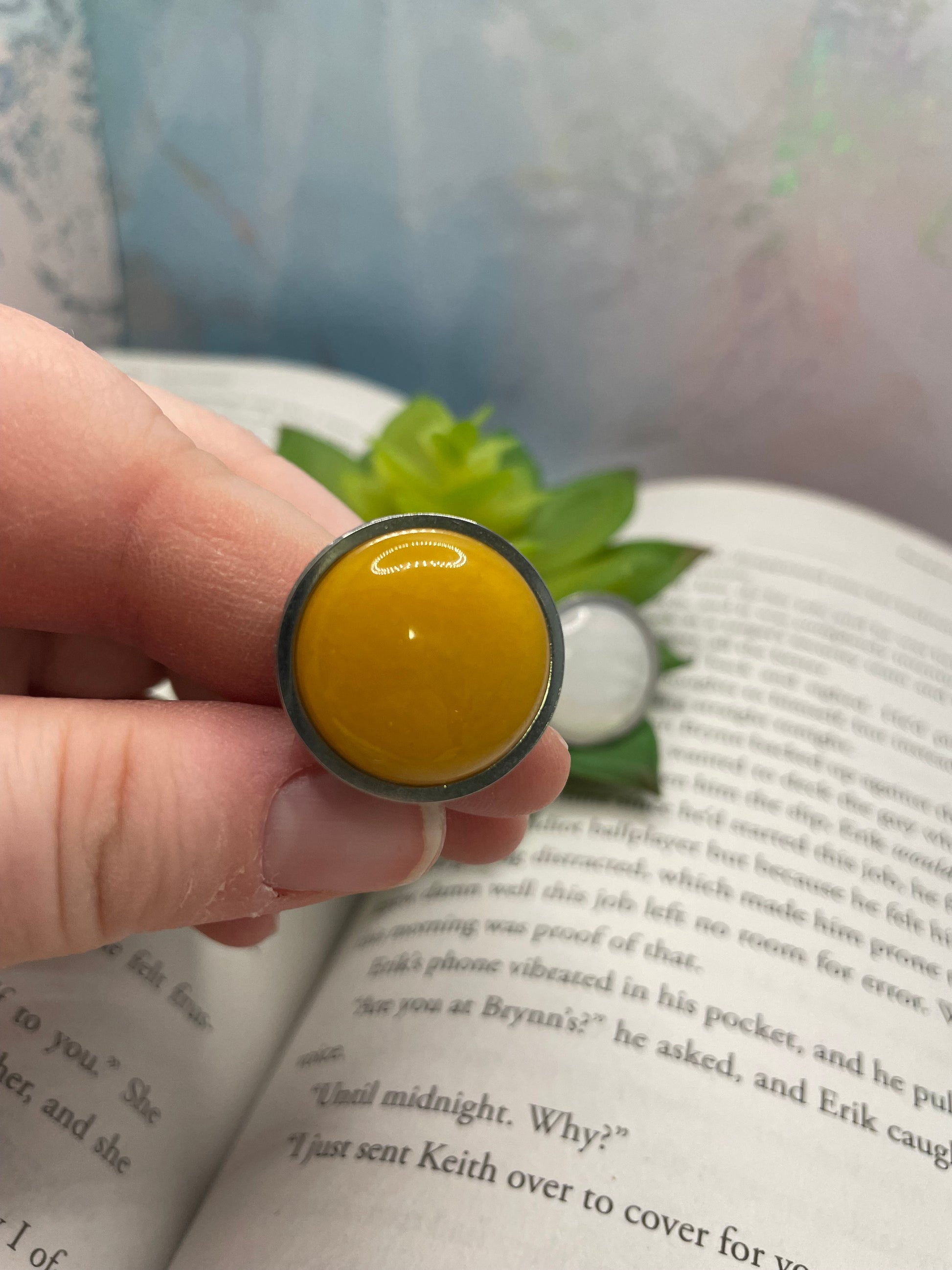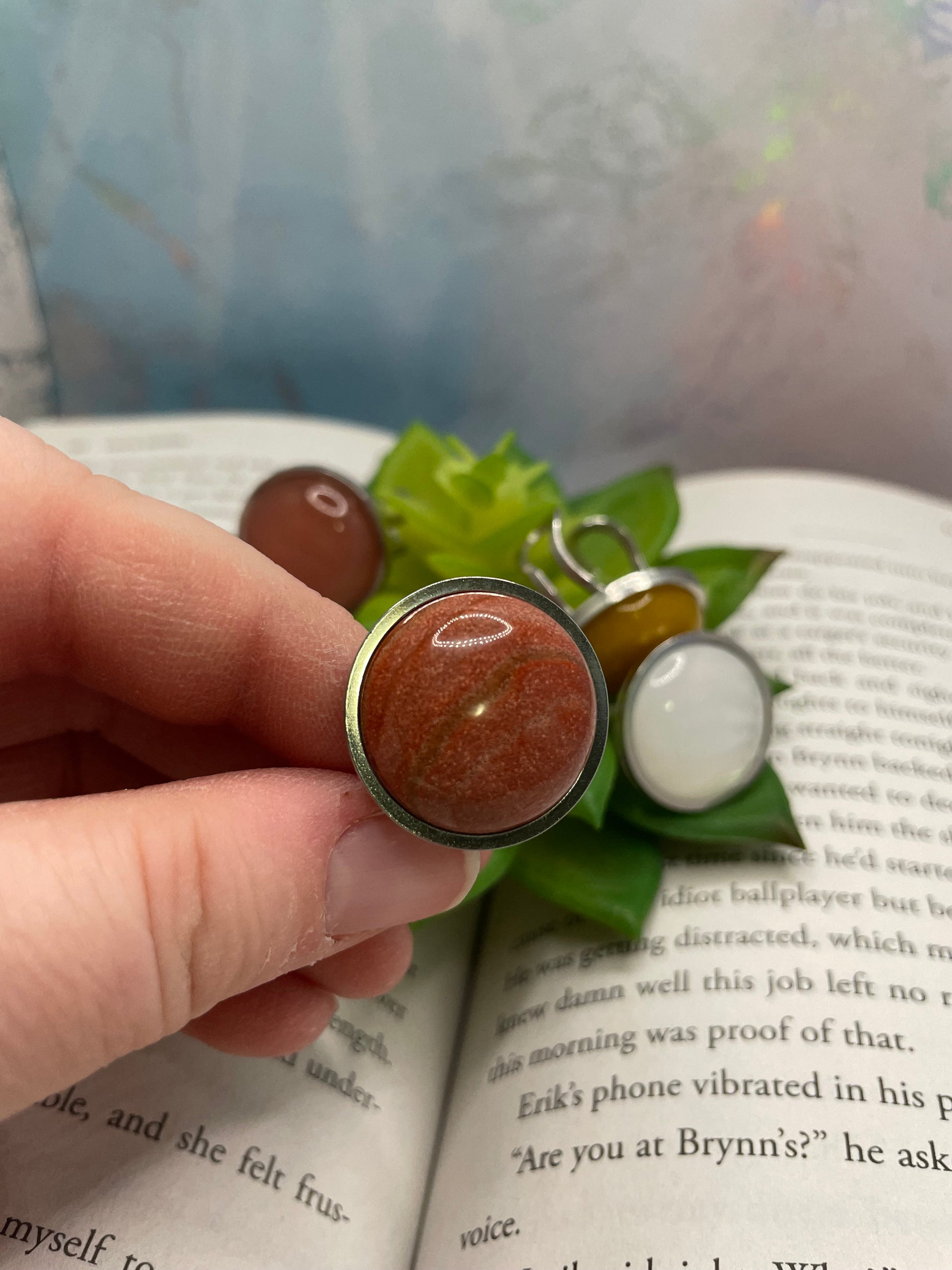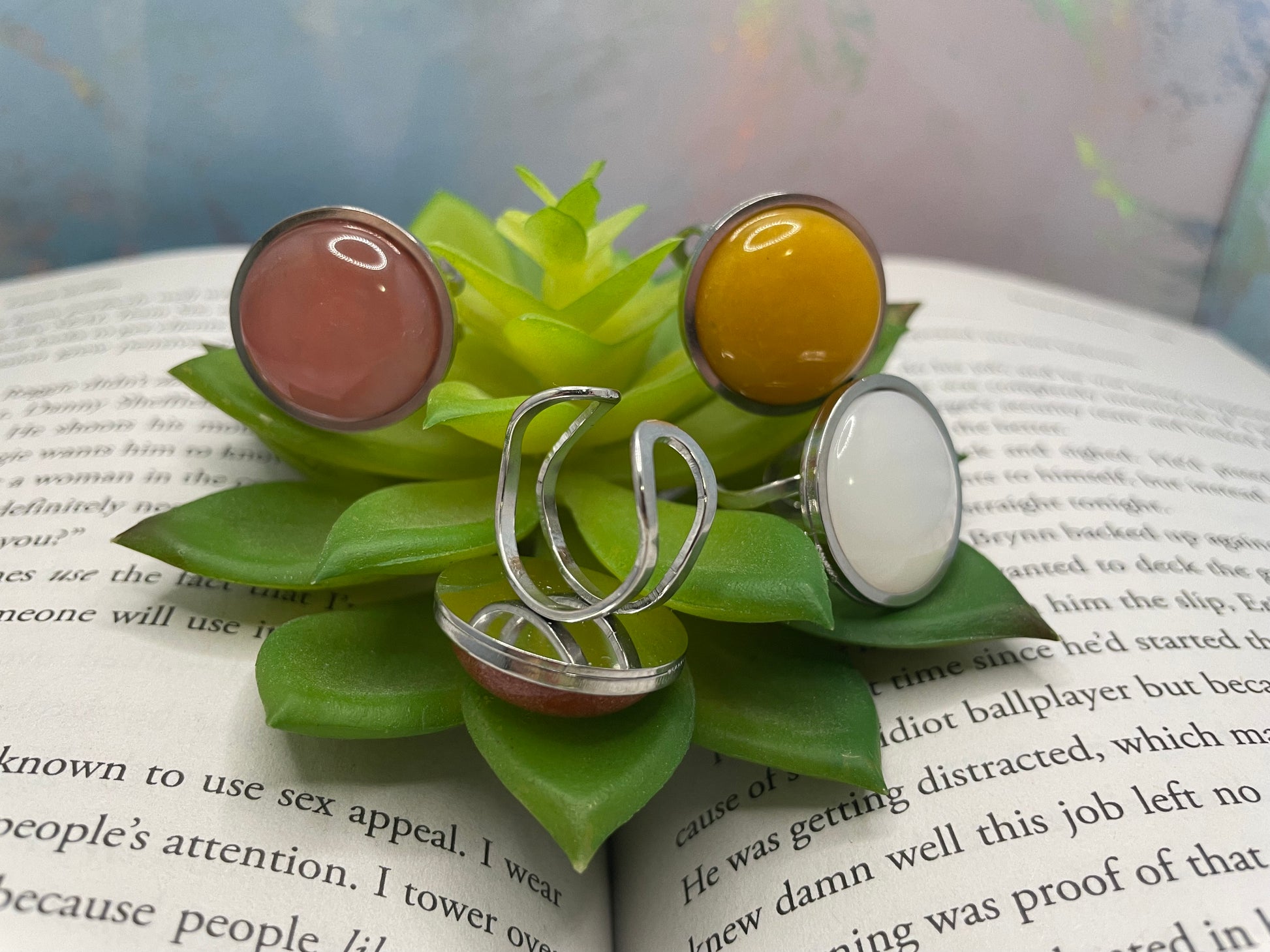Une collection contemporaine de bagues rondes audacieuses, chacune ornée d’une pierre polie montée sur un anneau double ajustable en acier inoxydable.
