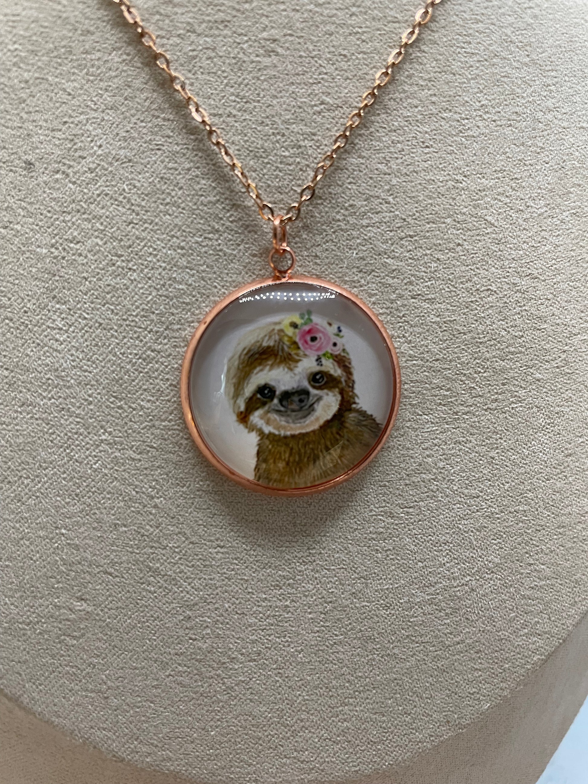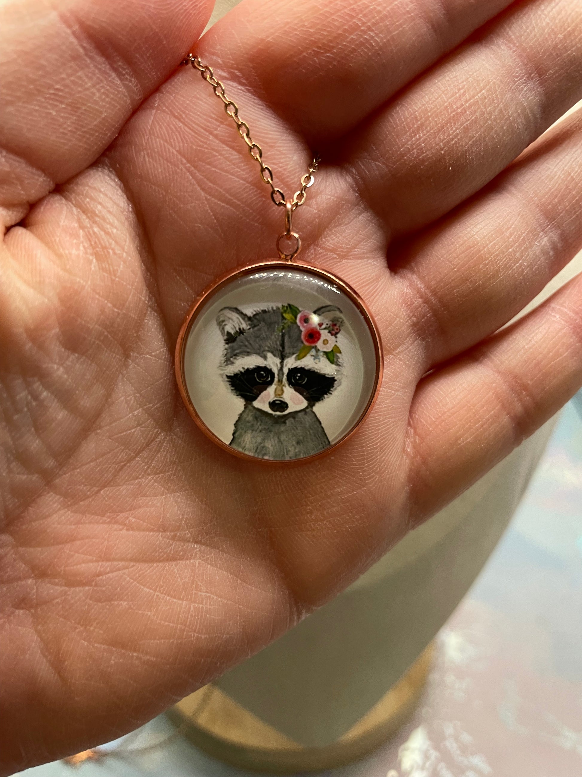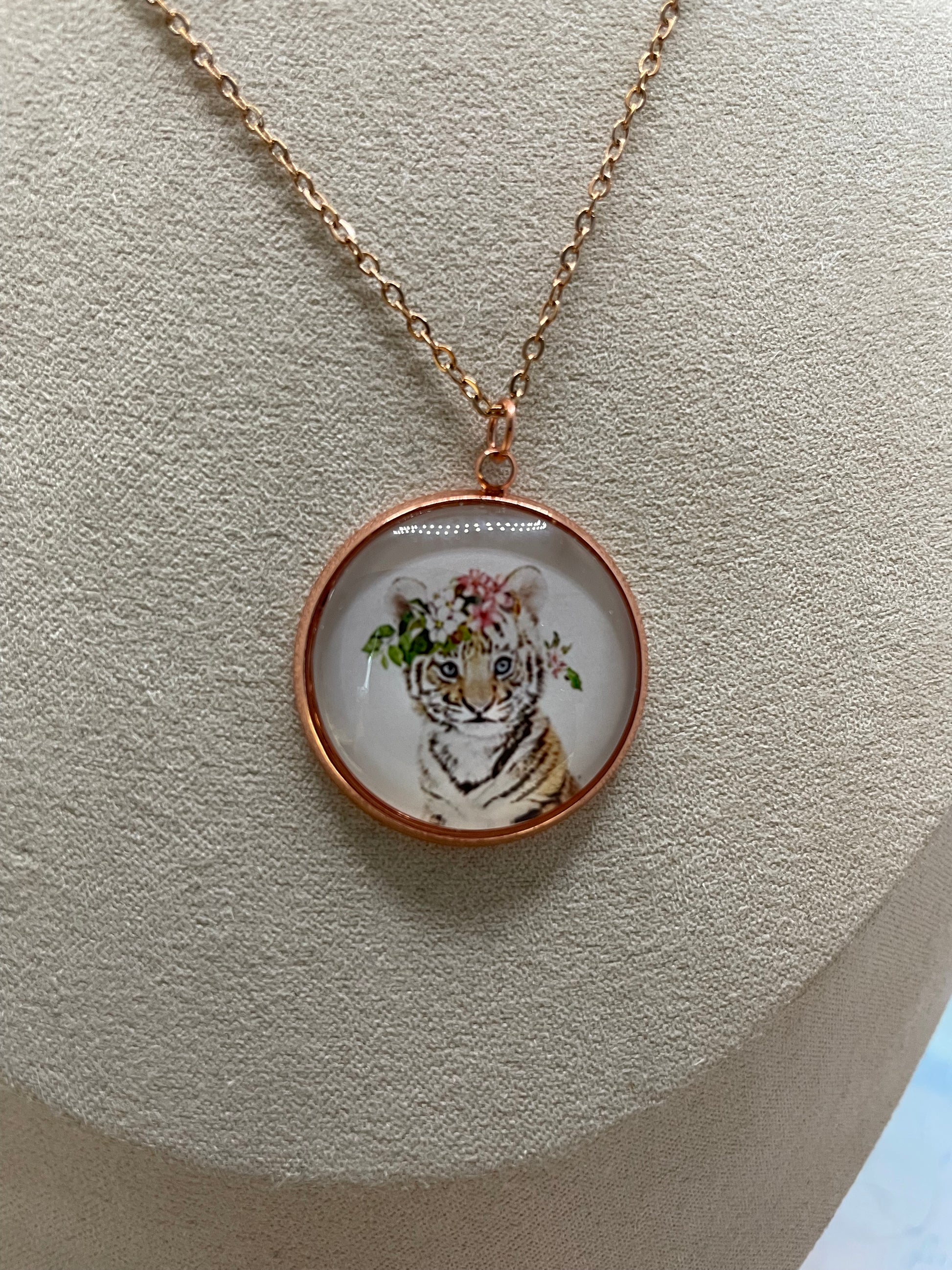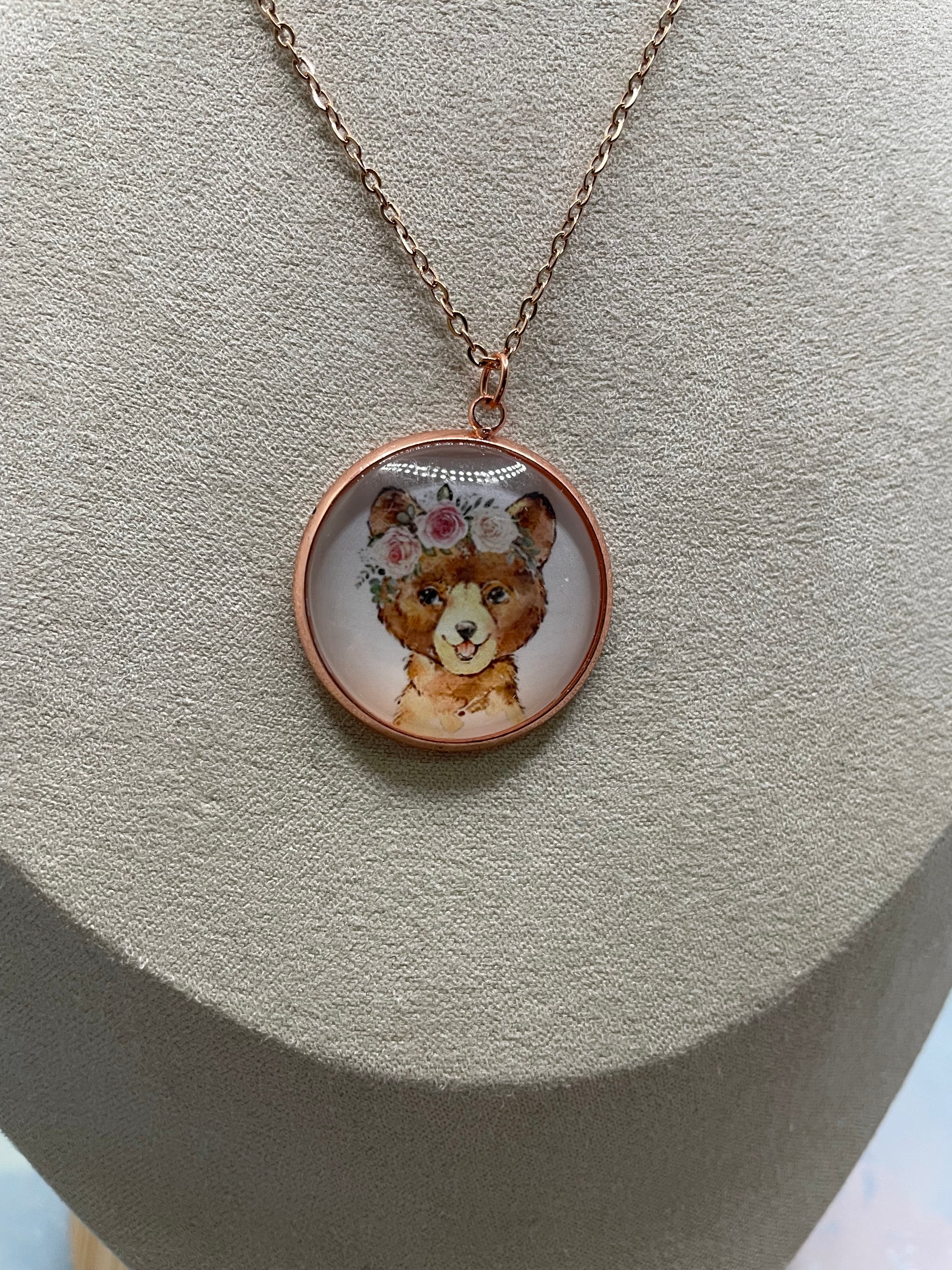 Ce collier artisanal met en valeur un charmant cabochon en verre illustrant un adorable portrait d’animal orné d’une délicate couronne de fleurs. Le tout est encadré d’un serti rond en or rose, pour un style doux, poétique et facile à porter au quotidien.