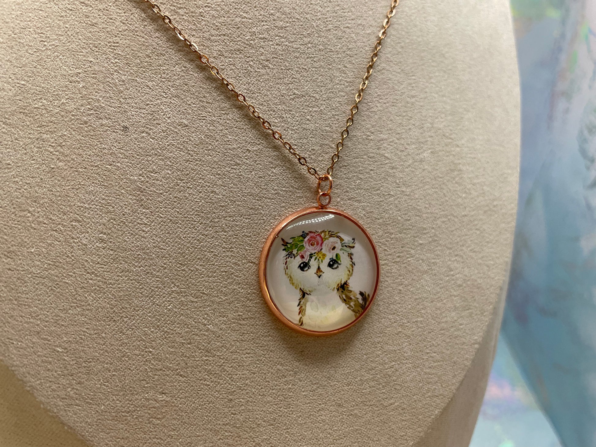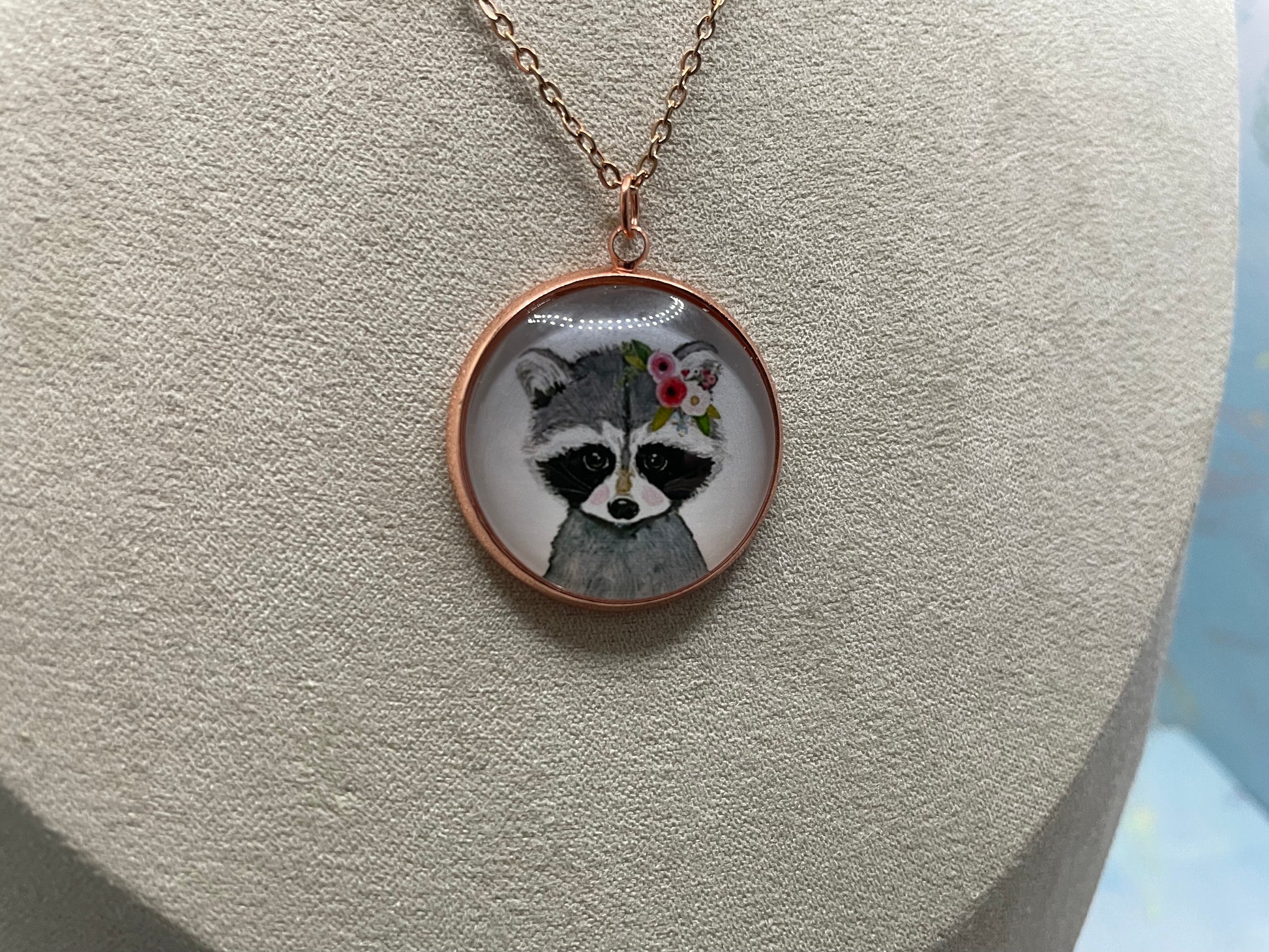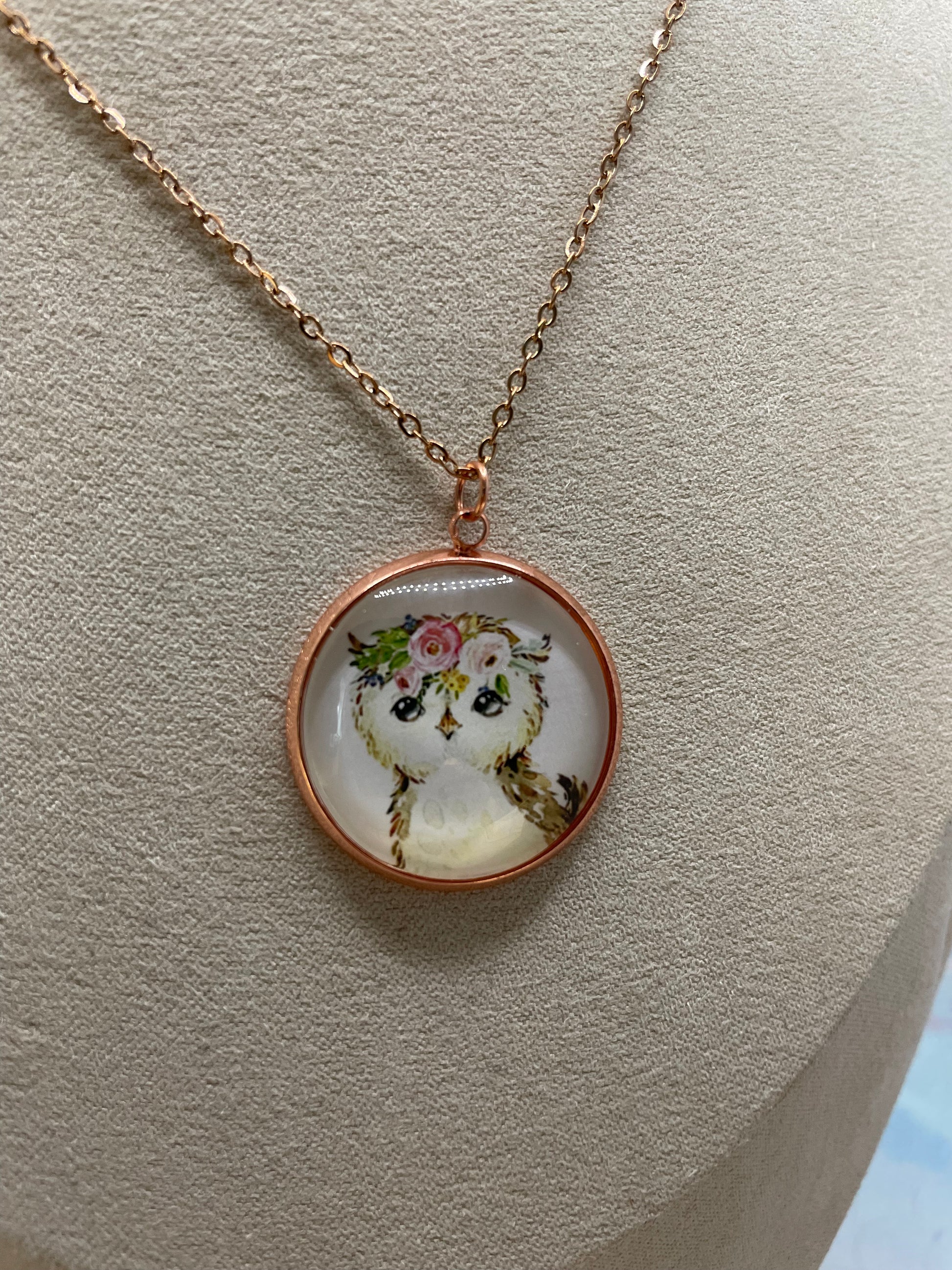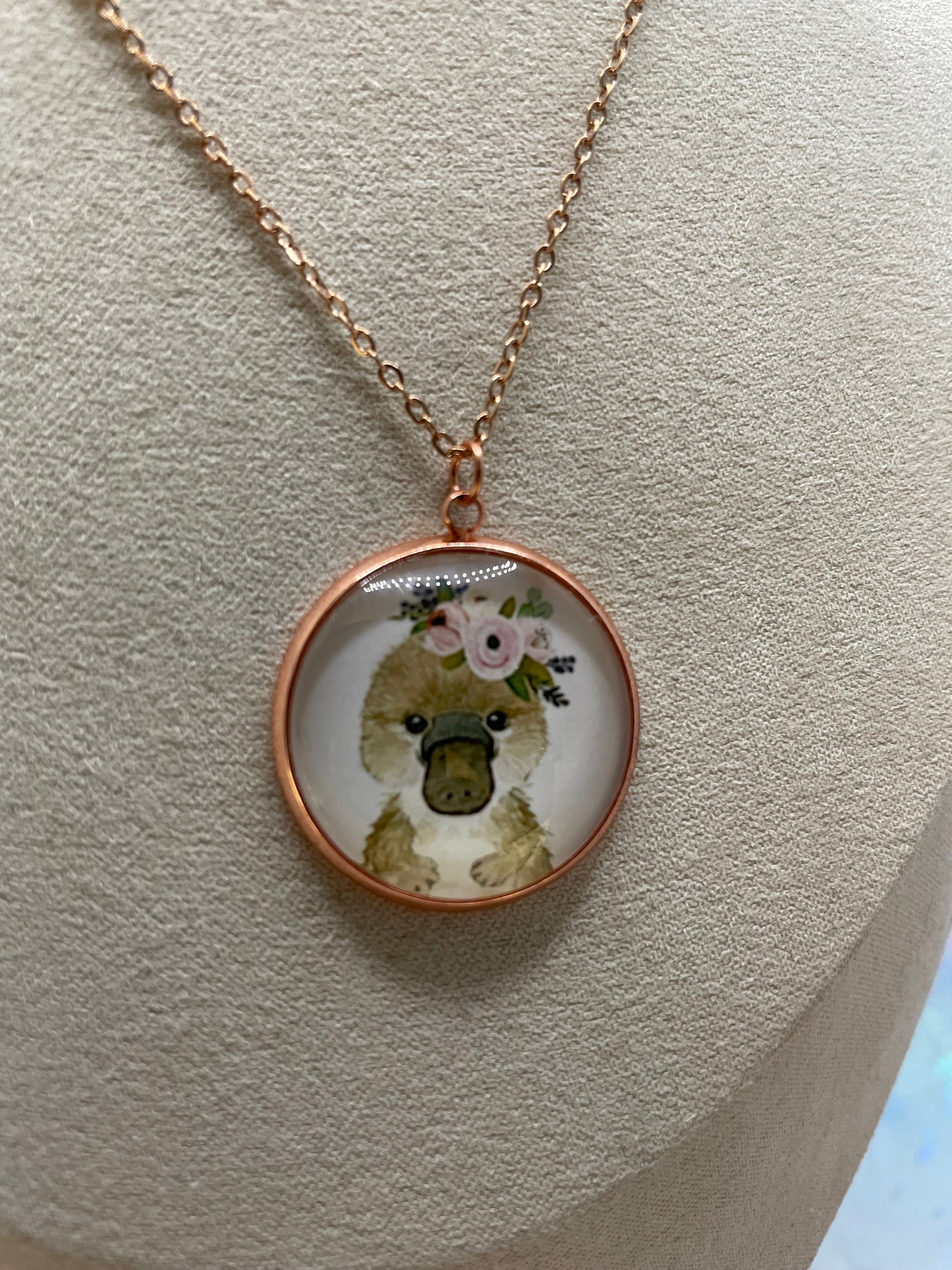 Ce collier artisanal met en valeur un charmant cabochon en verre illustrant un adorable portrait d’animal orné d’une délicate couronne de fleurs. Le tout est encadré d’un serti rond en or rose, pour un style doux, poétique et facile à porter au quotidien.