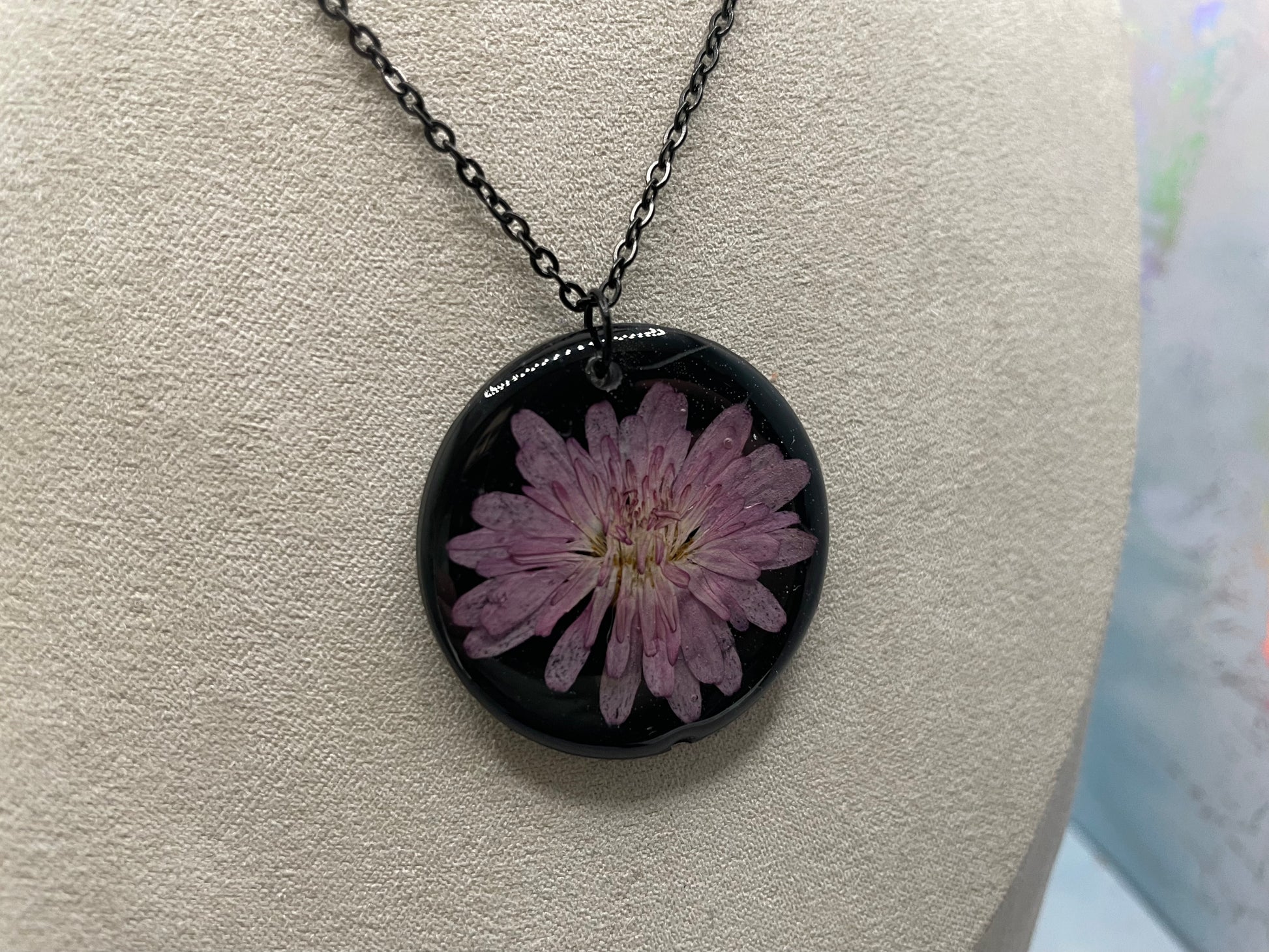 Ce collier élégant met en valeur une véritable fleur d’aster mauve séchée, délicatement préservée dans une résine transparente sur un fond noir profond. Le pendentif rond révèle la finesse et la superposition naturelle des pétales, offrant un contraste raffiné et intemporel. Chaque pièce est fabriquée à la main, rendant chaque collier absolument unique.