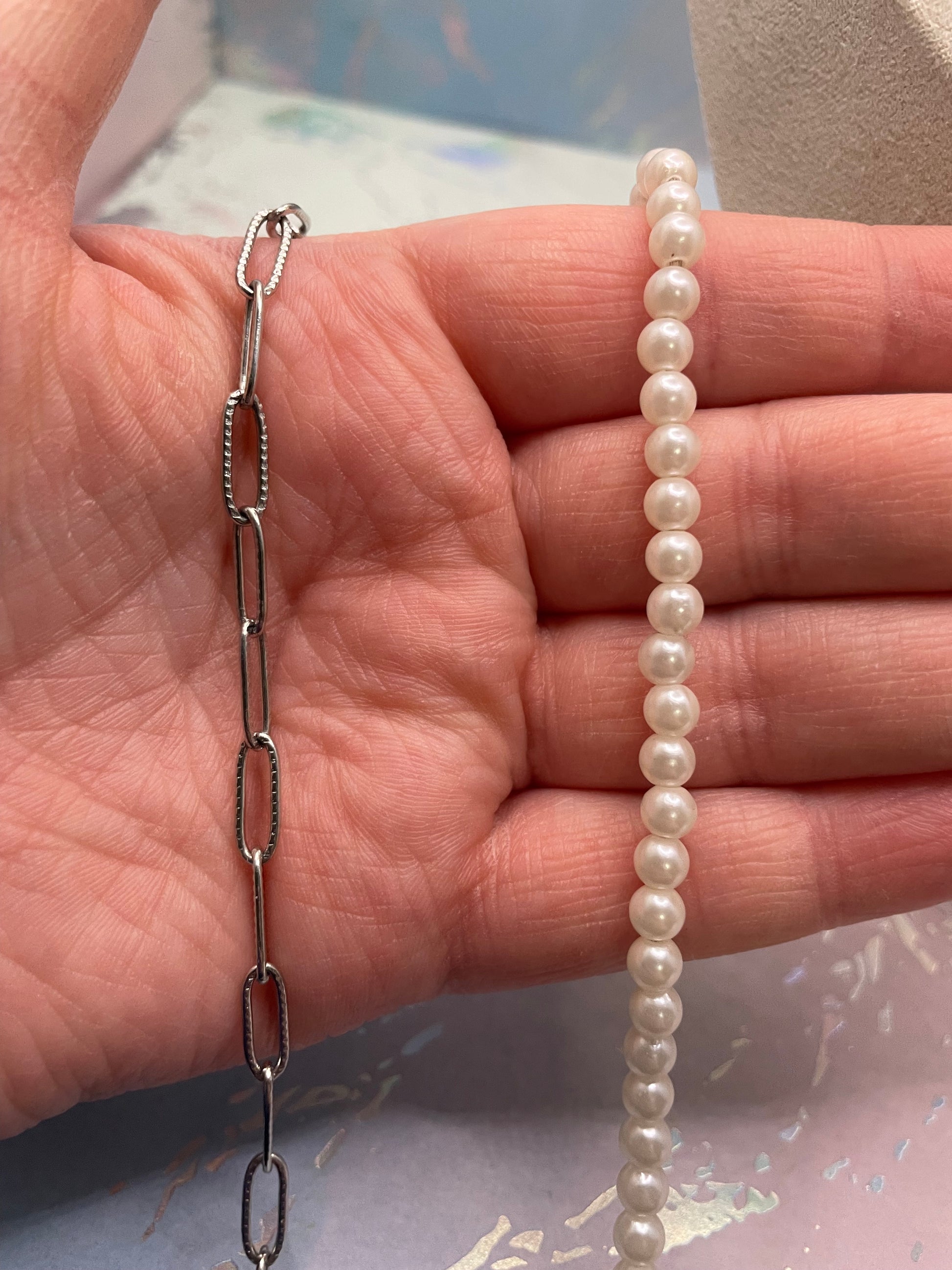 Ce collier asymétrique marie avec finesse la douceur intemporelle des perles et le caractère moderne d’une chaîne en acier inoxydable. D’un côté, des perles blanches de 5 mm apportent une touche classique et lumineuse, tandis que l’autre côté est composé d’une chaîne en acier inoxydable au fini épuré, créant un contraste équilibré et raffiné.