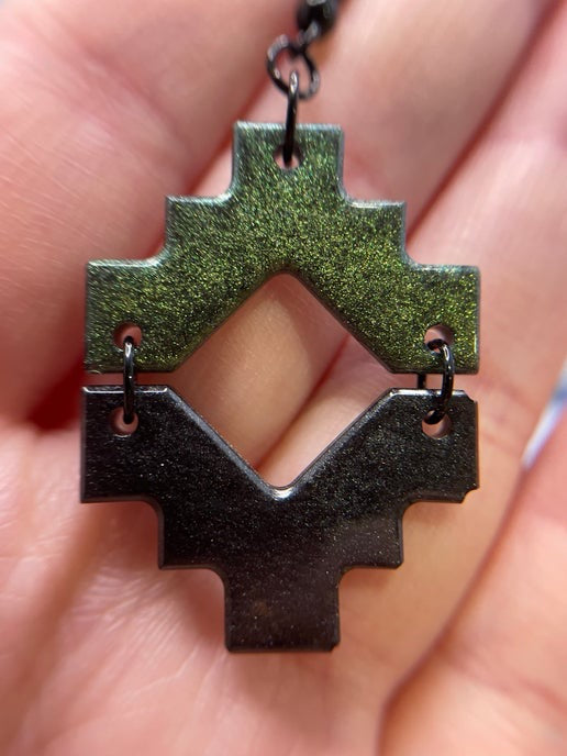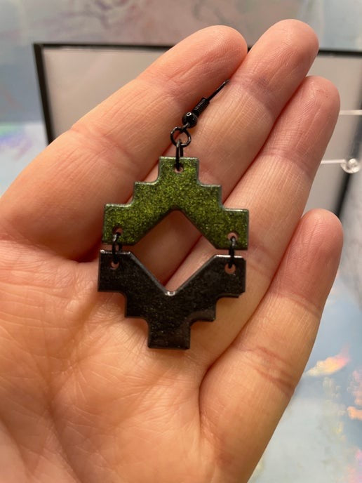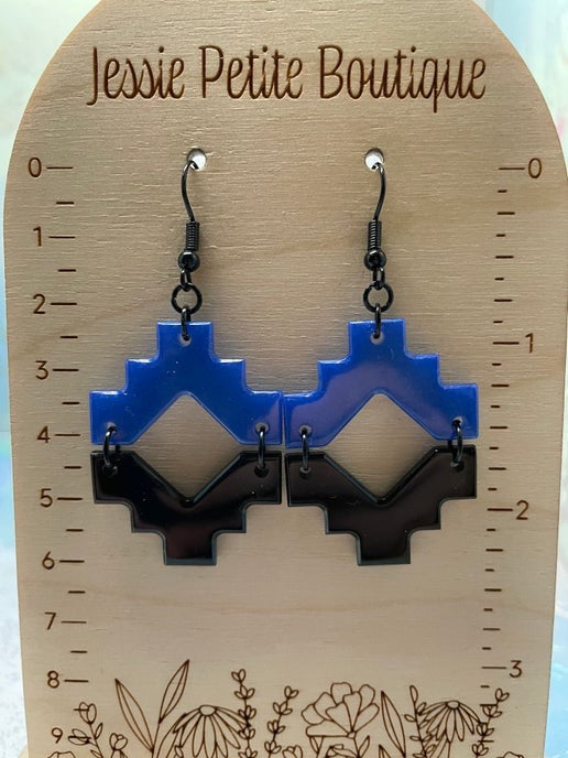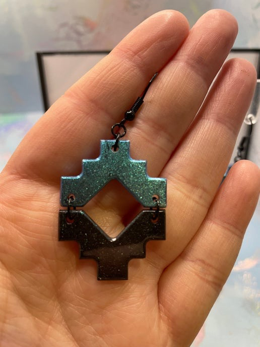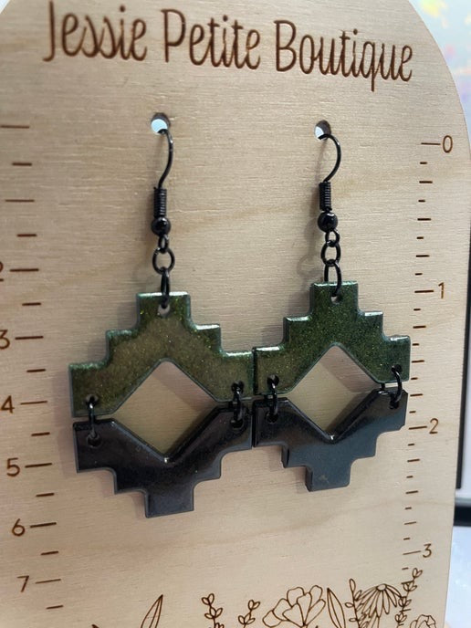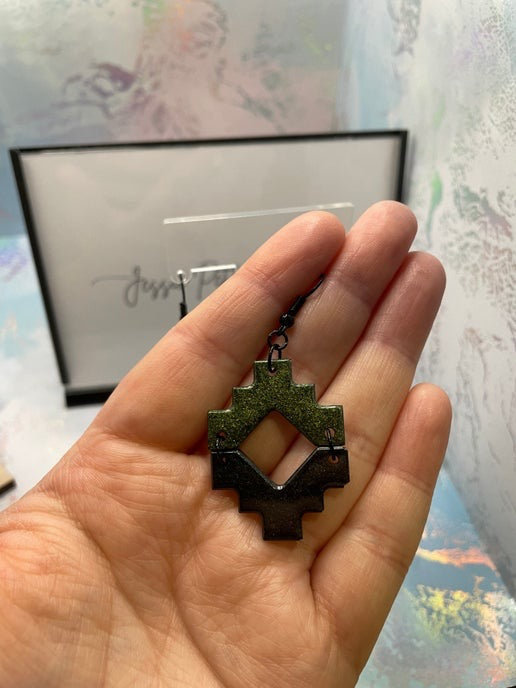 Ajoutez une touche culturelle à votre look avec ces boucles d'oreilles d'inspiration aztèque, réalisées en résine et rehaussées de poudre de mica pour un éclat subtil. Leur design géométrique saisissant et leur légèreté en font un ajout audacieux et confortable à votre collection de bijoux. Disponibles en deux couleurs.