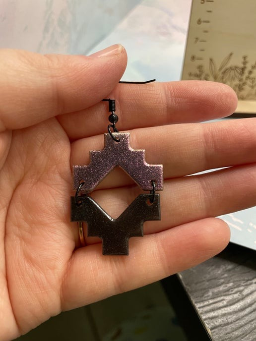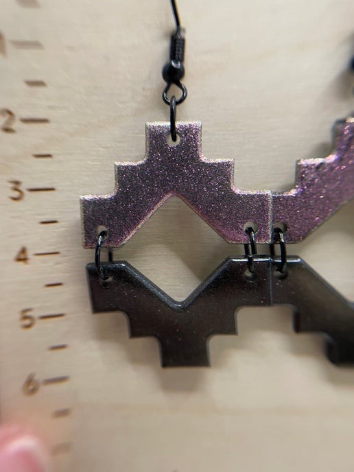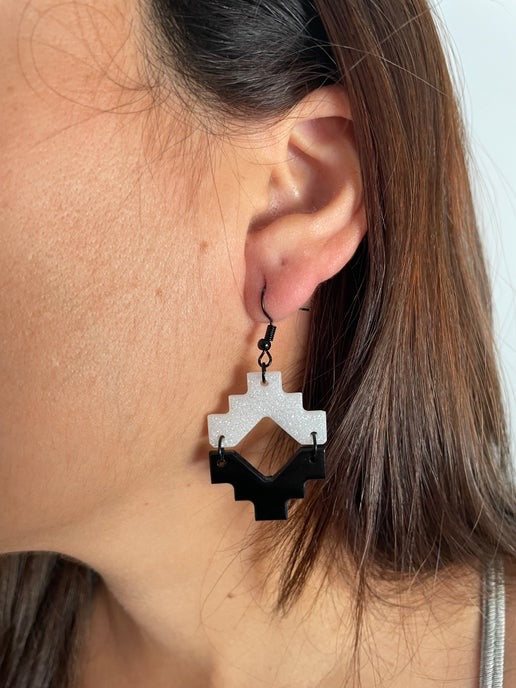 Ajoutez une touche culturelle à votre look avec ces boucles d'oreilles d'inspiration aztèque, réalisées en résine et rehaussées de poudre de mica pour un éclat subtil. Leur design géométrique saisissant et leur légèreté en font un ajout audacieux et confortable à votre collection de bijoux.