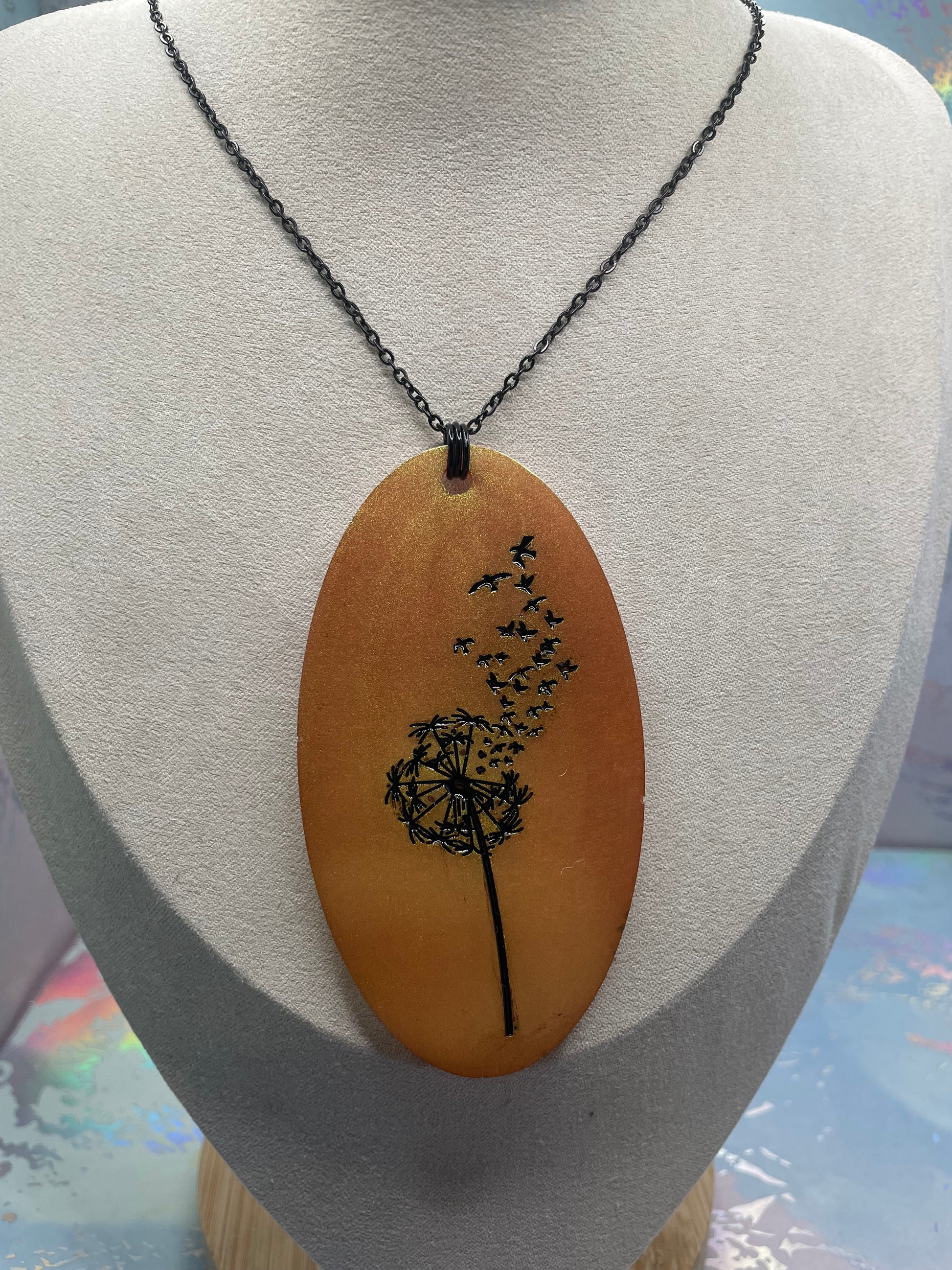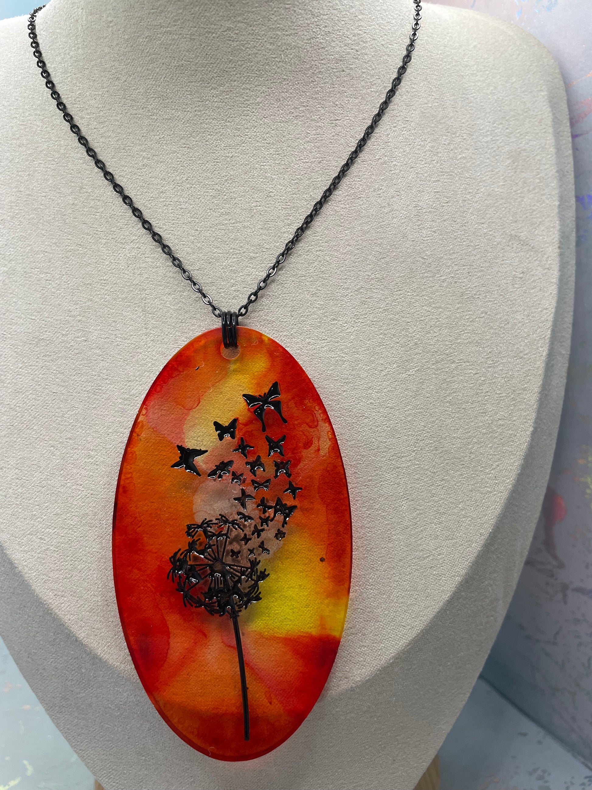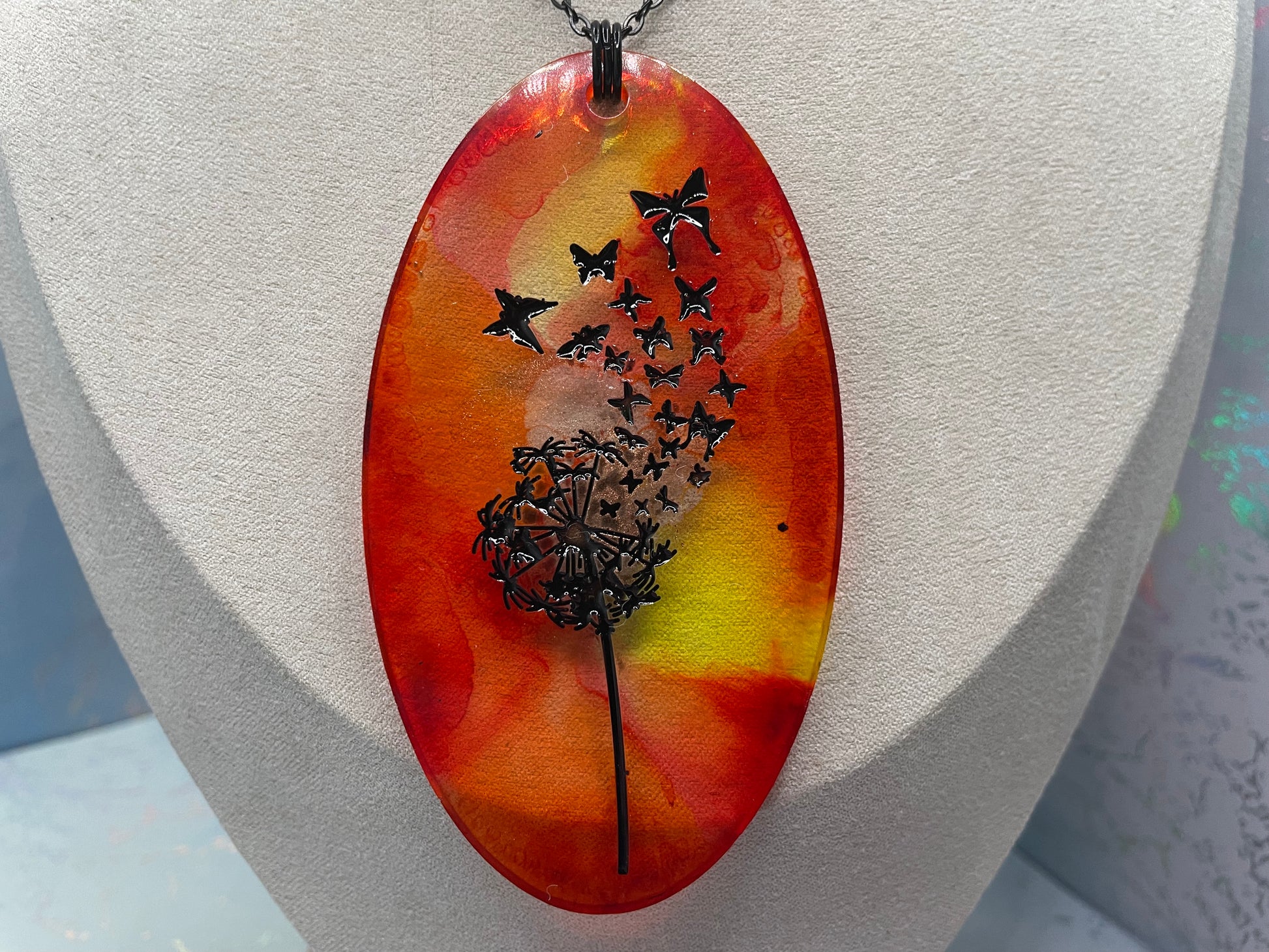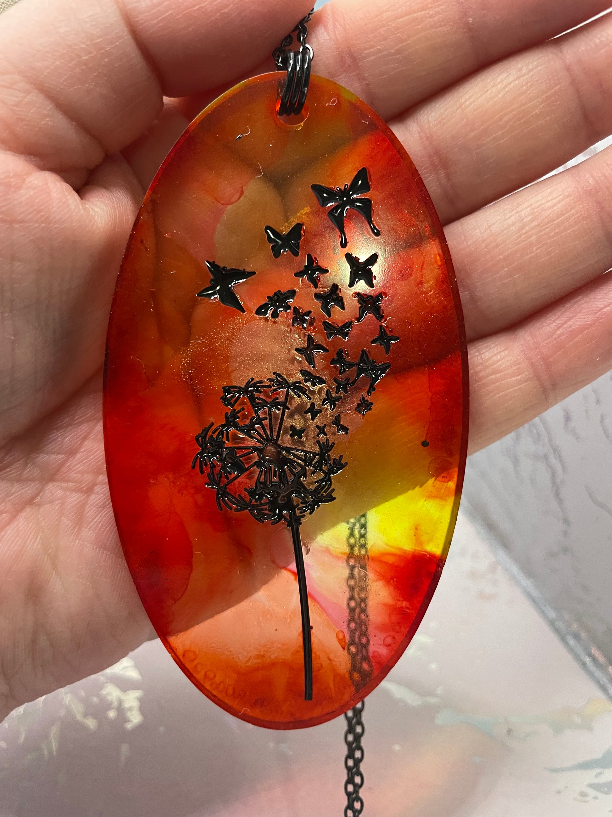 Ce pendentif ovale met en valeur un délicat motif de pissenlit, figé dans une résine brillante aux superbes dégradés de couleurs. Les détails noirs semblent flotter à l’intérieur du pendentif, créant un effet visuel léger et artistique. Chaque pièce est réalisée à la main à l’aide d’encre à alcool, ce qui rend chaque pendentif unique, avec ses propres variations de teintes et de motifs.