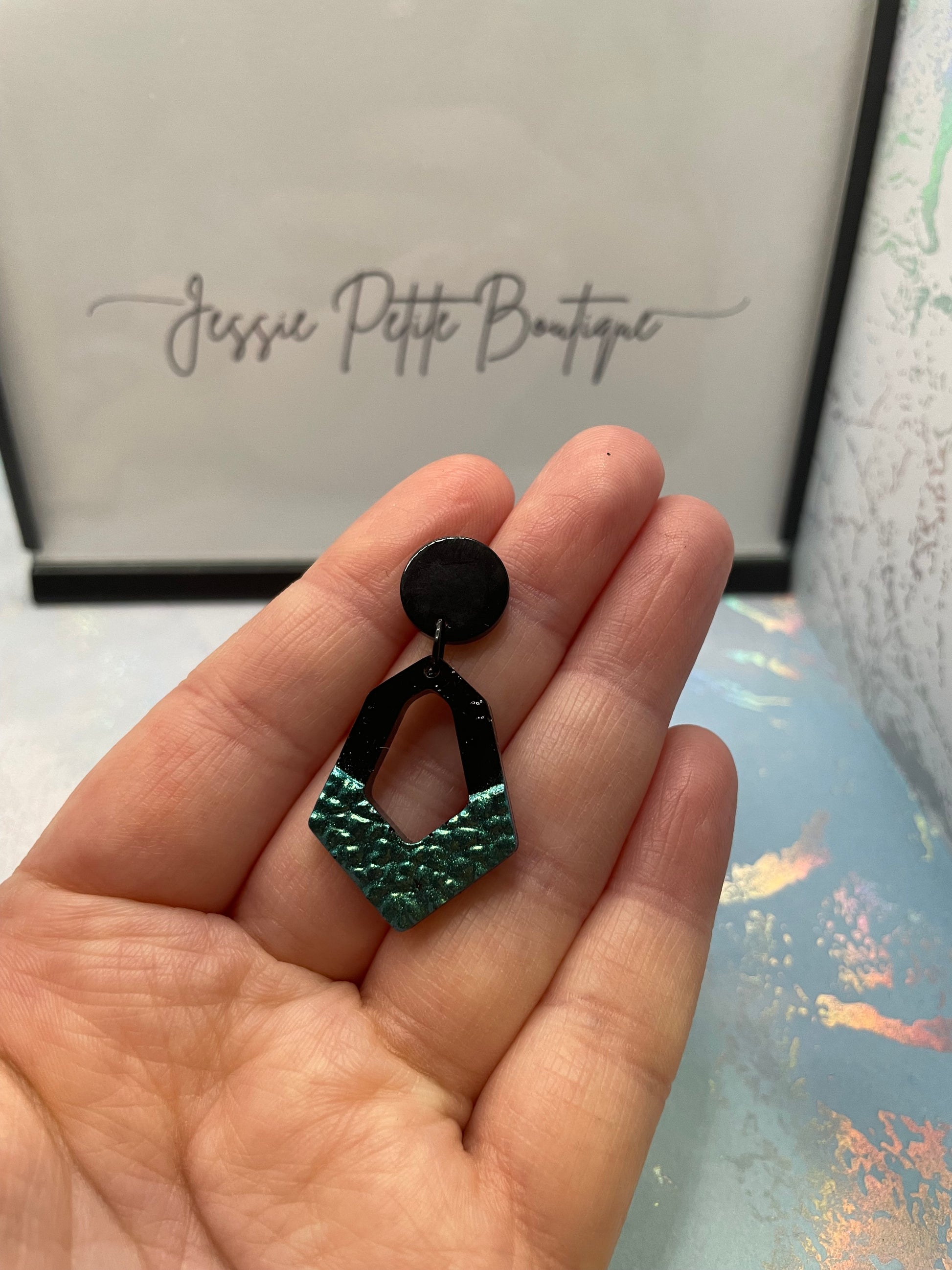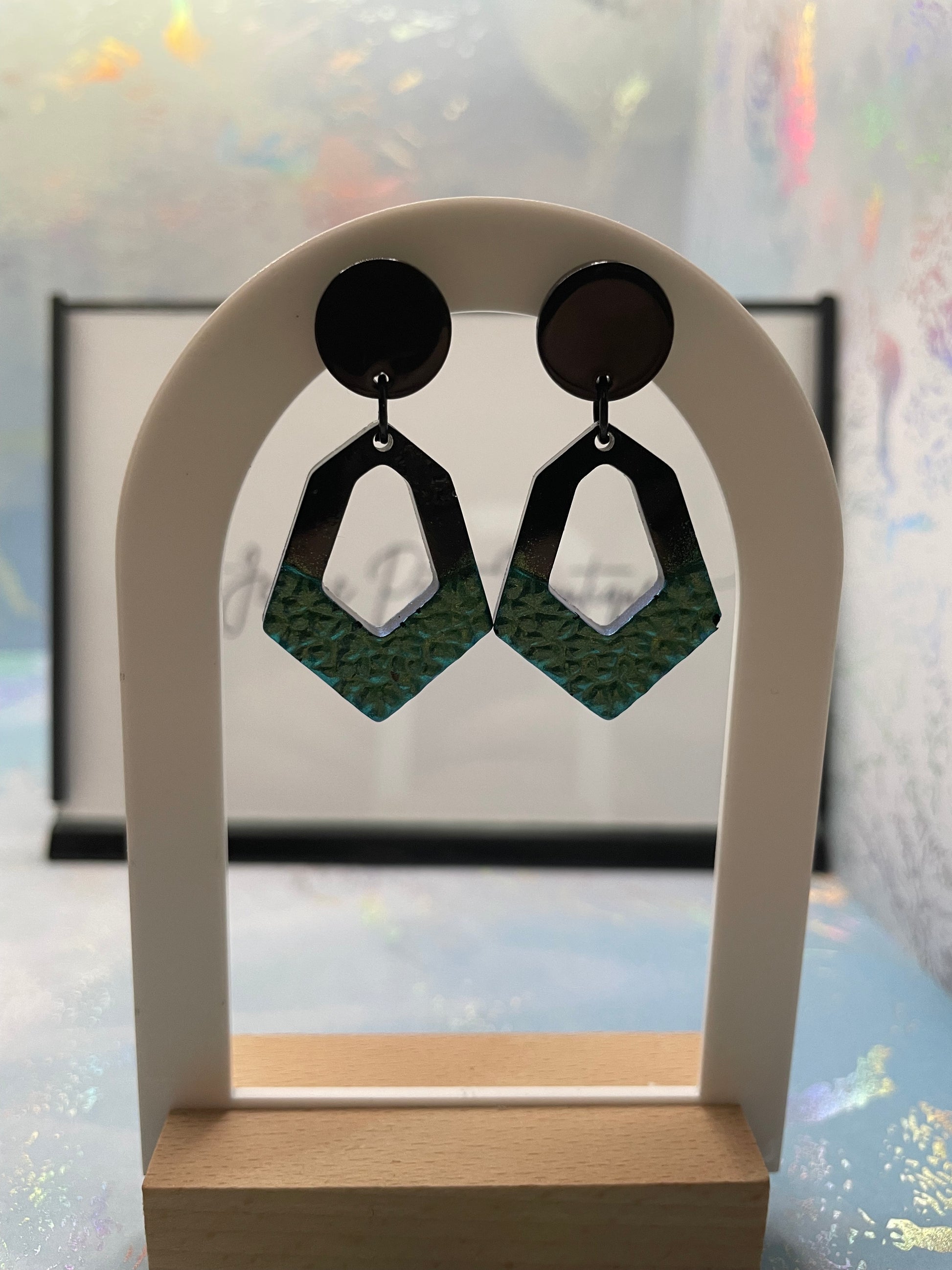 Ajoutez une touche de mystère à votre tenue avec ces boucles d'oreilles en forme d'hexaèdre , ornées d'une texture géode bleu caméléon unique. Leur dessus en résine noire contrastante avec leur reflet bleu éclatant et leur confèrent un look à la fois audacieux et élégant.