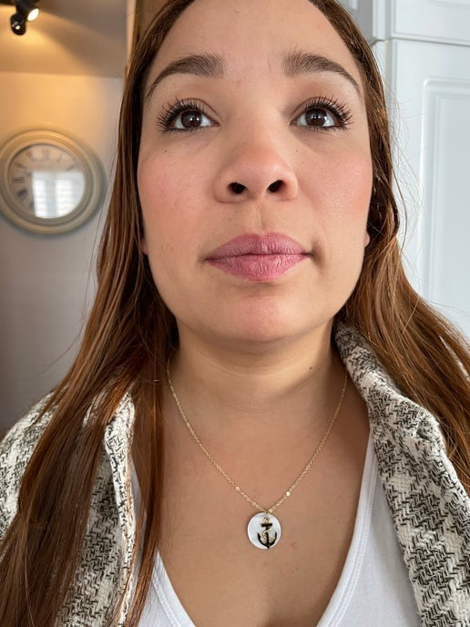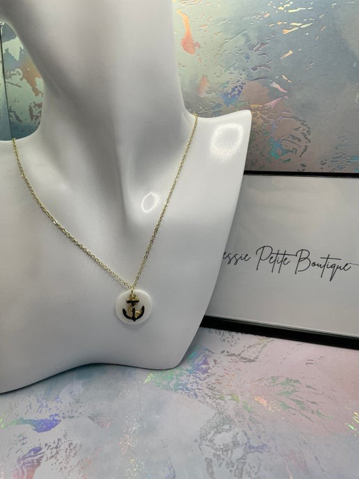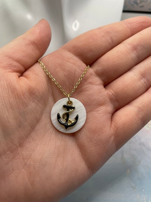 Ce collier plaqué or de 58 cm est orné d'un pendentif coquillage rond orné d'un motif d'ancre noir et or saisissant. L'ancre complexe repose sur un coquillage naturel scintillant, ajoutant une touche nautique à cette pièce élégante. La chaîne plaquée or et le fermoir mousqueton allient style et confort.