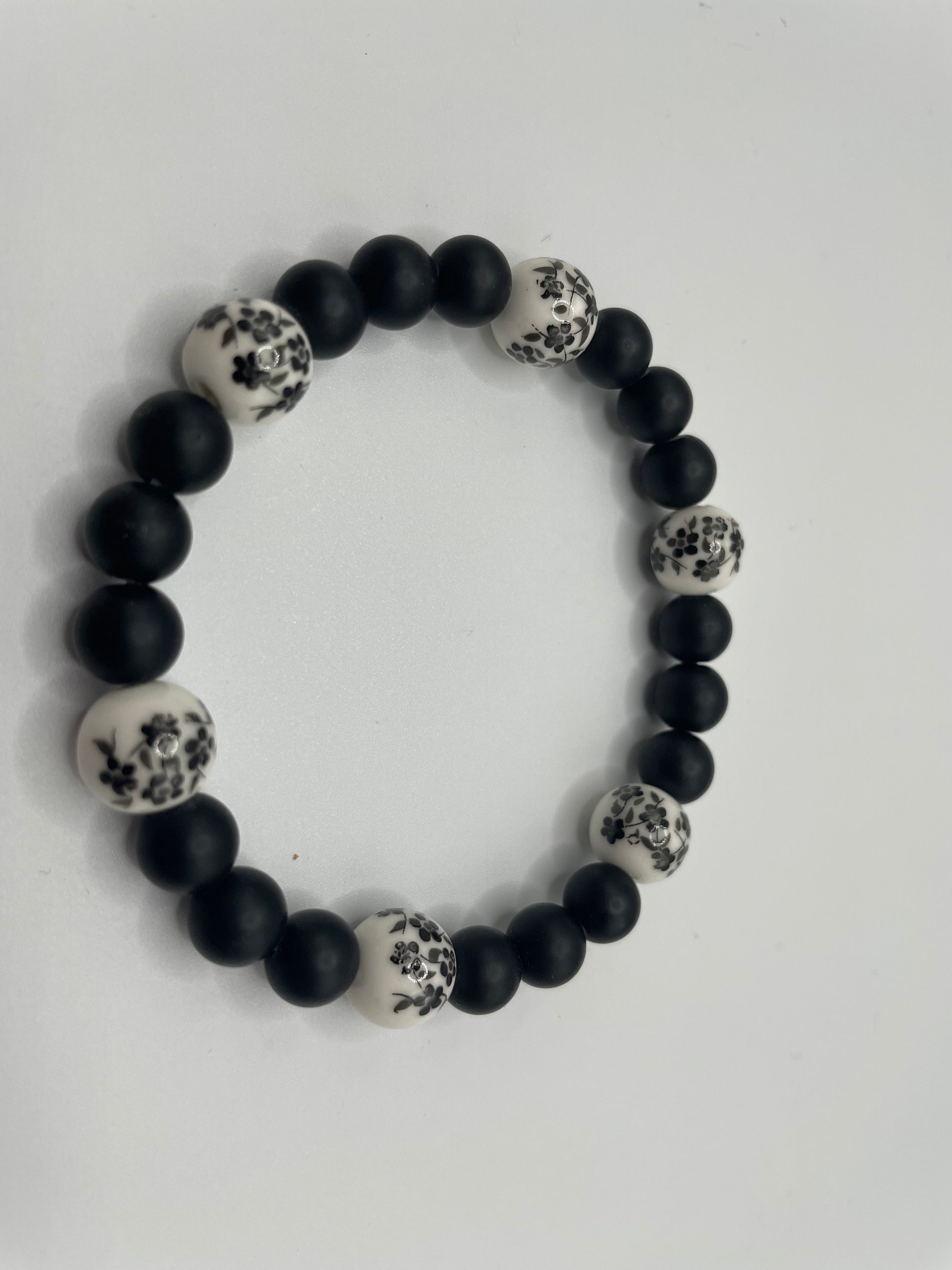 Élégant et intemporel, ce bracelet fait main marie des perles noires mates à des perles blanches brillantes décorées de motifs floraux. Les détails délicats et les accents de strass ajoutent une touche raffinée à ce design monochrome.