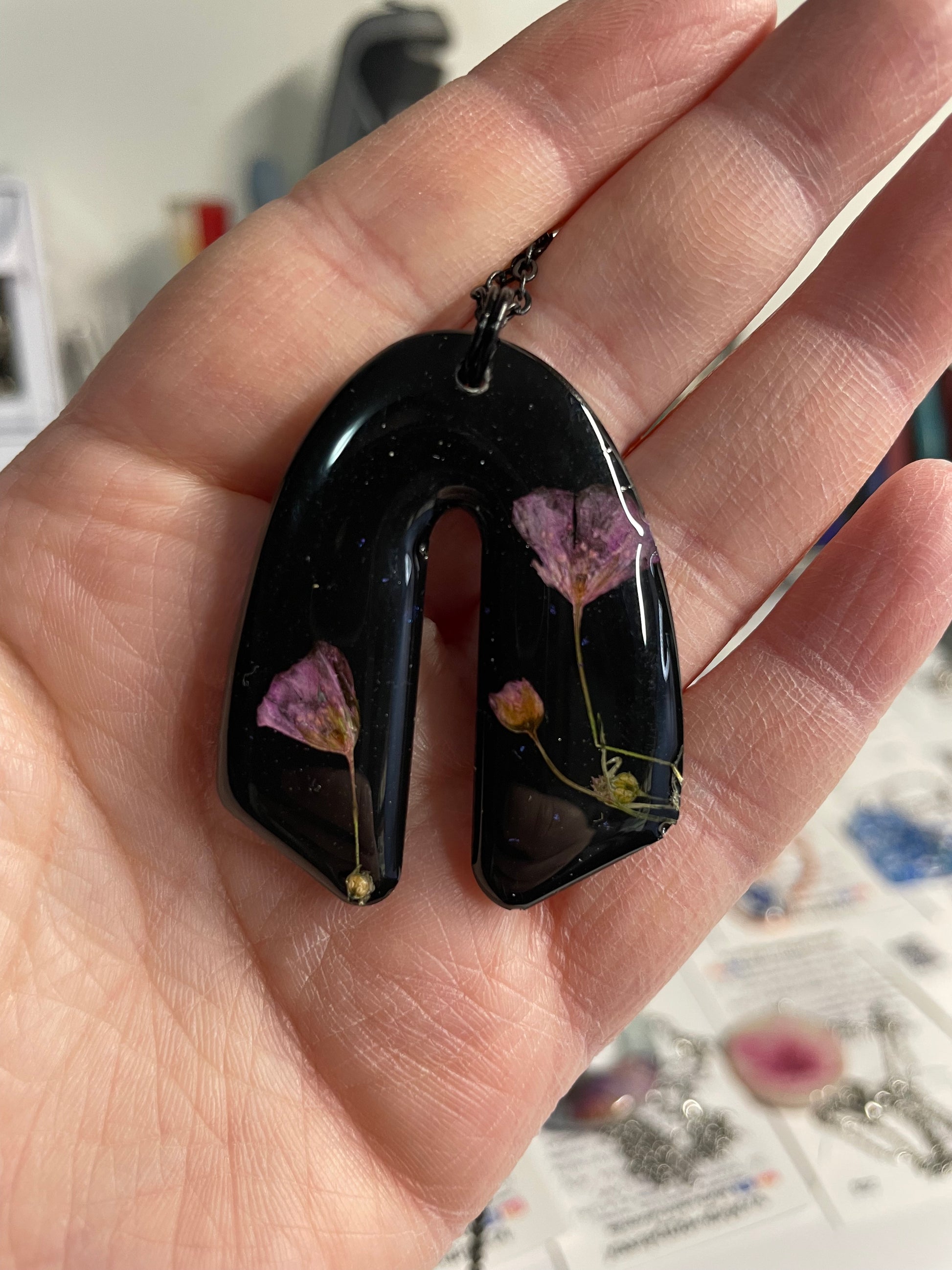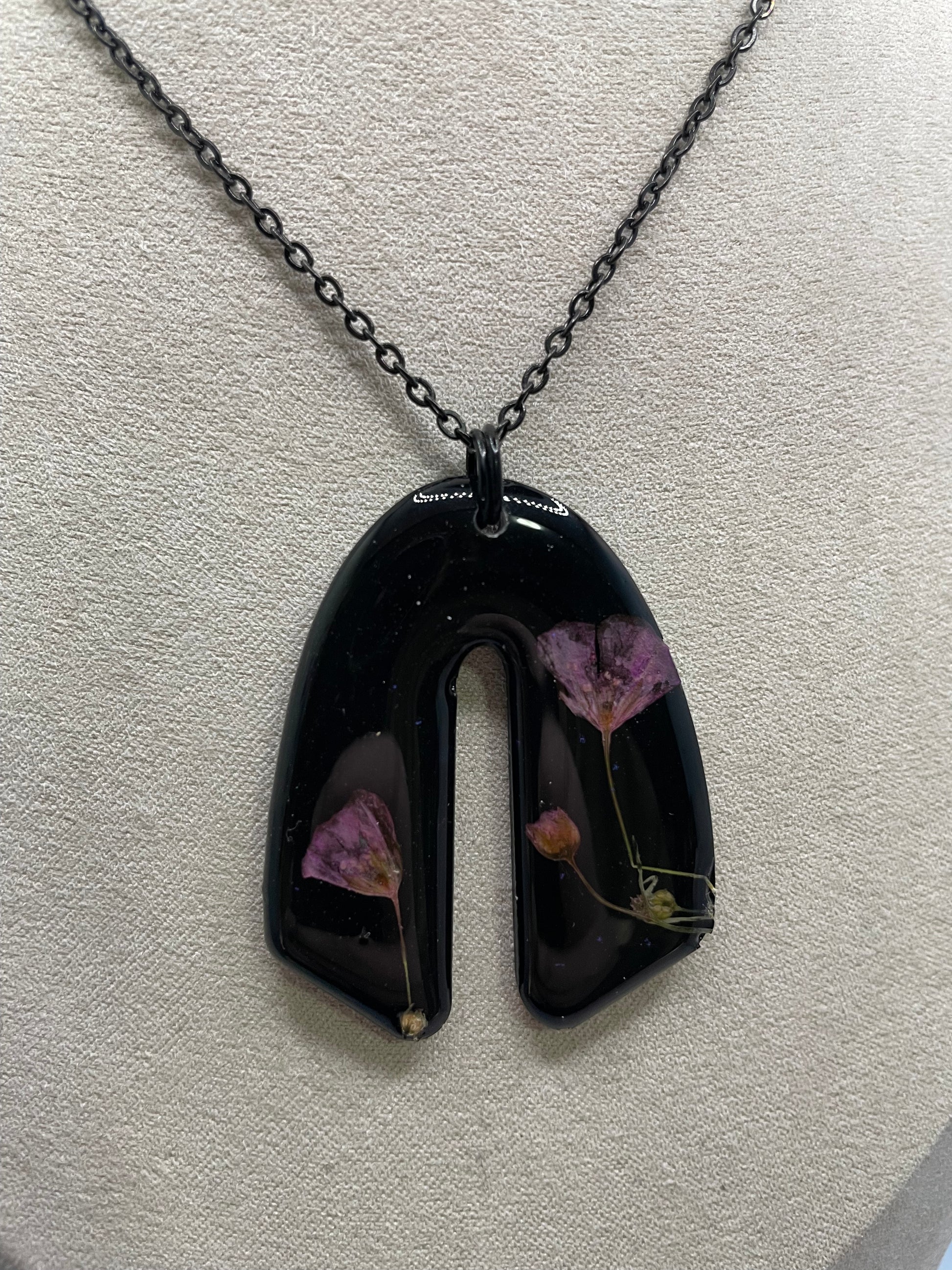 Ce collier artisanal présente un pendentif en forme d’arche aux lignes légèrement angulaires, offrant une silhouette moderne et organique à la fois. Sur un fond noir profond, de délicates fleurs séchées mauves sont soigneusement préservées dans la résine, avec une touche de poudre de mica pour apporter profondeur et subtilité.