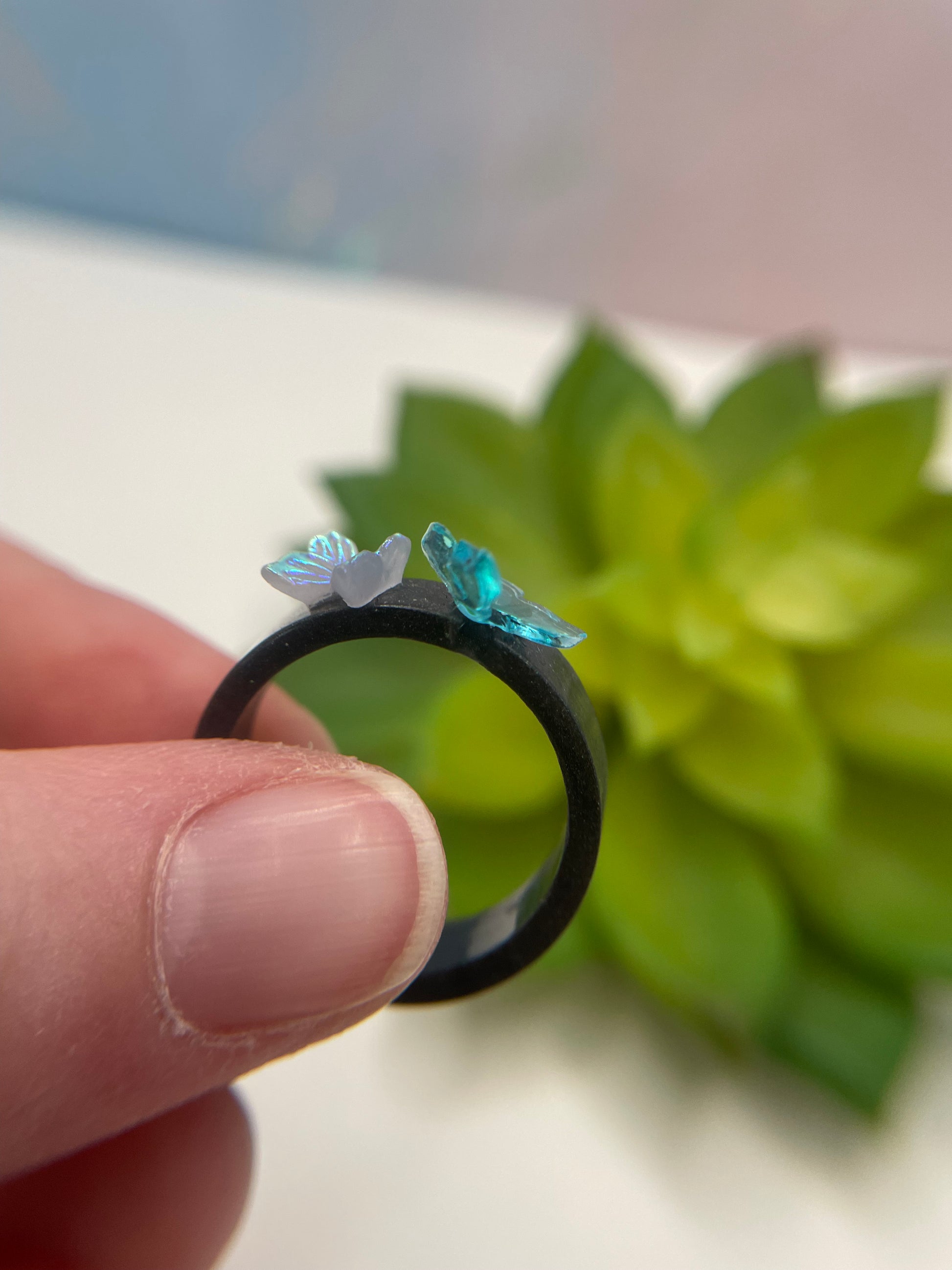 Cette bague délicate est composée d’un anneau en résine noire élégante, rehaussé de charmants détails en forme de papillons. Fabriquée en résine avec l’ajout de poudre de mica, elle capte subtilement la lumière tout en restant légère et agréable à porter.
