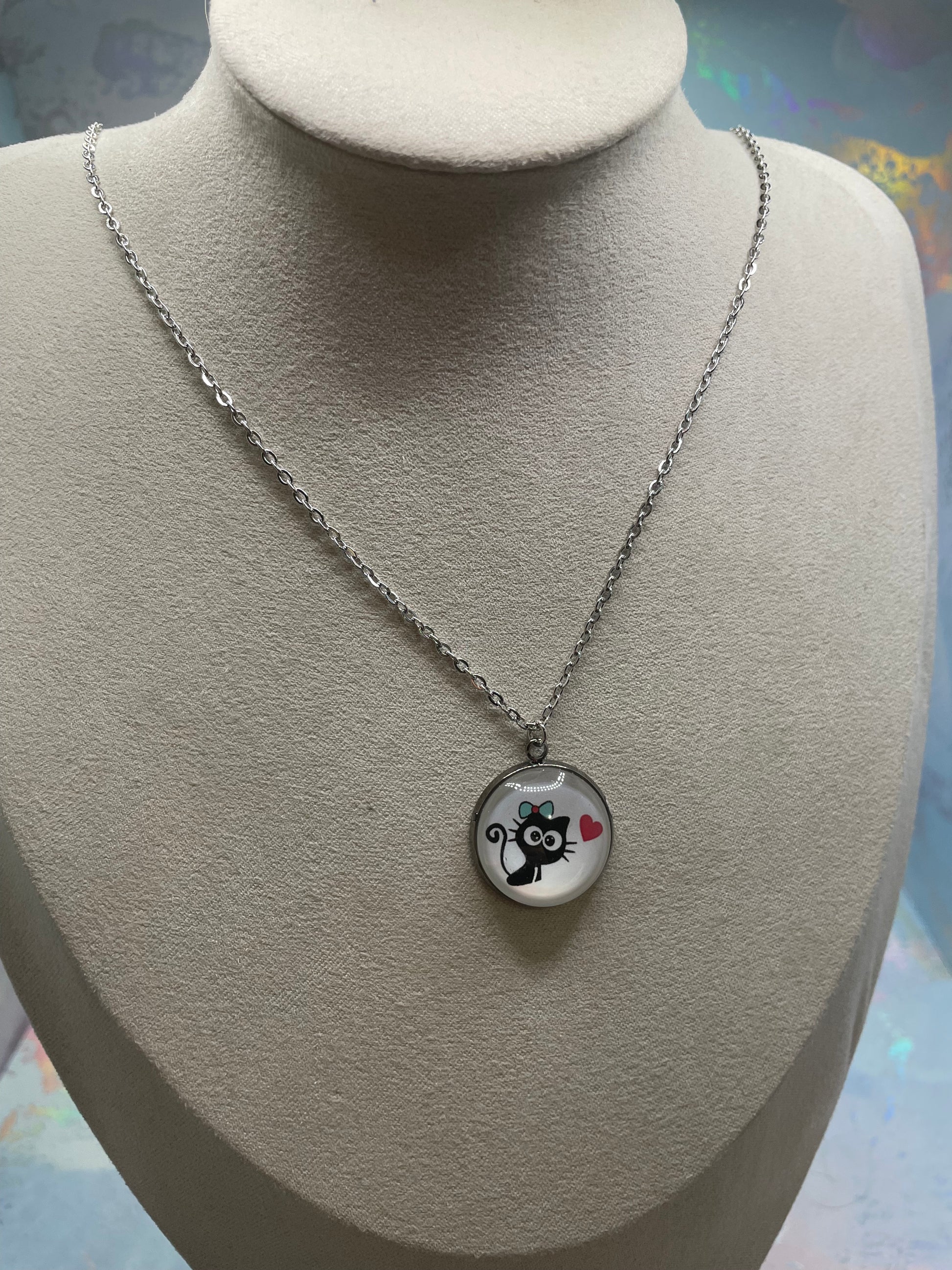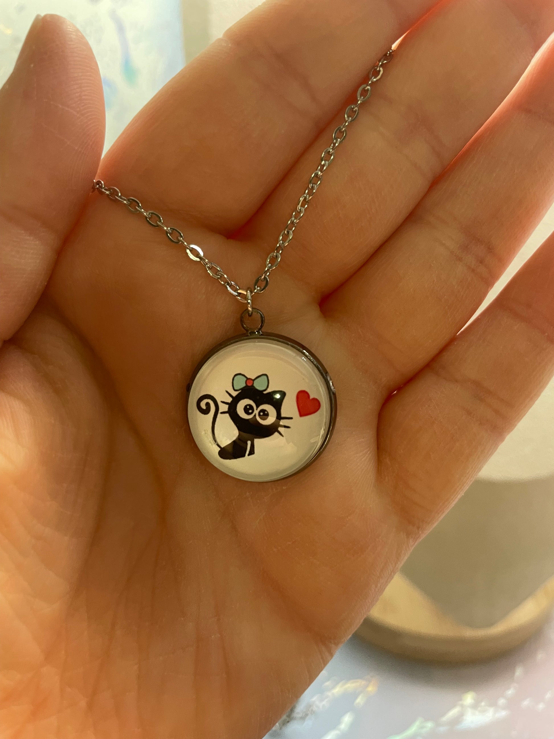 Ce collier à pendentif rond met en vedette un adorable chat noir aux grands yeux, illustré sur un fond blanc lumineux, accompagné d’un petit cœur rouge et d’un nœud délicatement coloré. Le cabochon en verre, serti dans un contour argenté, offre une finition brillante et soignée à cette création pleine de douceur.