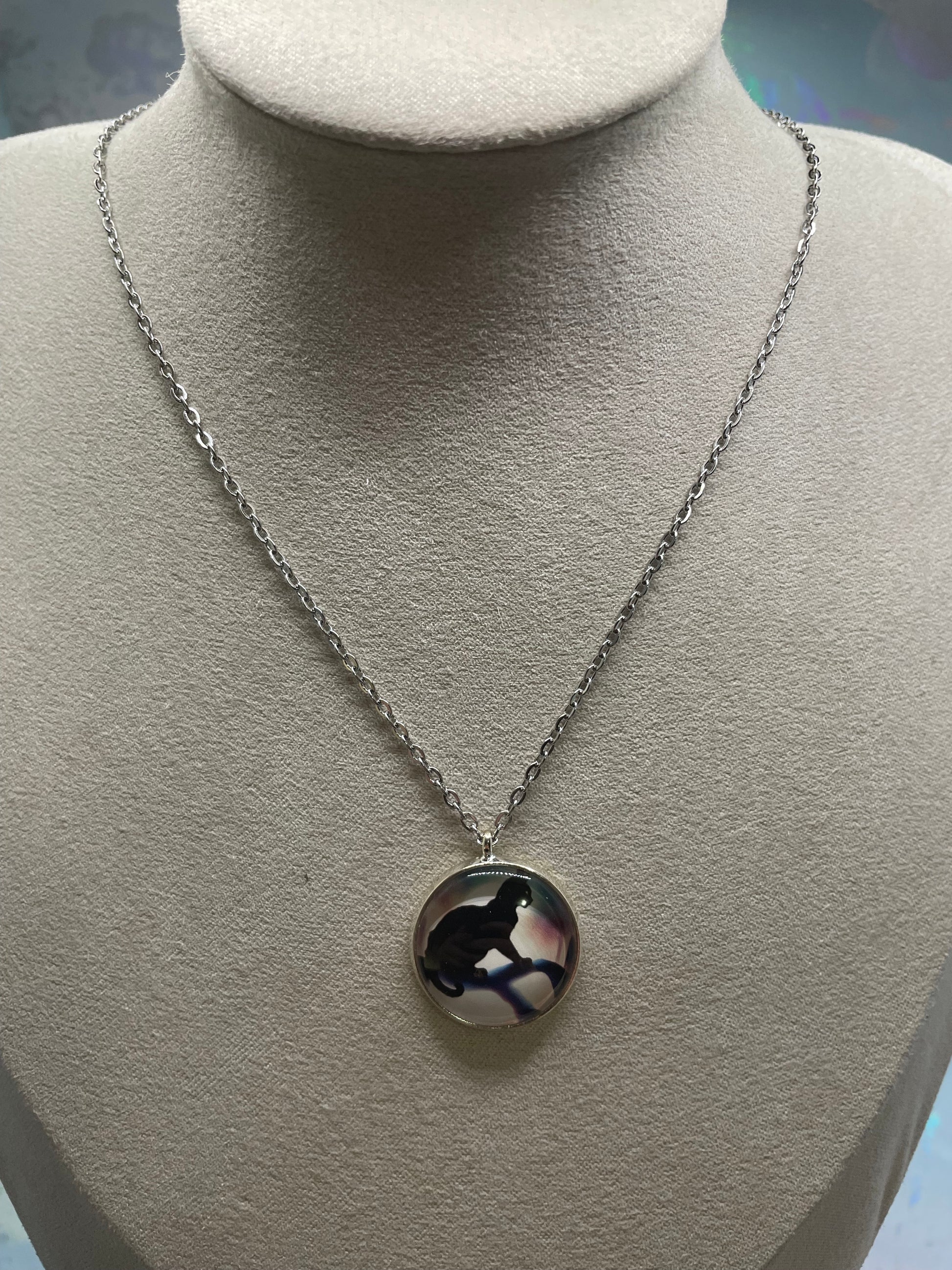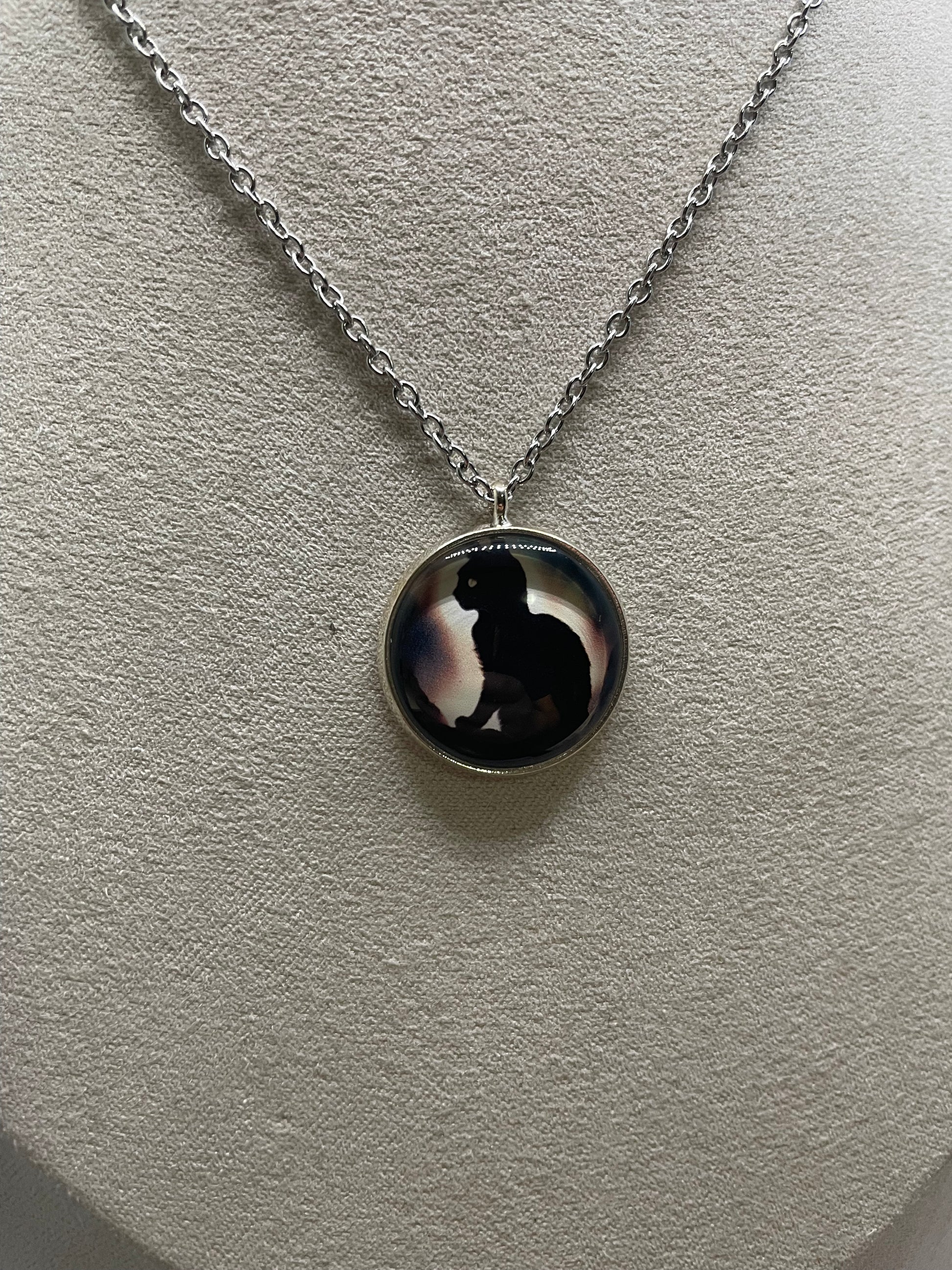 Ce collier délicat met en valeur une silhouette de chat noir dans une scène douce et évocatrice. L’illustration est protégée par un cabochon en verre lisse et encadrée d’un serti rond argenté, offrant un style à la fois élégant et mystérieux.