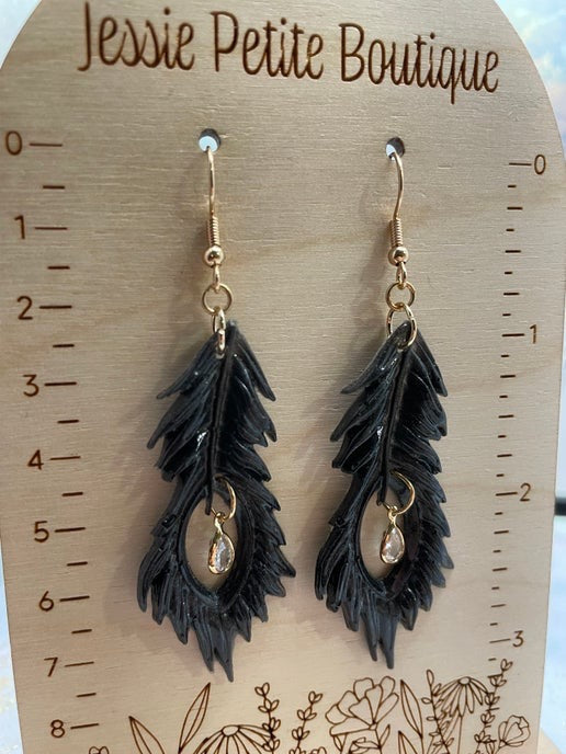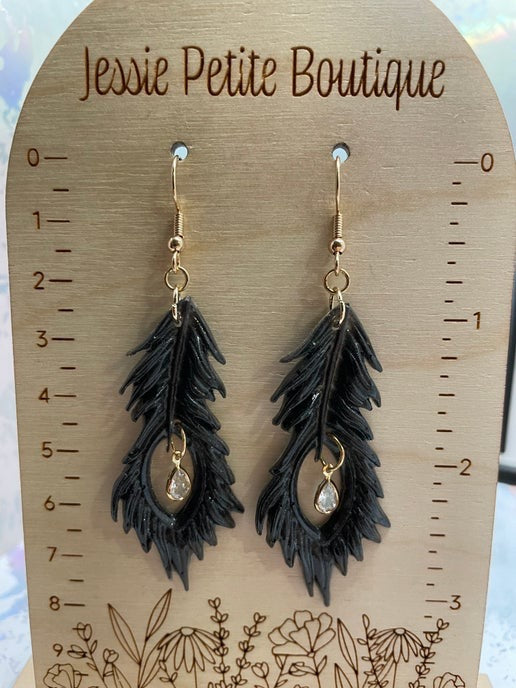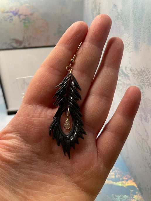 Description : Ces boucles d'oreilles arborent un superbe motif de plumes, réalisé en résine et en poudre de mica pour un aspect lisse et raffiné. La plume noire est ornée de touches dorées et de zircones scintillantes, apportant une touche de glamour et de sophistication.