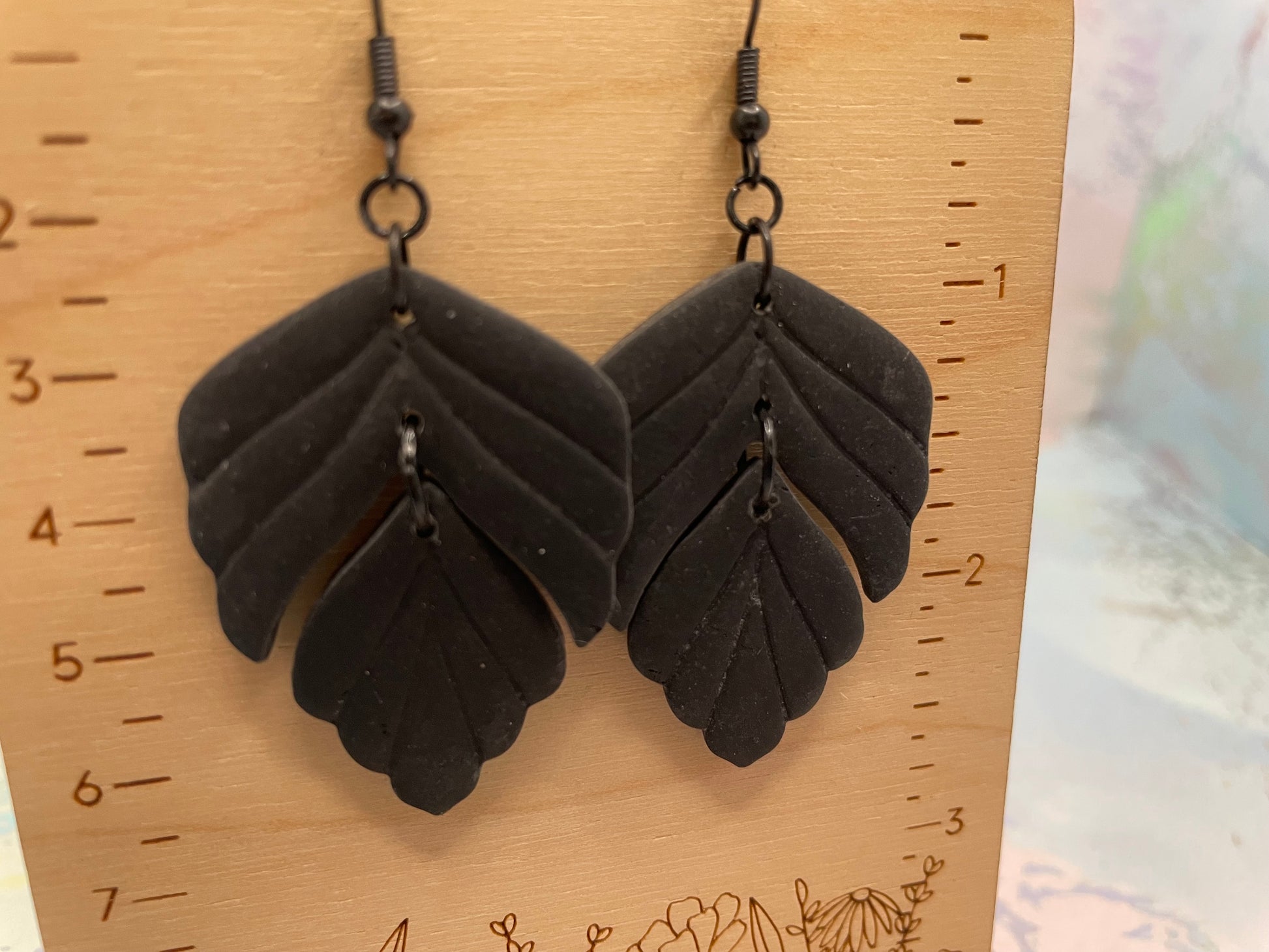 Ces boucles d’oreilles artisanales présentent une silhouette de queue de poisson audacieuse, composée de formes superposées qui apportent profondeur et mouvement. Réalisées en argile polymère noire au fini mat, elles sont légères tout en offrant une belle présence. Montées sur des crochets sans nickel, elles sont confortables à porter au quotidien et ajoutent une touche moderne et affirmée à votre tenue.