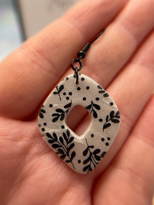 Description : Ces boucles d'oreilles présentent une forme de losange magnifiquement détaillée, réalisée en argile polymère et ornée d'un délicat motif floral noir. Le fond blanc offre un contraste saisissant, tandis que la finition en résine apporte une touche raffinée.