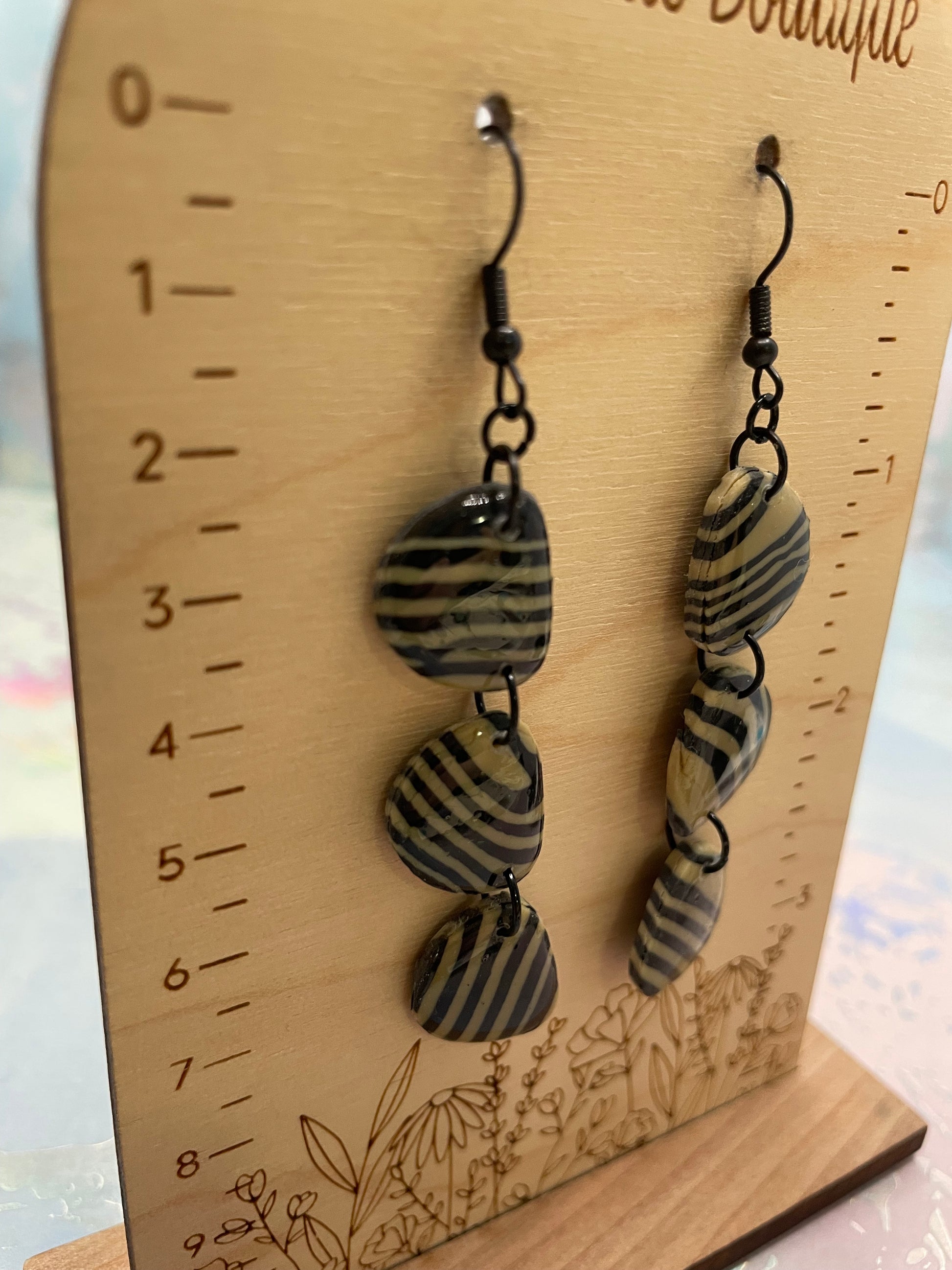 Ces boucles d’oreilles artisanales présentent un motif rayé noir et moutarde, associé à des formes organiques inspirées de galets. Les éléments empilés créent une belle longueur et un mouvement naturel, tout en restant légers et agréables à porter.