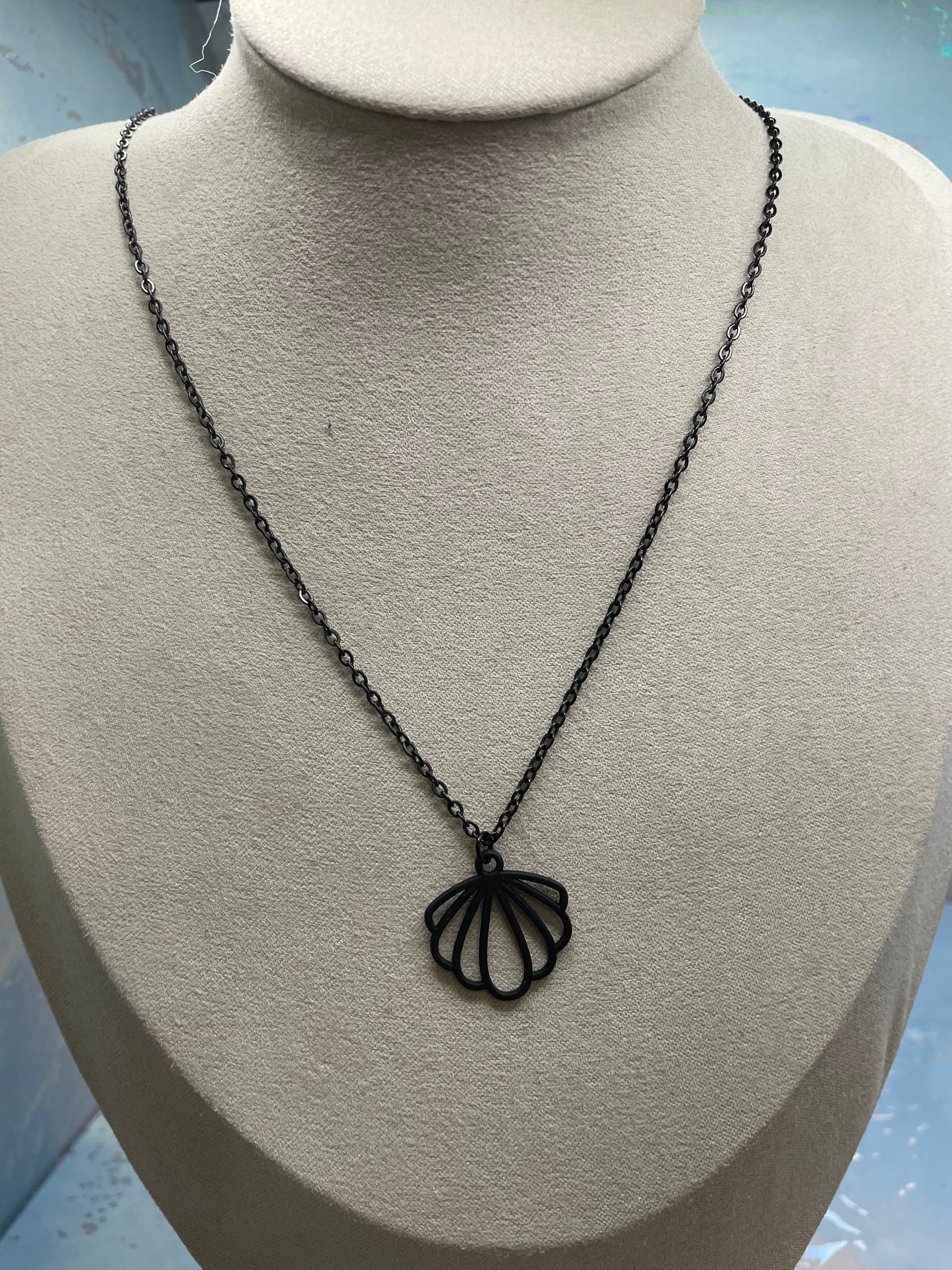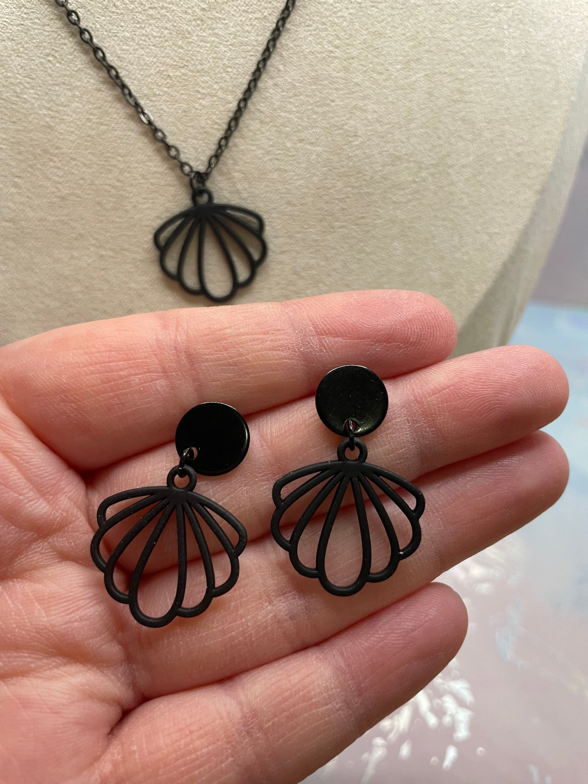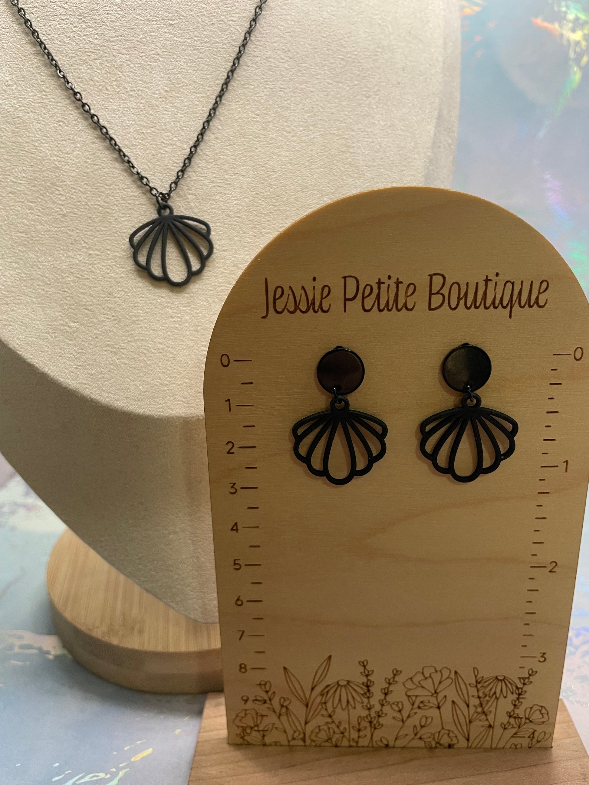 Cet ensemble épuré met en valeur un motif de coquillage au fini noir mat. La silhouette ajourée apporte légèreté et modernité, tandis que la teinte monochrome offre une élégance discrète et affirmée. Un ensemble facile à porter, parfait autant pour le quotidien que pour une tenue plus soignée.