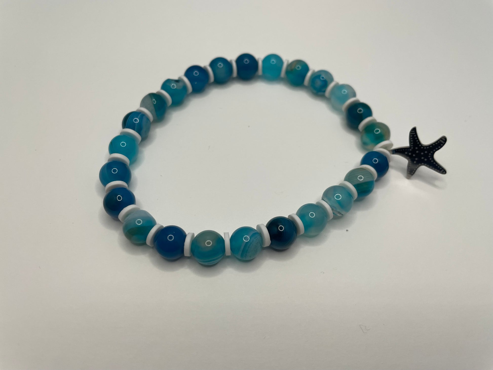 Inspiré par l’océan, ce bracelet en billes bleues associe différentes nuances de bleu et de turquoise pour un effet frais et apaisant. Les billes rondes de 0,7 cm sont ponctuées de petites billes blanches en argile polymère (0,5 cm), apportant contraste et légèreté au design. Le tout est sublimé par une breloque étoile de mer en acier inoxydable, pour une touche marine élégante.