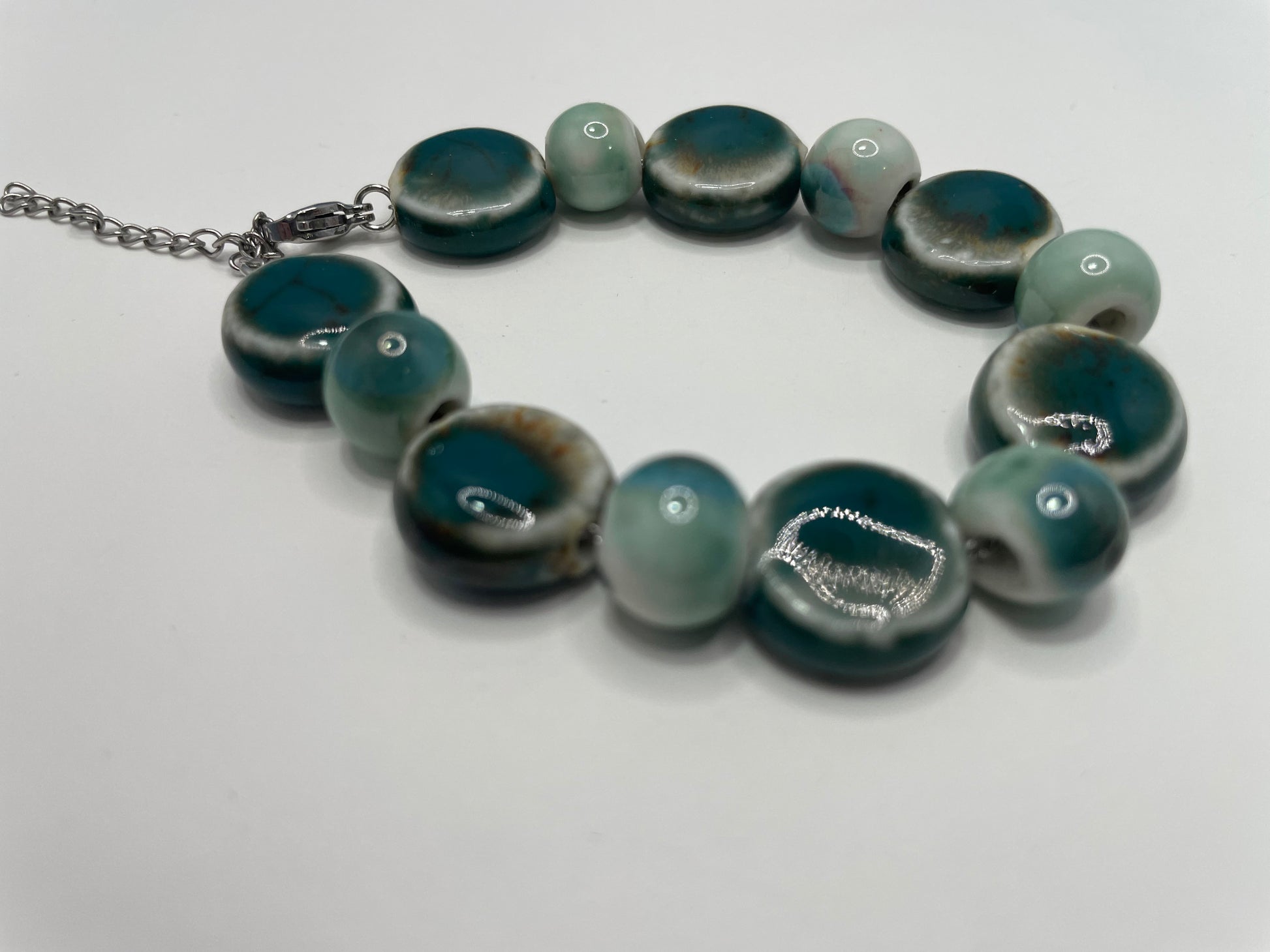 Ce bracelet artisanal est composé d’un mélange harmonieux de billes en céramique et de billes rondes lisses, offrant un bel équilibre entre textures et nuances. Les billes en céramique présentent des variations naturelles de couleurs, mêlant des tons vert sarcelle, vert doux et des accents terreux, ce qui rend chaque bracelet unique.