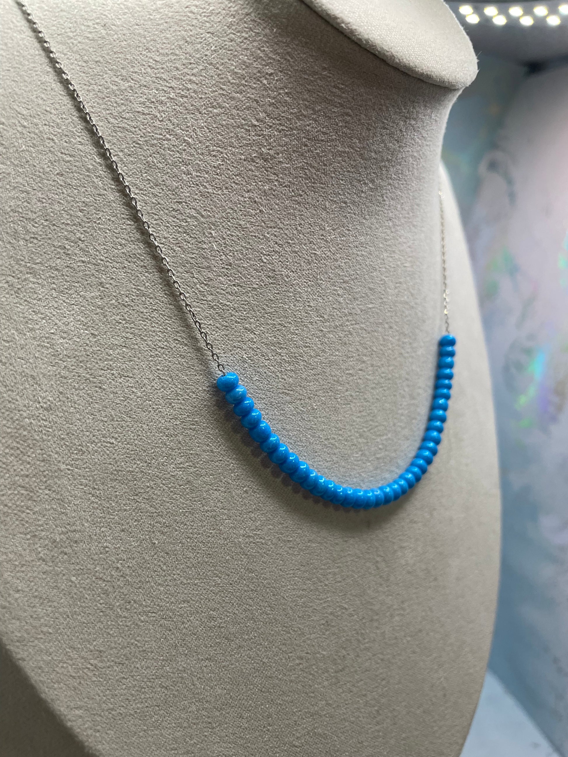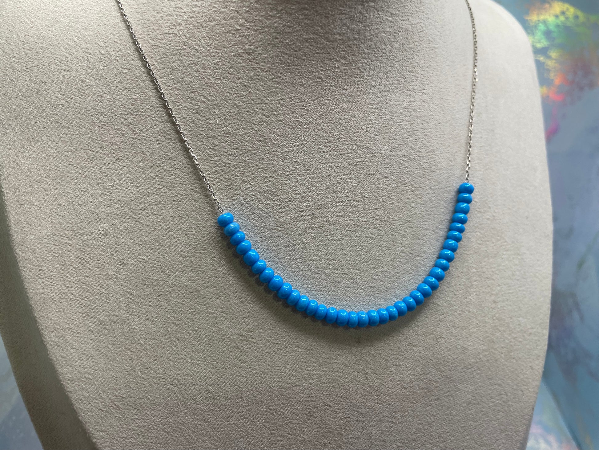 Ce collier minimaliste met en valeur une rangée harmonieuse de billes tchèques bleues, disposées en une douce courbe au centre du cou. Leur teinte bleue vibrante apporte une touche de couleur fraîche tout en conservant une allure élégante et facile à porter.