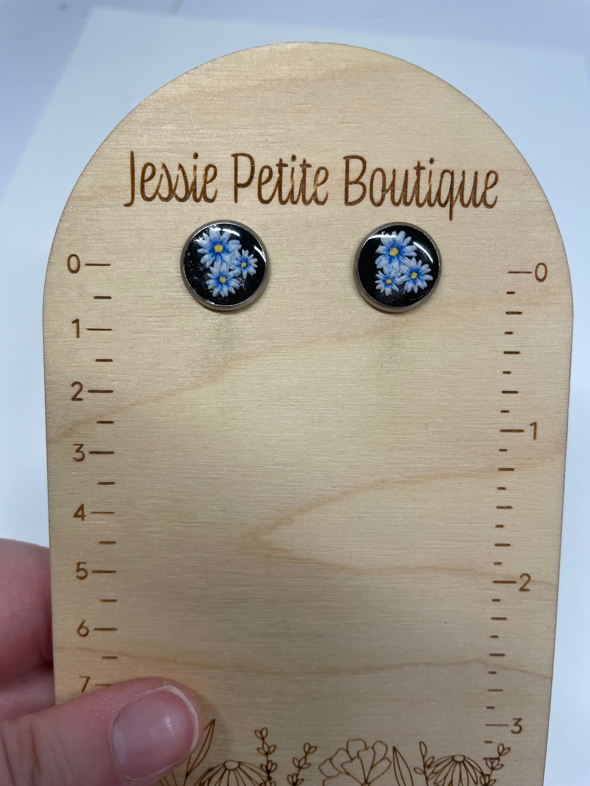 Ces boutons d’oreille floraux bleus présentent un délicat regroupement de petites fleurs bleues au cœur jaune, sur un fond noir profond. Le motif est scellé dans une résine lisse et brillante, rehaussée d’une légère touche de poudre de mica qui apporte profondeur et contraste.
