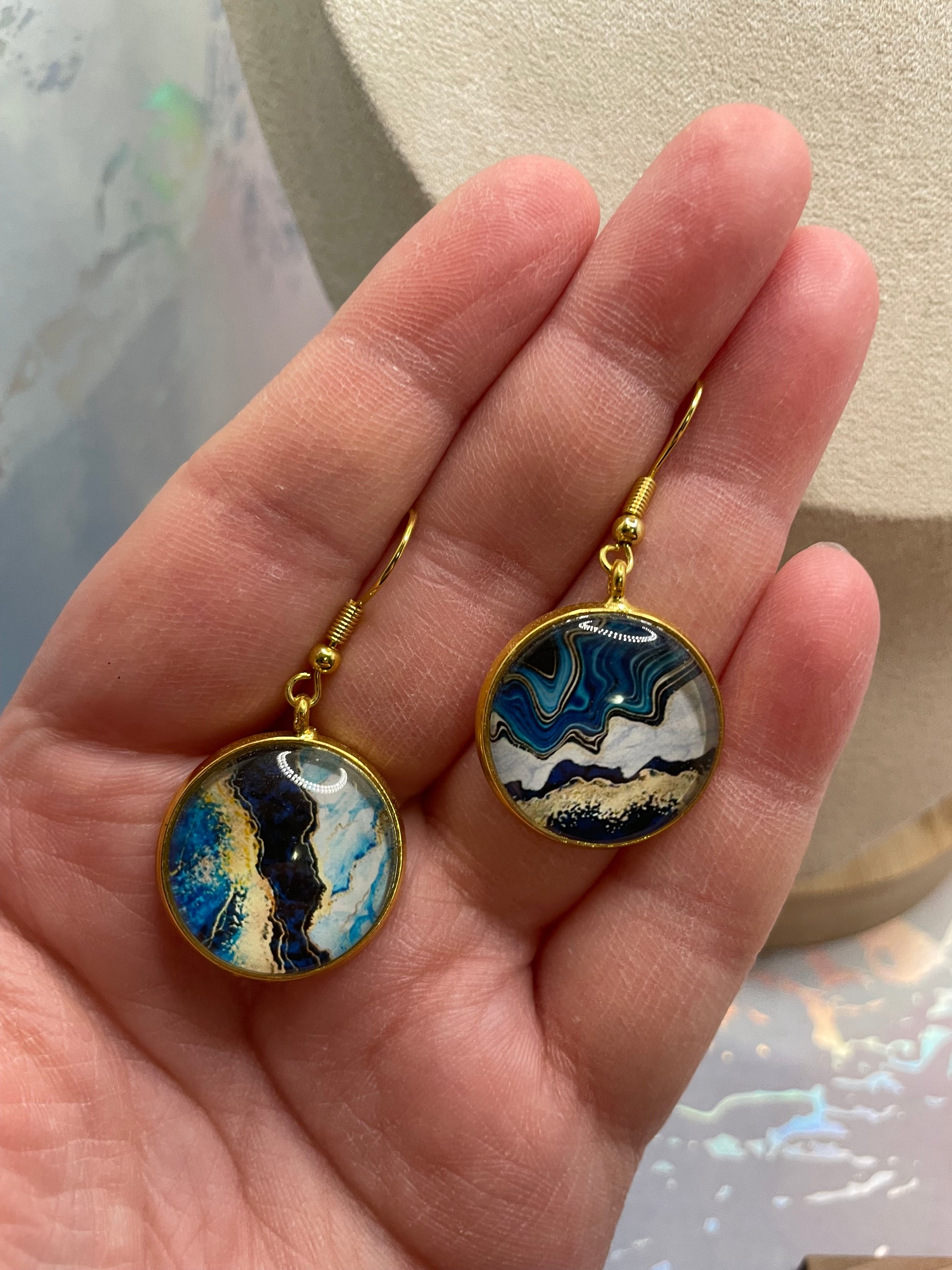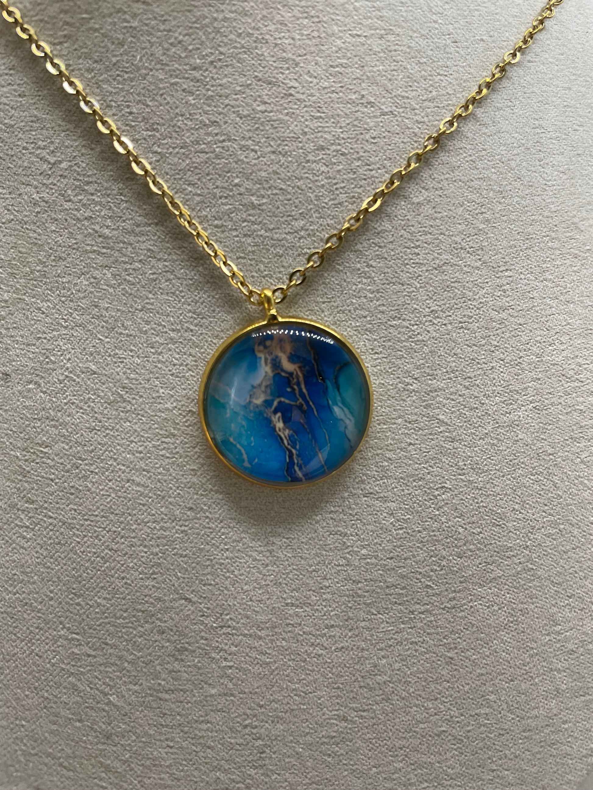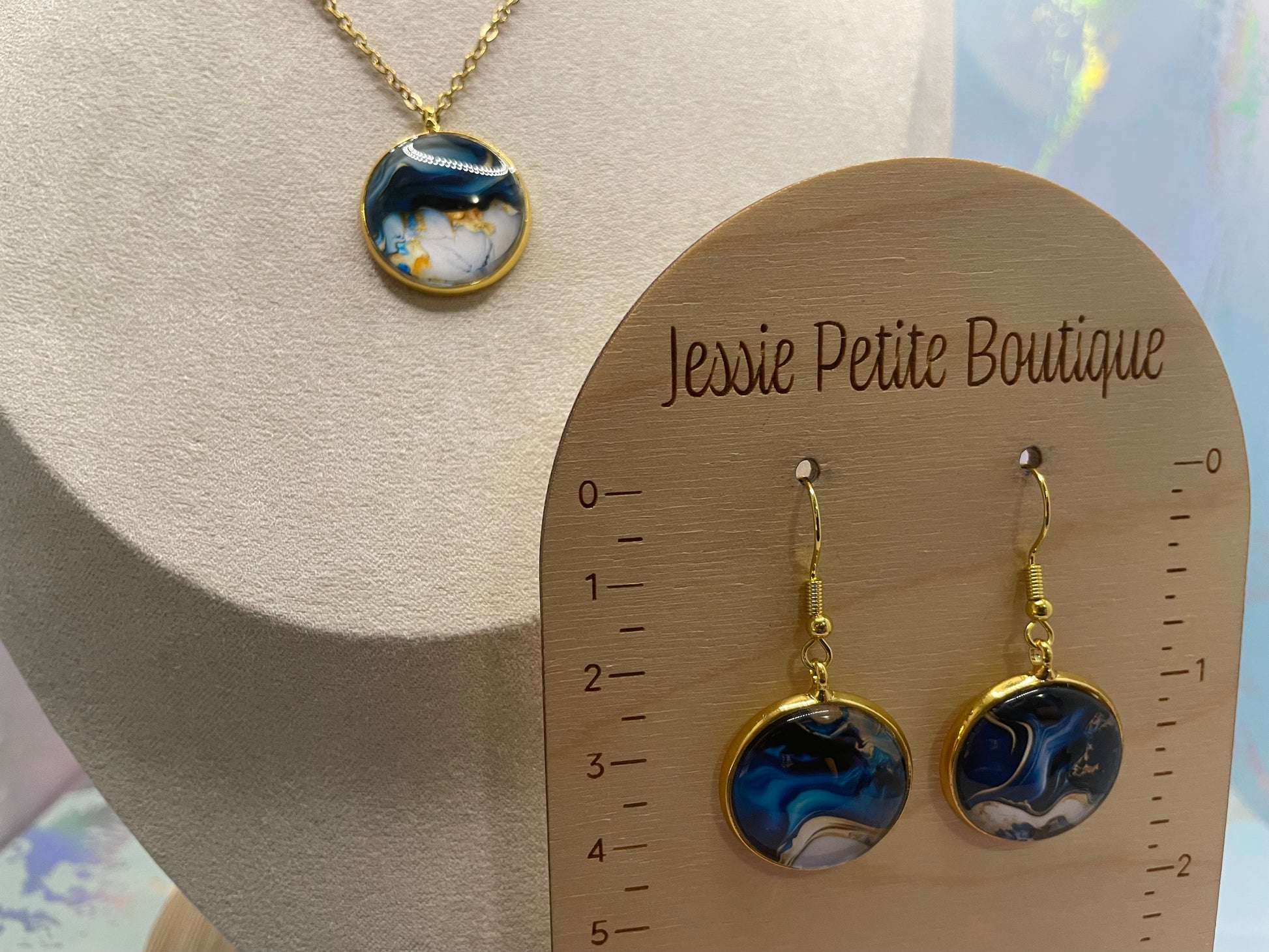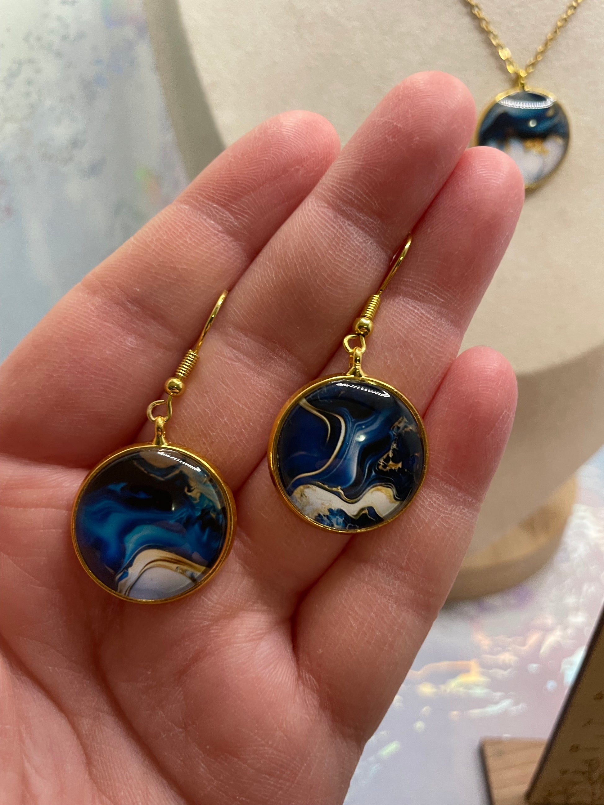 Inspiré par les nuances profondes de l’océan et les mouvements naturels du marbre, cet ensemble de bijoux fait à la main met en valeur un délicat cabochon rond au motif marbré bleu. Chaque pièce est unique, avec ses propres variations de couleurs et de motifs, pour un rendu à la fois raffiné et intemporel.