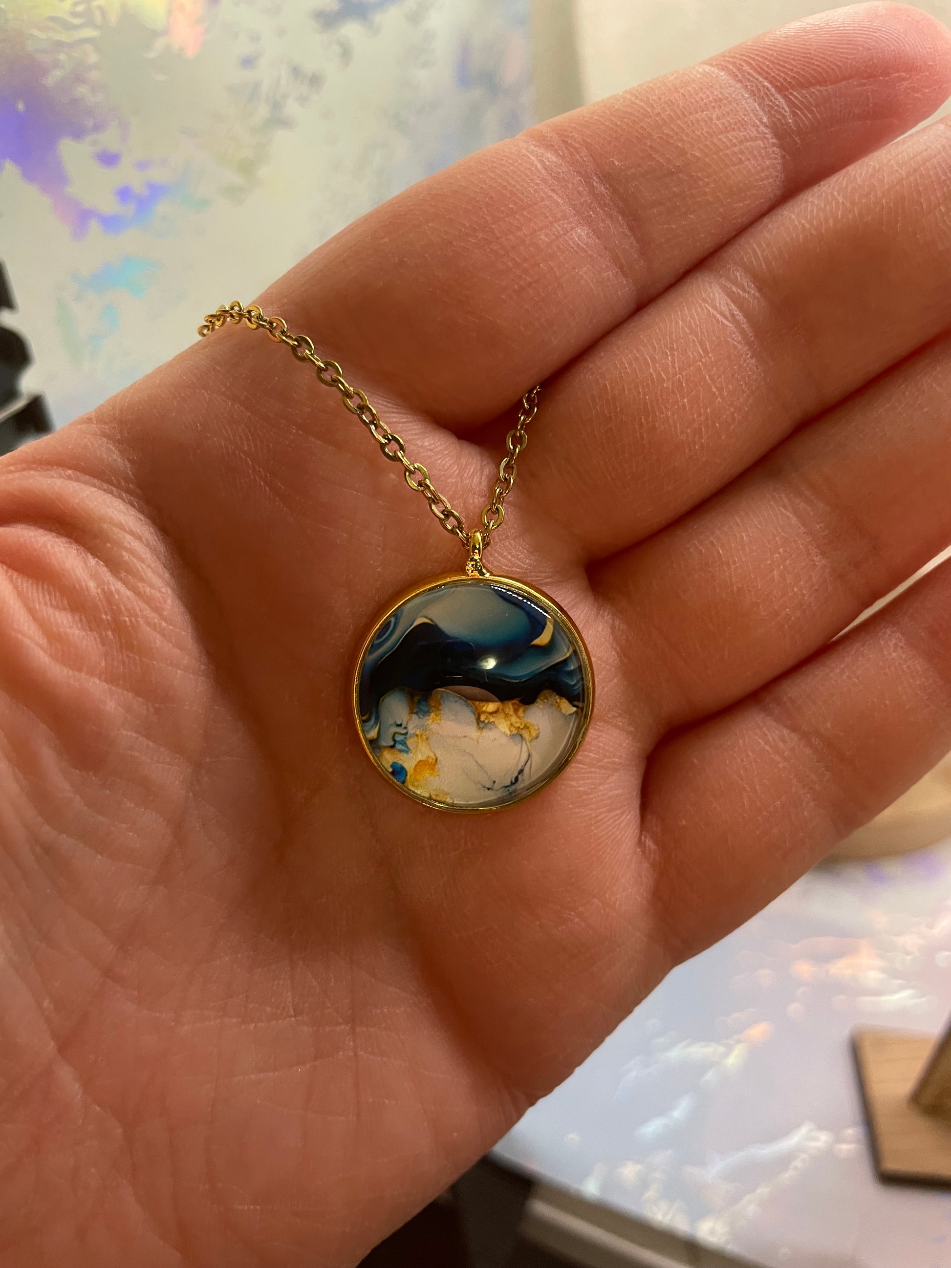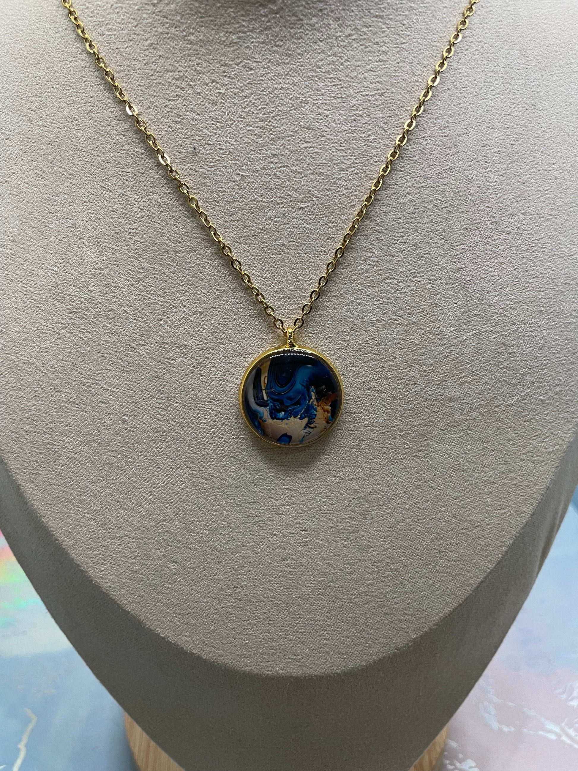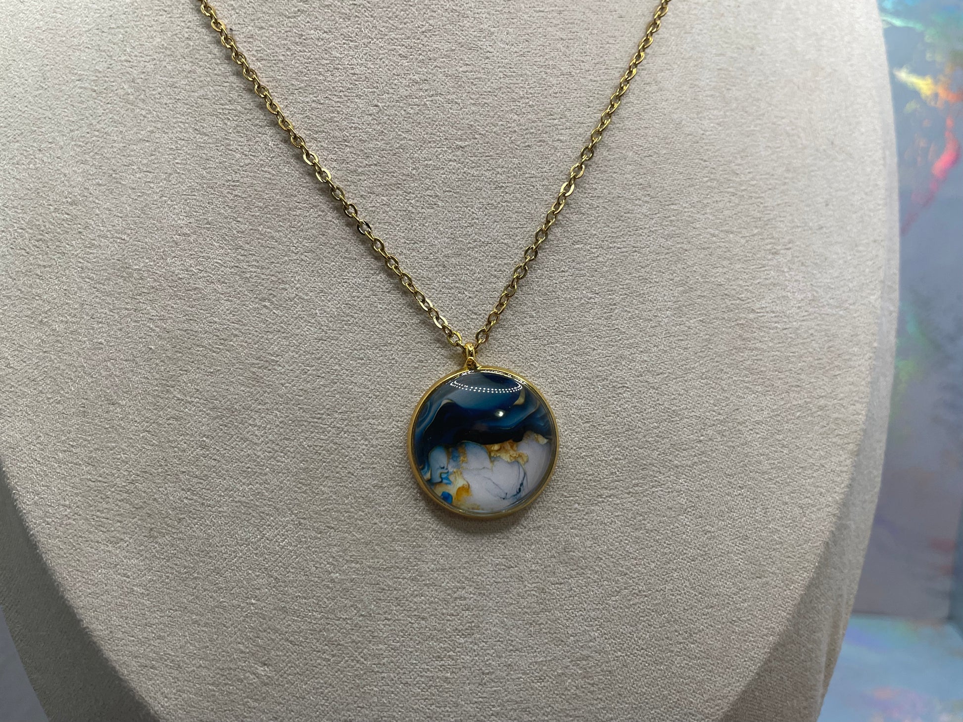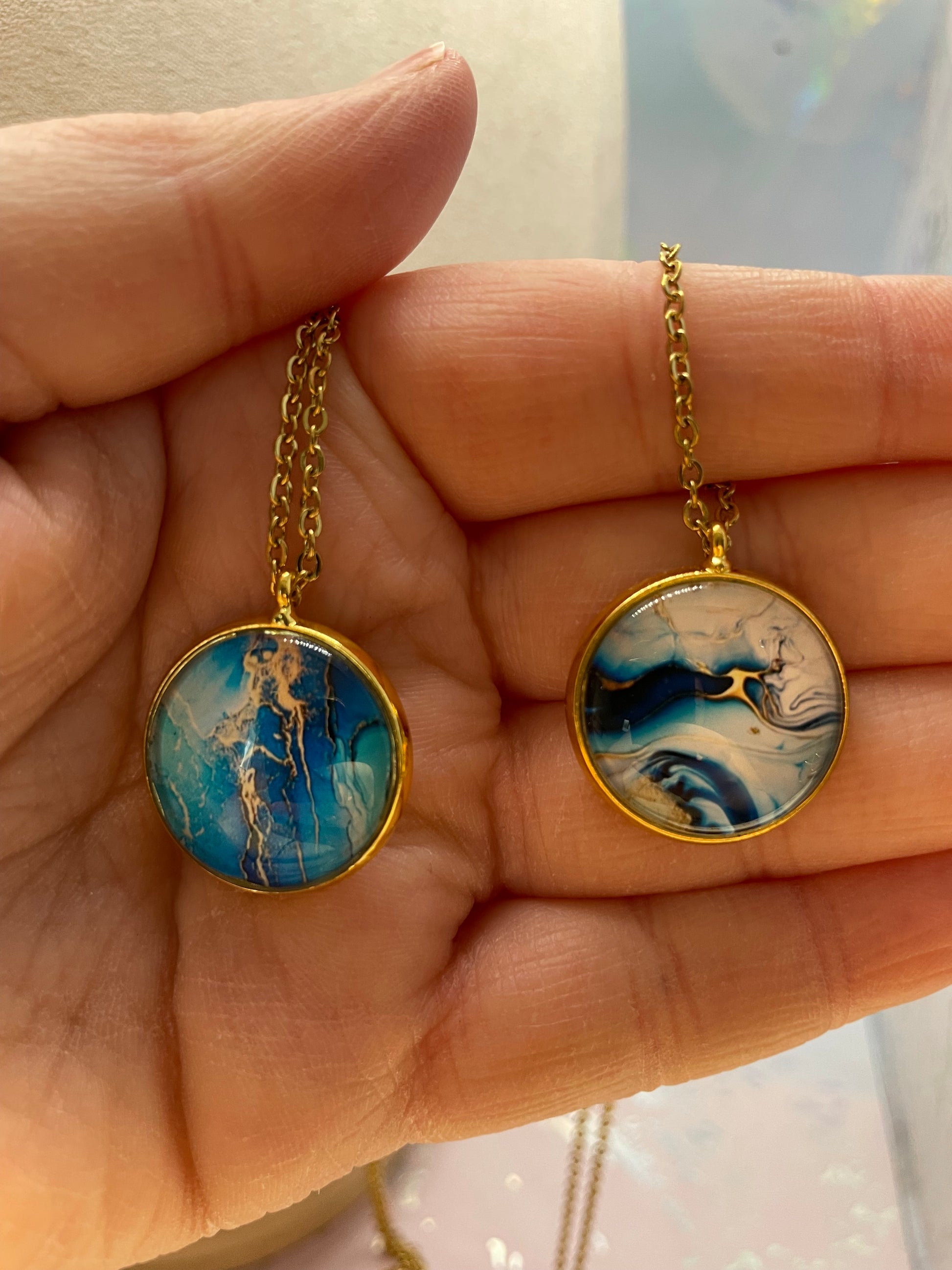 Inspiré par les nuances profondes de l’océan et les mouvements naturels du marbre, cet ensemble de bijoux fait à la main met en valeur un délicat cabochon rond au motif marbré bleu. Chaque pièce est unique, avec ses propres variations de couleurs et de motifs, pour un rendu à la fois raffiné et intemporel.
