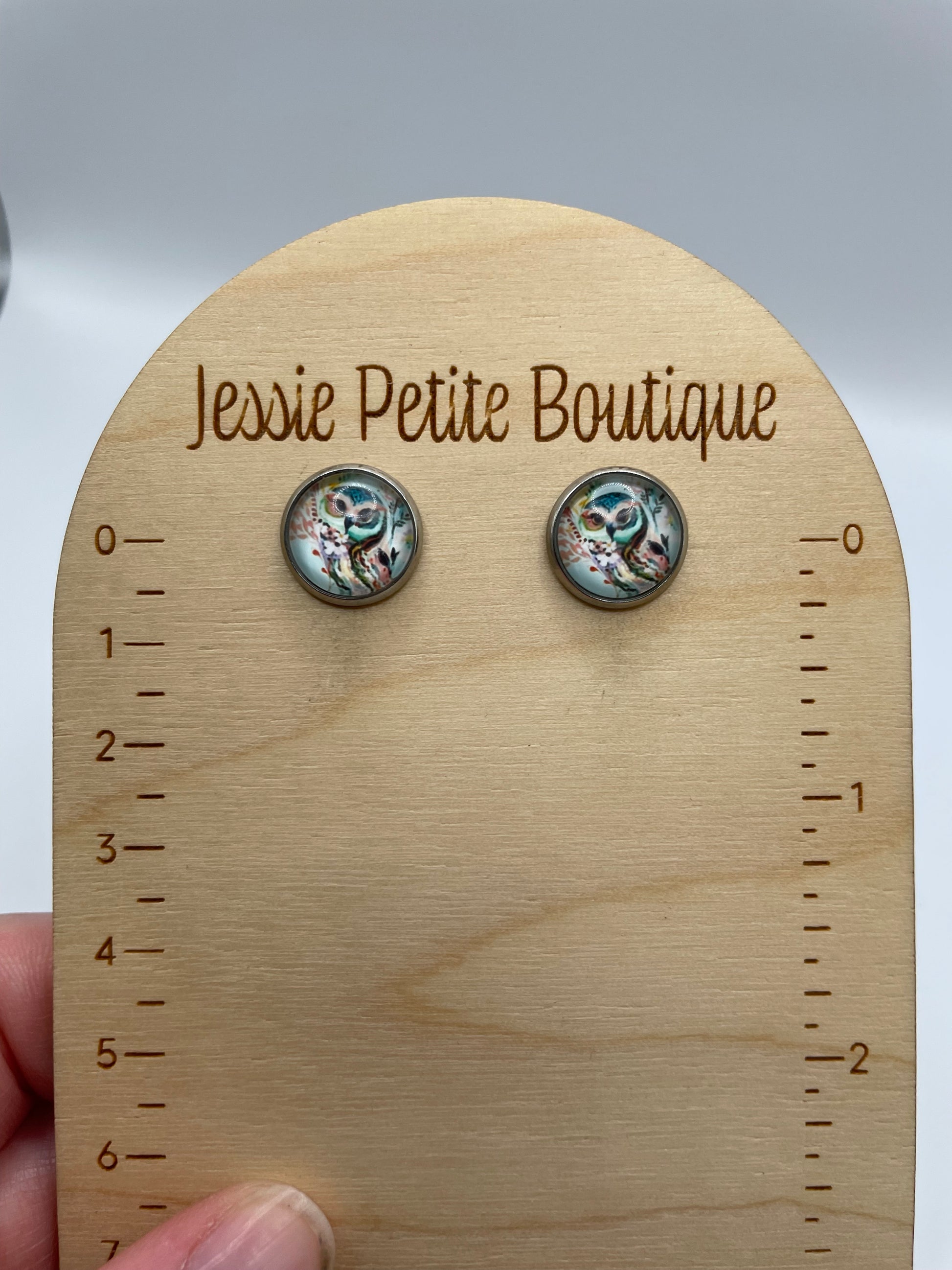Fabriqués en acier inoxydable +sans nickel et ornés d’un cabochon en verre de 13 mm, ils présentent une jolie illustration de hibou entouré de motifs floraux délicats dans des tons doux de bleu, pêche et ivoire.