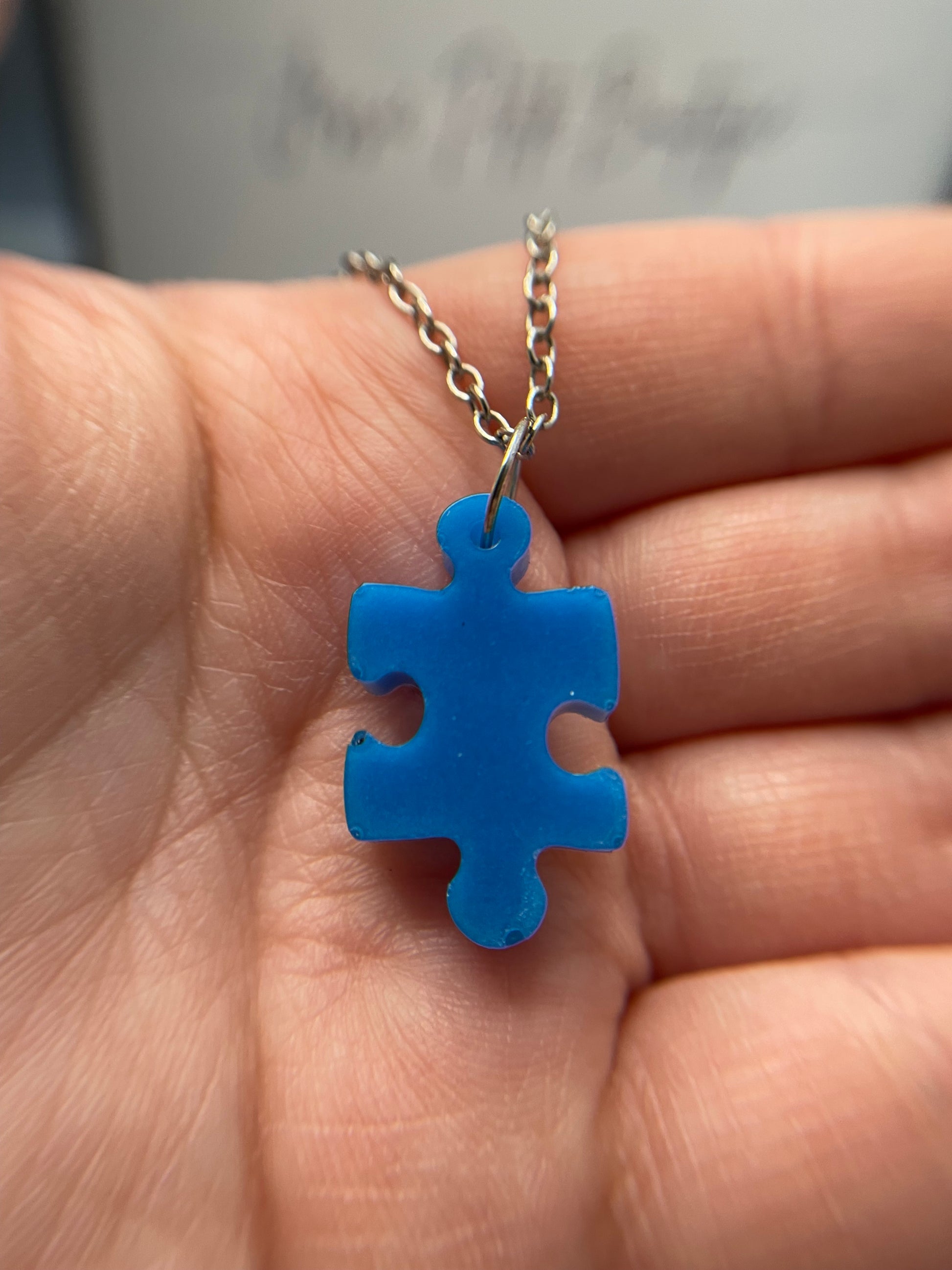 Ce collier bleu offre un design unique et coloré, parfait pour les amateurs de bijoux originaux et symboliques. Doté d'un pendentif en forme de pièce de casse tete d'un bleu profond, il symbolise la connexion et l'individualité.