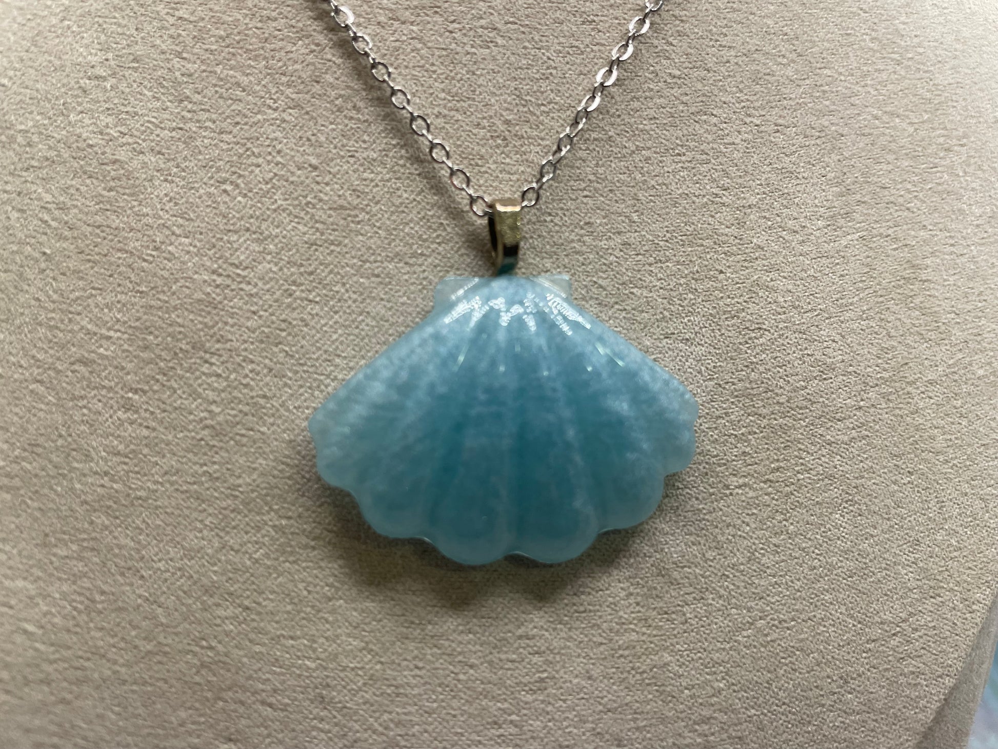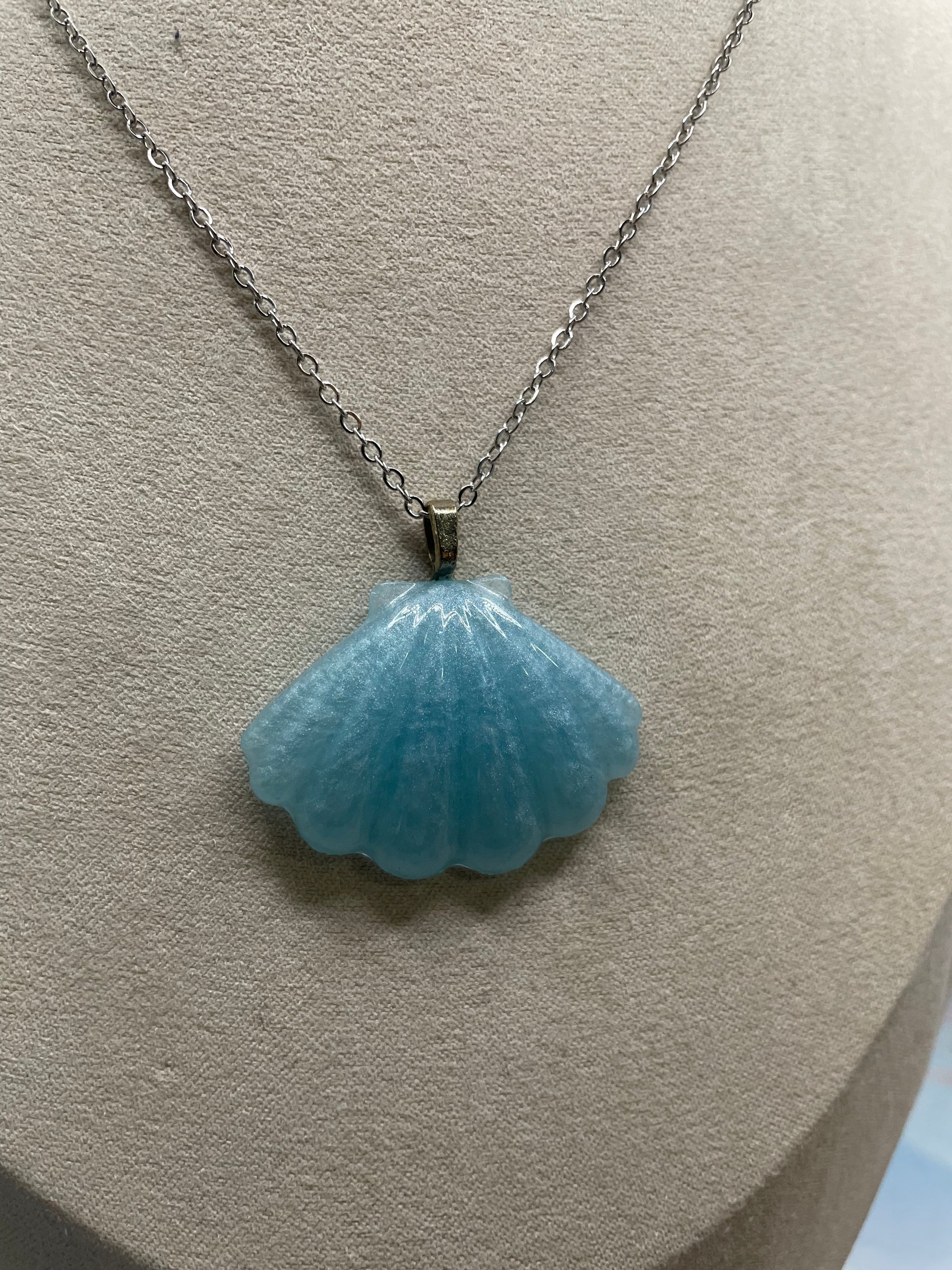 Cet ensemble délicat met en valeur des pendentifs en forme de coquillage aux nuances de bleu doux, rehaussés de mica pour une texture lumineuse et subtile. Les lignes sculptées et la finition brillante rappellent la tranquillité du bord de mer, pour un style à la fois apaisant et élégant.