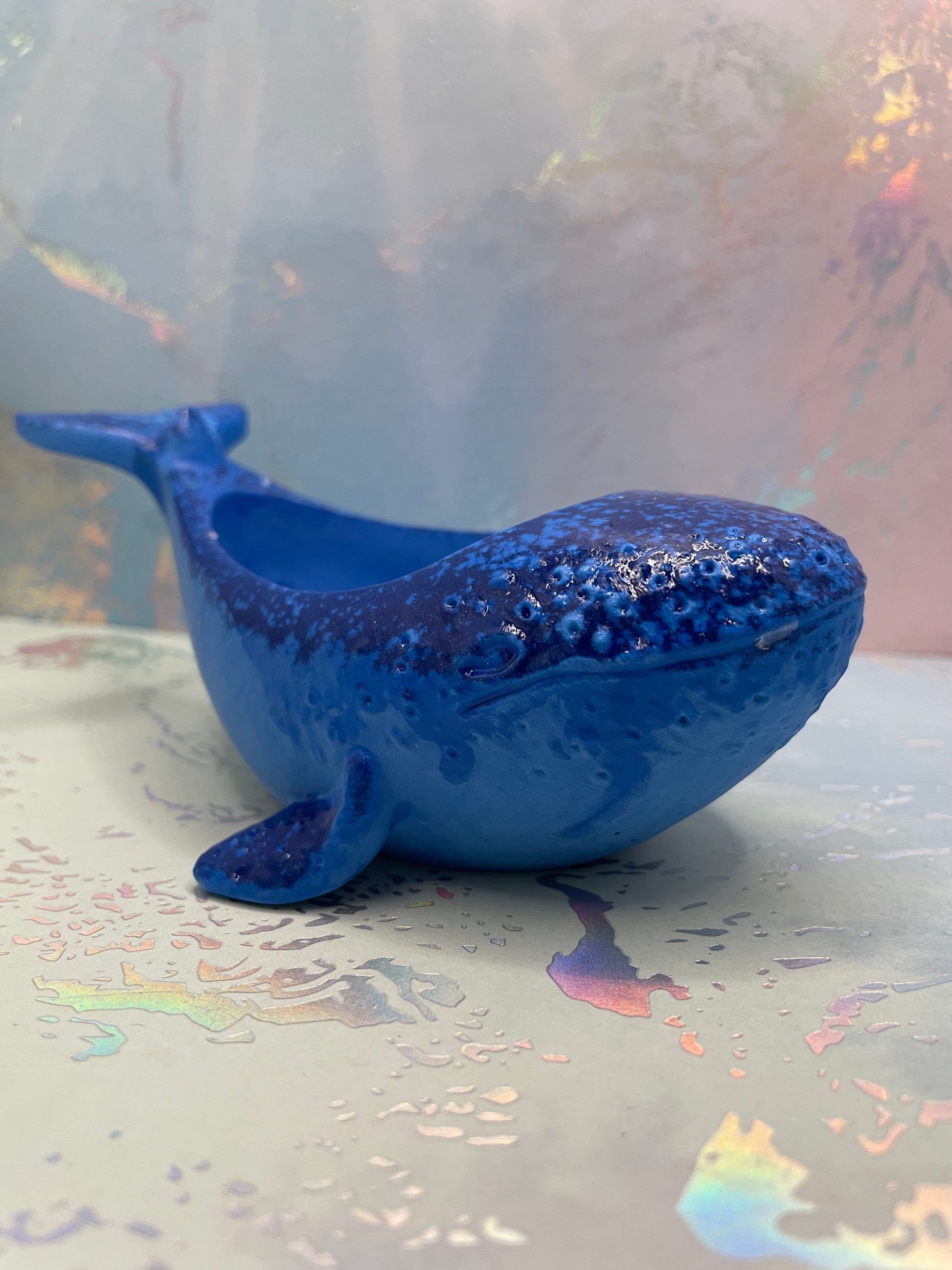 Ce contenant en éco-résine fait à la main en forme de baleine, s’inspirant de la force tranquille et de la beauté de l’océan. Ses nuances de bleu riches et sa texture organique lui confèrent une allure à la fois ludique et sculpturale.