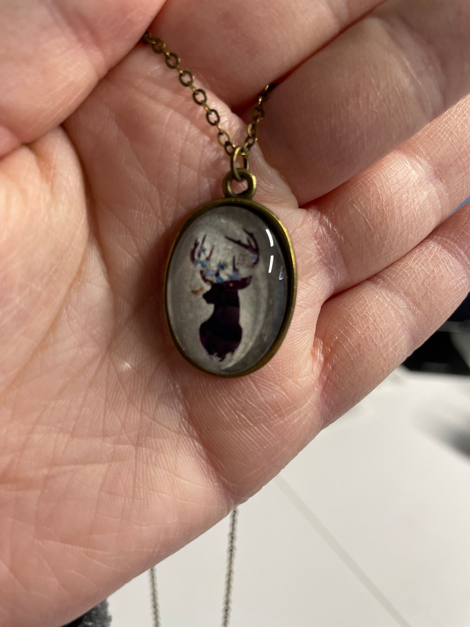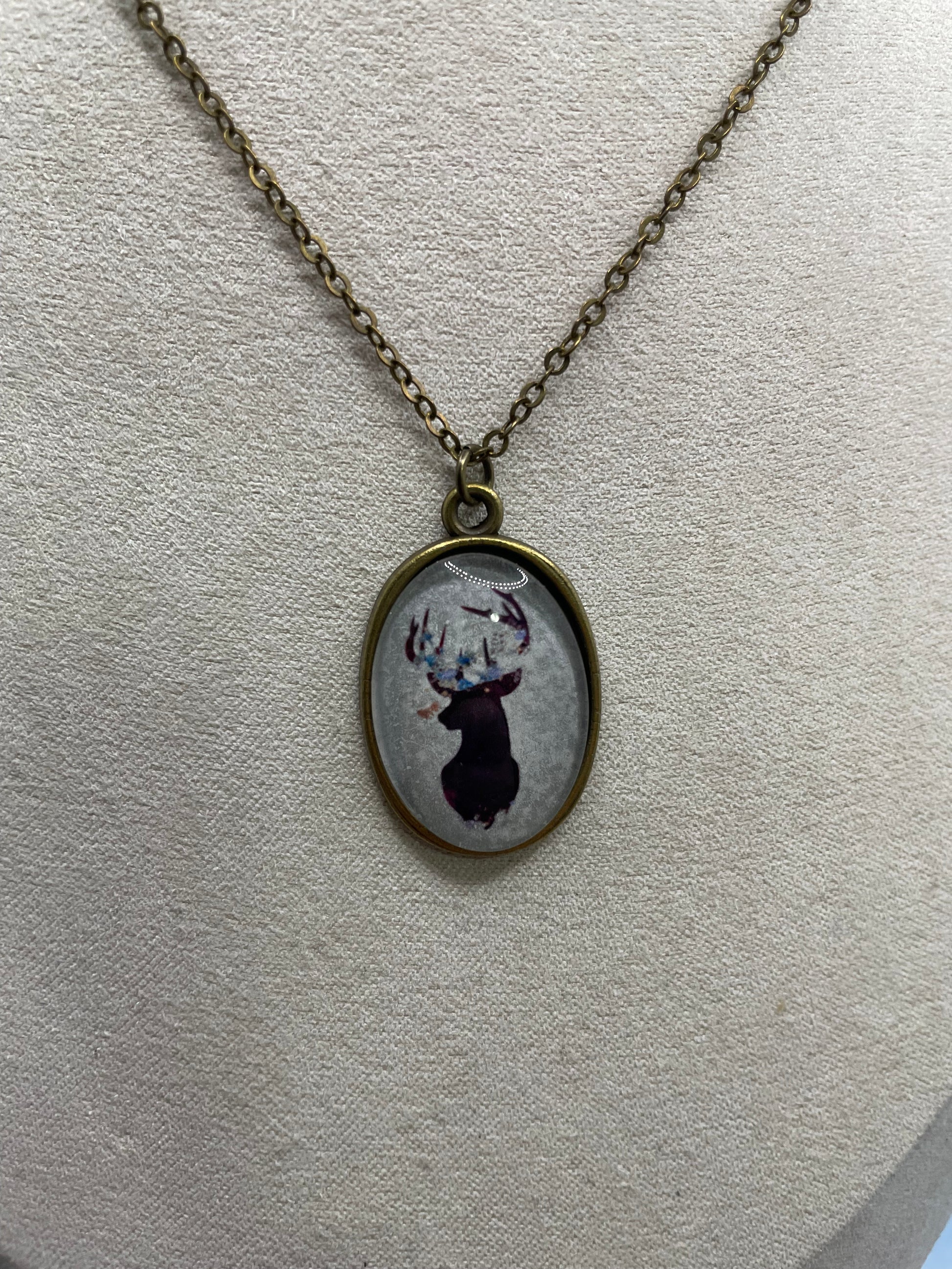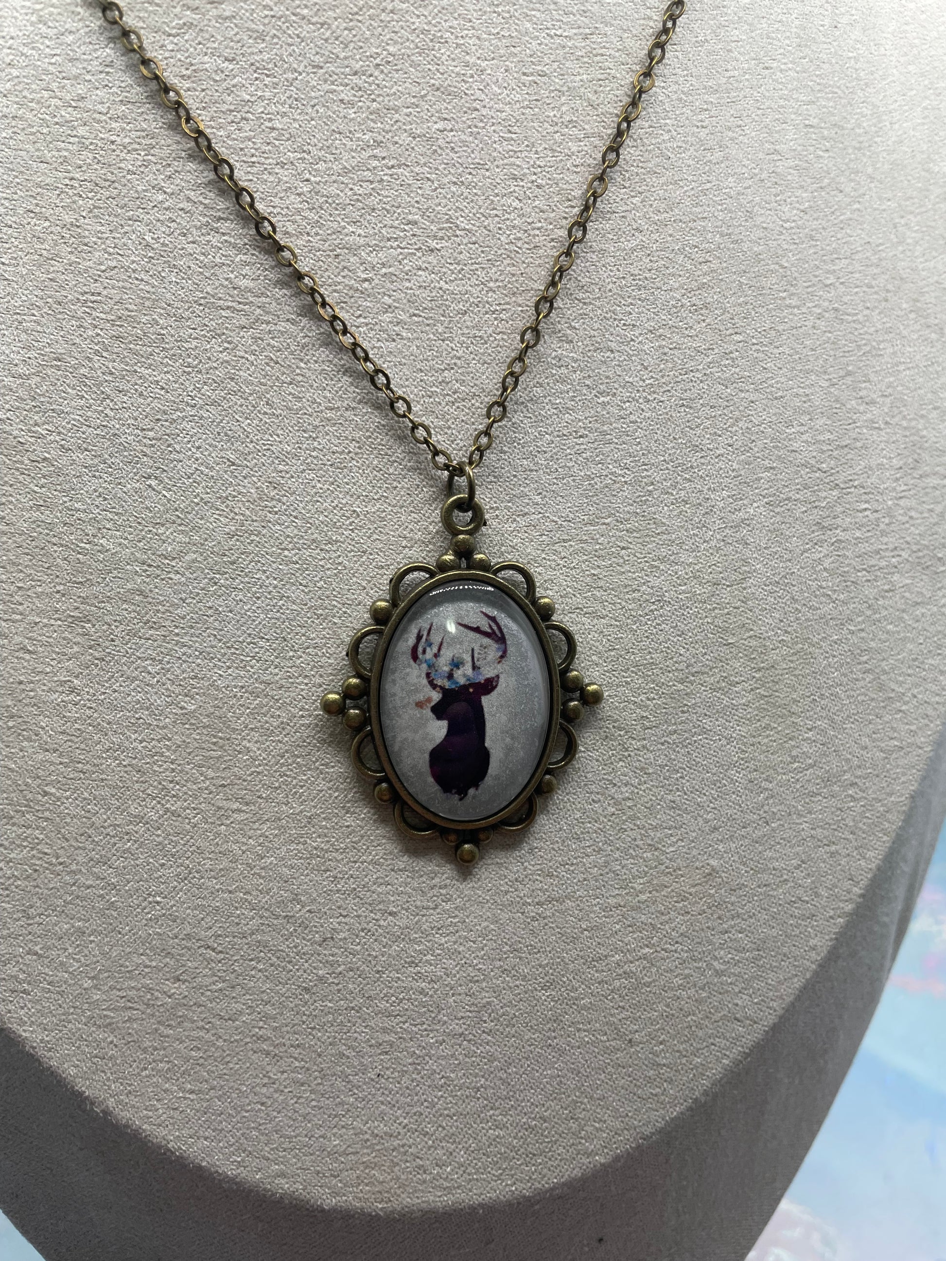 Un collier raffiné d’inspiration vintage mettant en valeur la silhouette majestueuse d’un cerf sous un cabochon de verre lisse. Le profil sombre du cerf se détache élégamment sur un fond doux et légèrement brumeux, encadré d’un sertissage bronze antique qui accentue son charme forestier intemporel. Délicat mais distinctif, ce bijou apporte une touche rustique et élégante à toutes vos tenues.