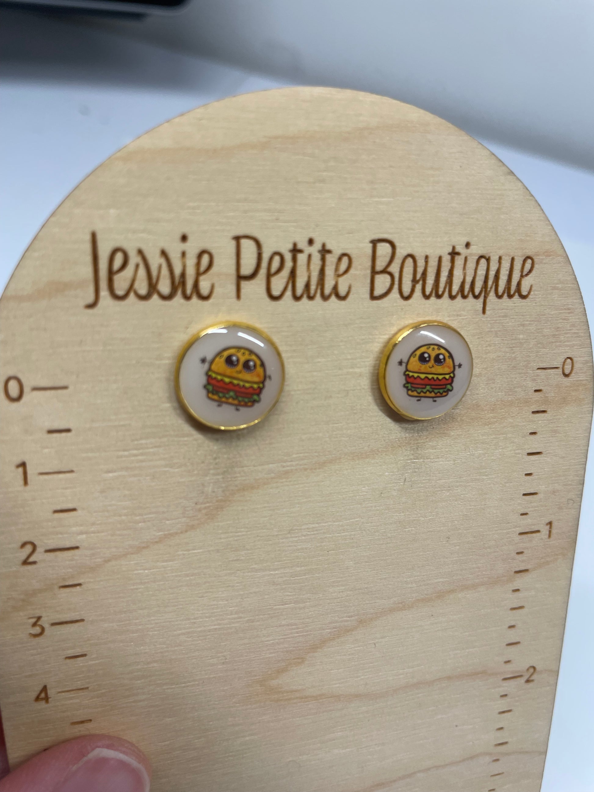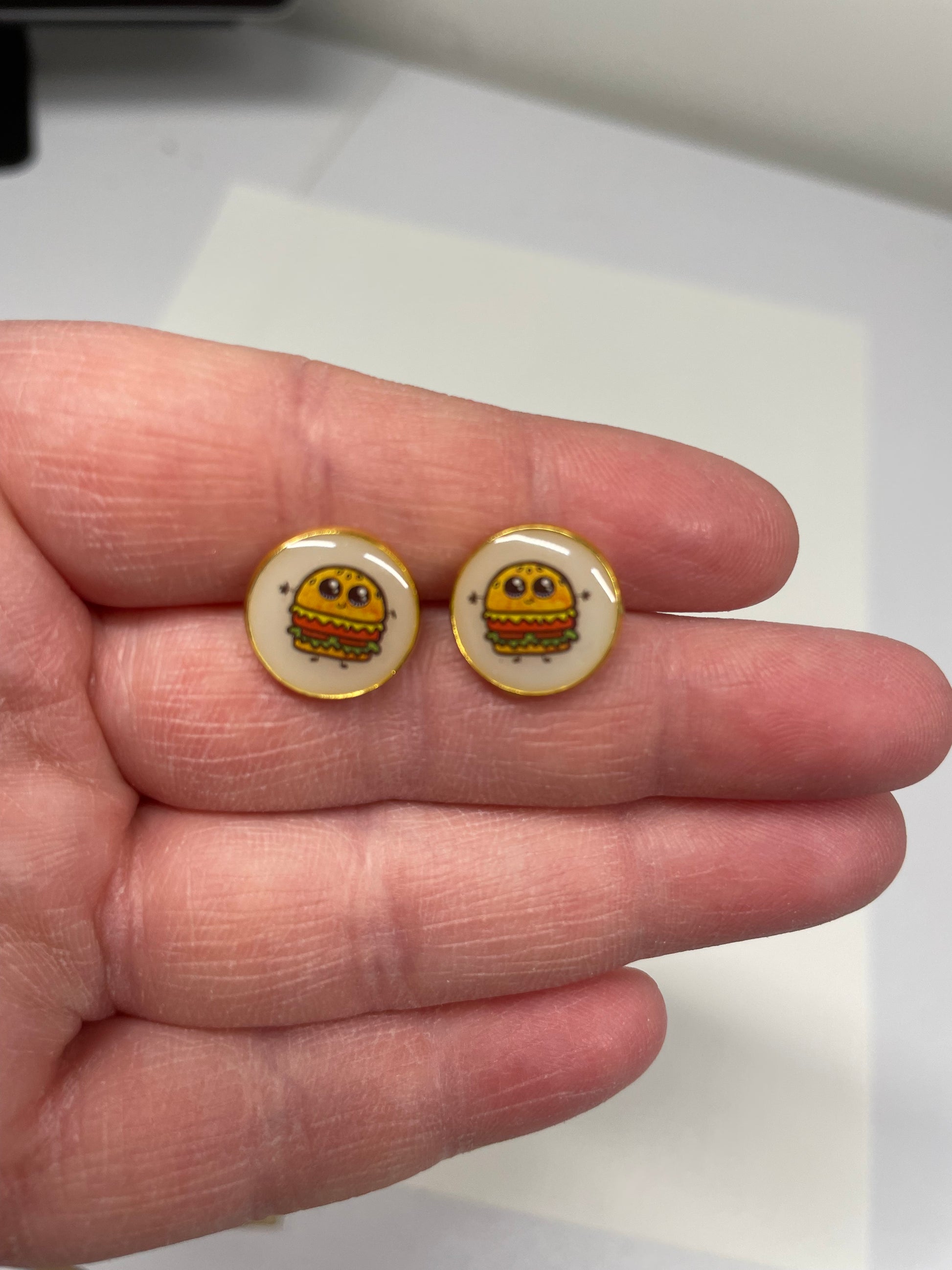Ces boutons d’oreille hamburger mignon présentent une adorable illustration de hamburger aux détails expressifs, sur un fond clair doux, soulignée d’un délicat contour doré. Le motif est scellé dans une résine lisse et brillante, rehaussée d’une touche de poudre de mica pour une finition lumineuse et amusante.