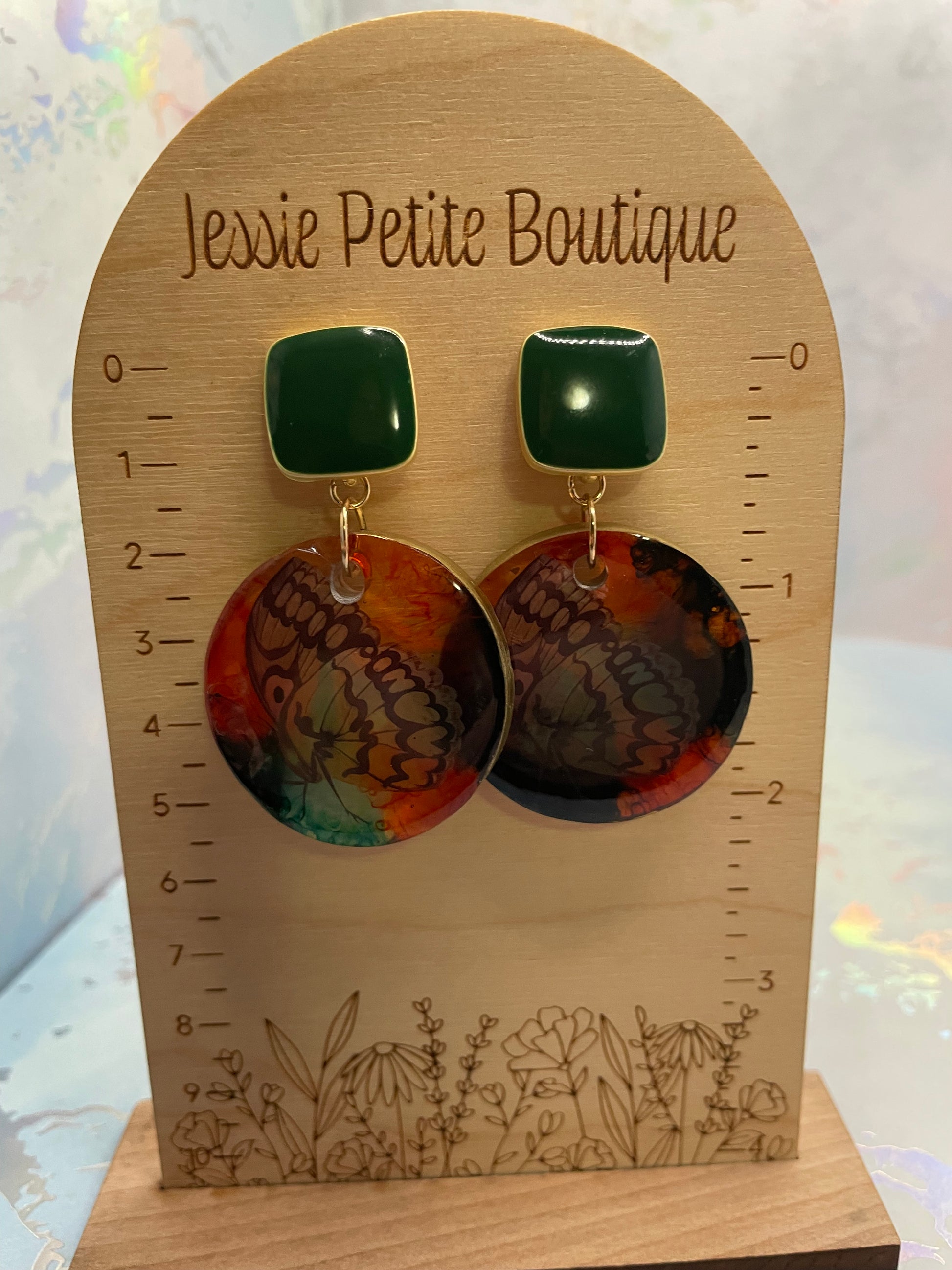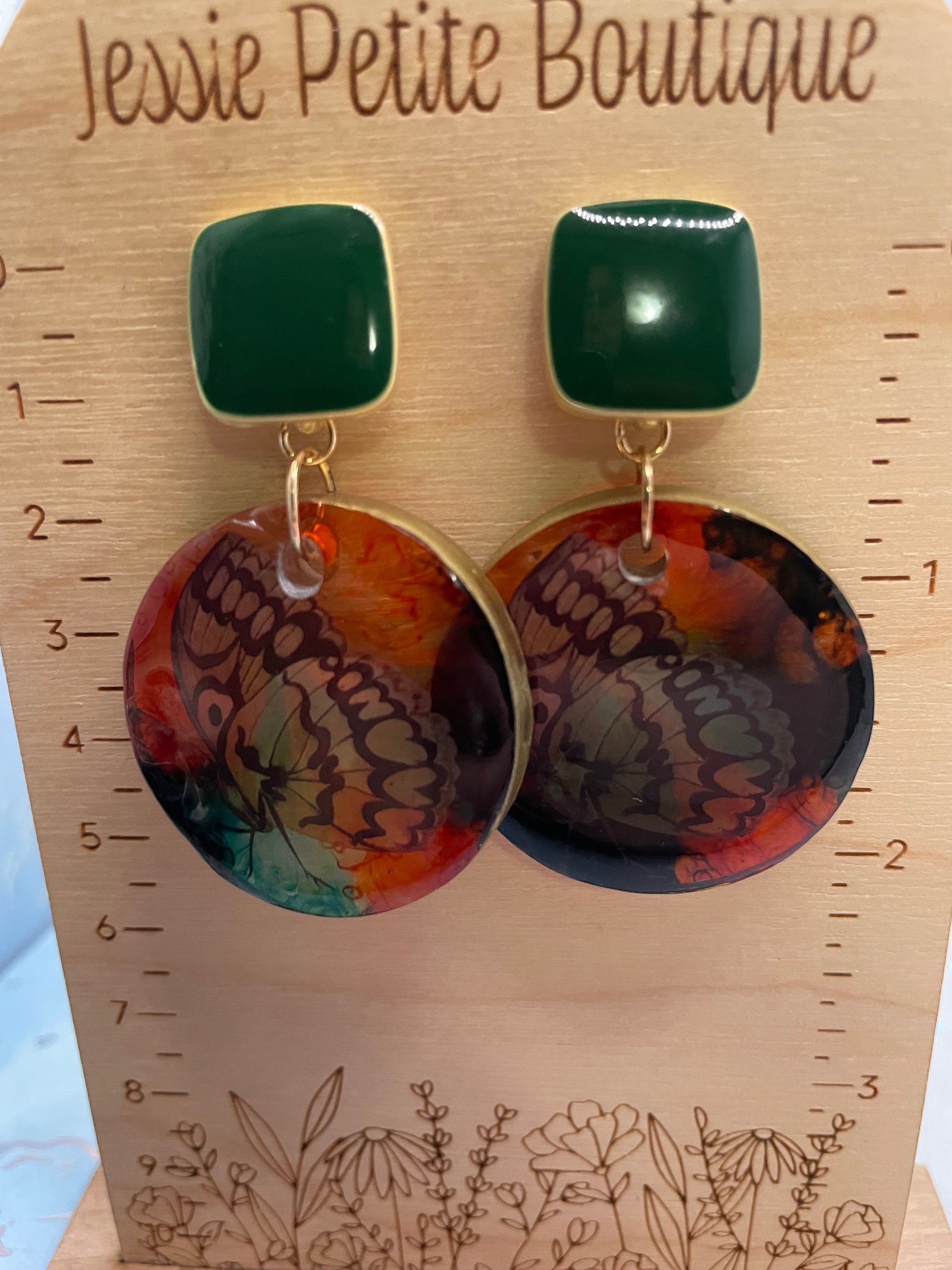 Ces boucles d’oreilles audacieuses présentent un pendentif rond mettant en valeur un motif de papillon délicatement détaillé, enchâssé dans des couches vibrantes d’encre à l’alcool. Les tons chauds d’orange se mêlent harmonieusement aux nuances de vert profond, créant un fond fluide et artistique qui fait ressortir les ailes du papillon.