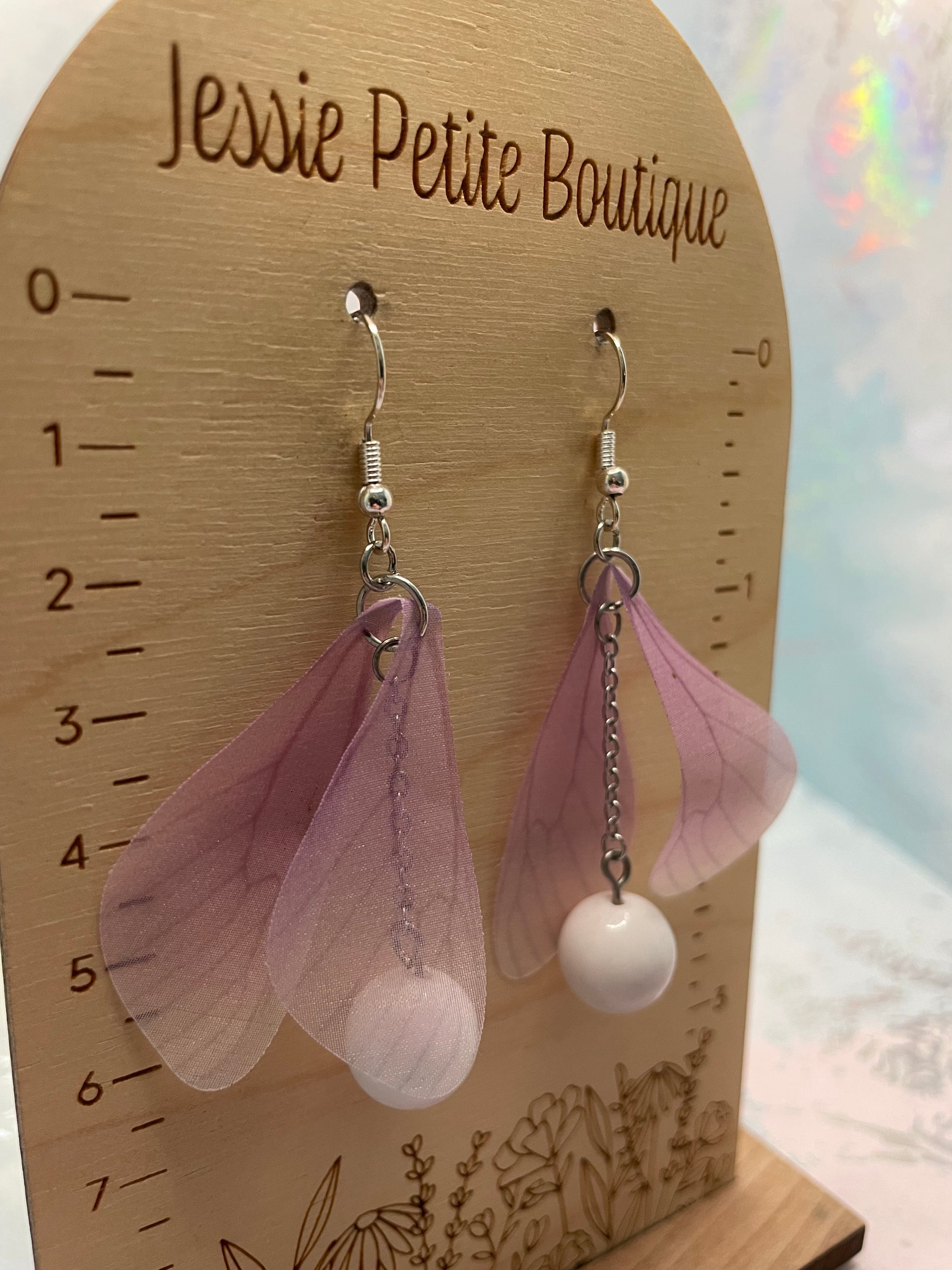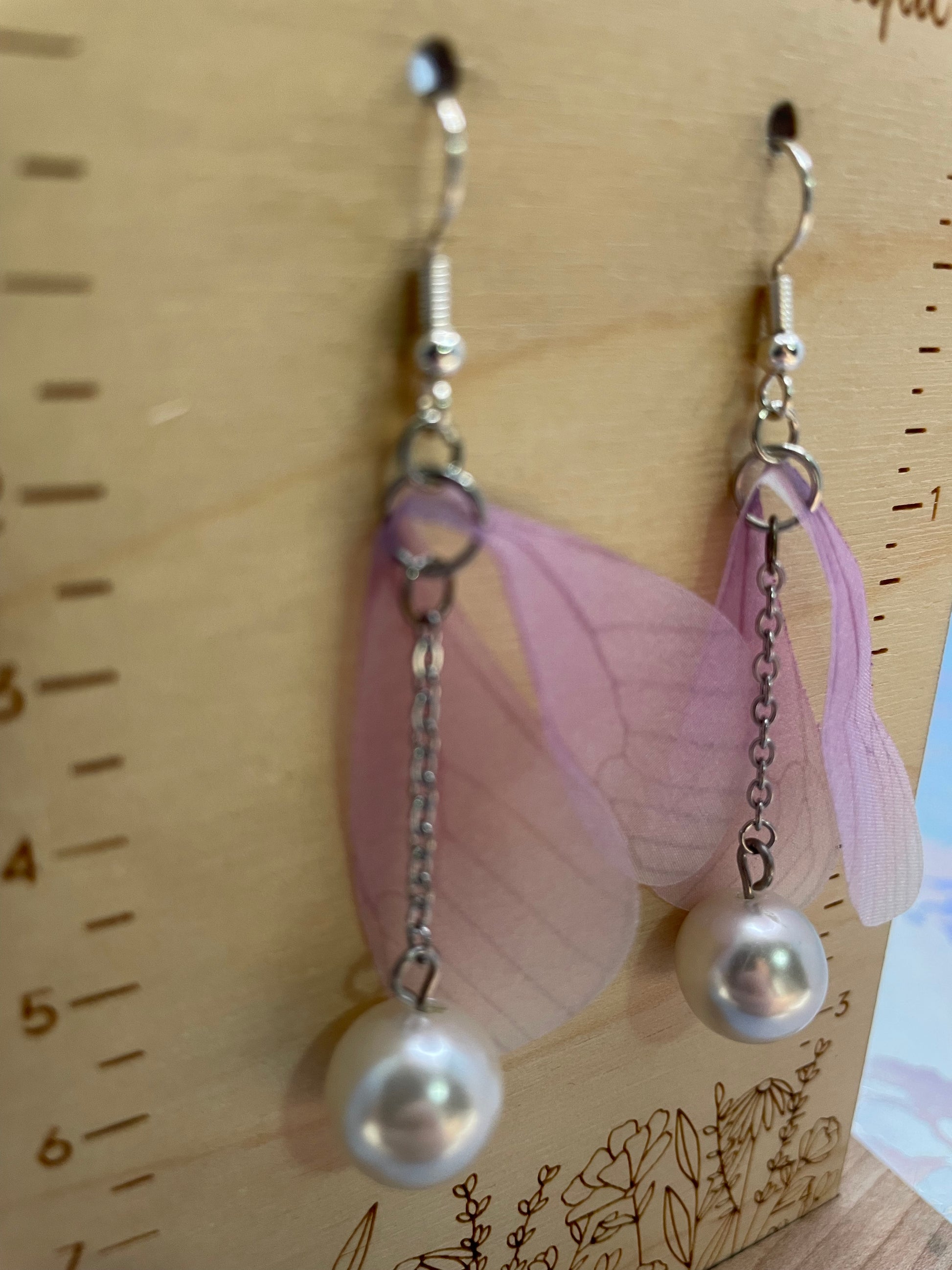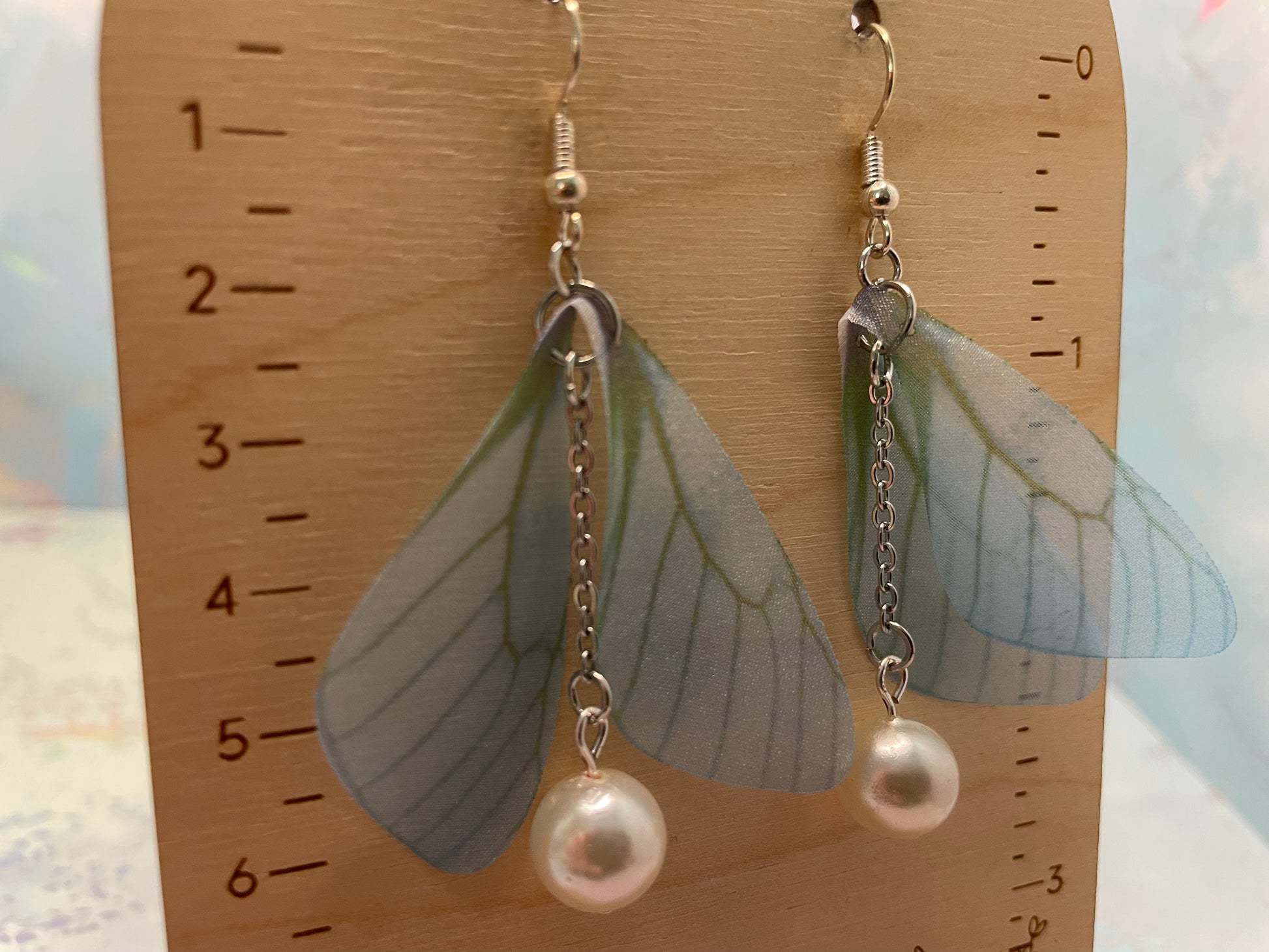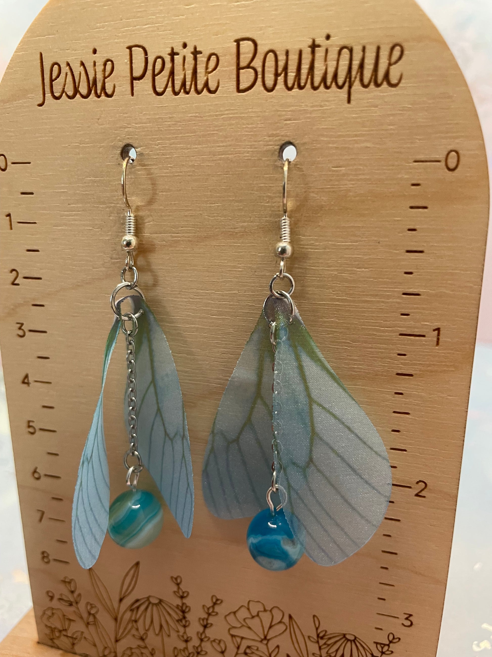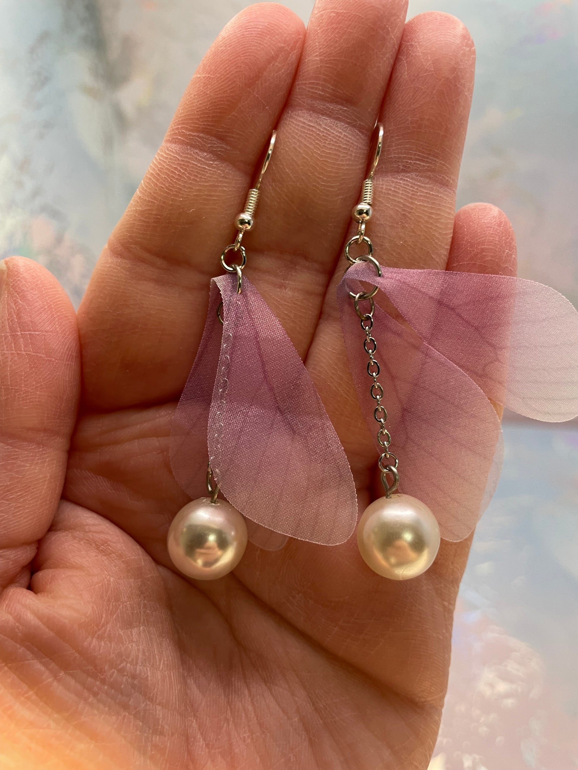 Couleurs disponibles : Ailes de papillon roses ou bleues, perle nacrée, bille blanche ou bille bleu marbré, apprêts argentés