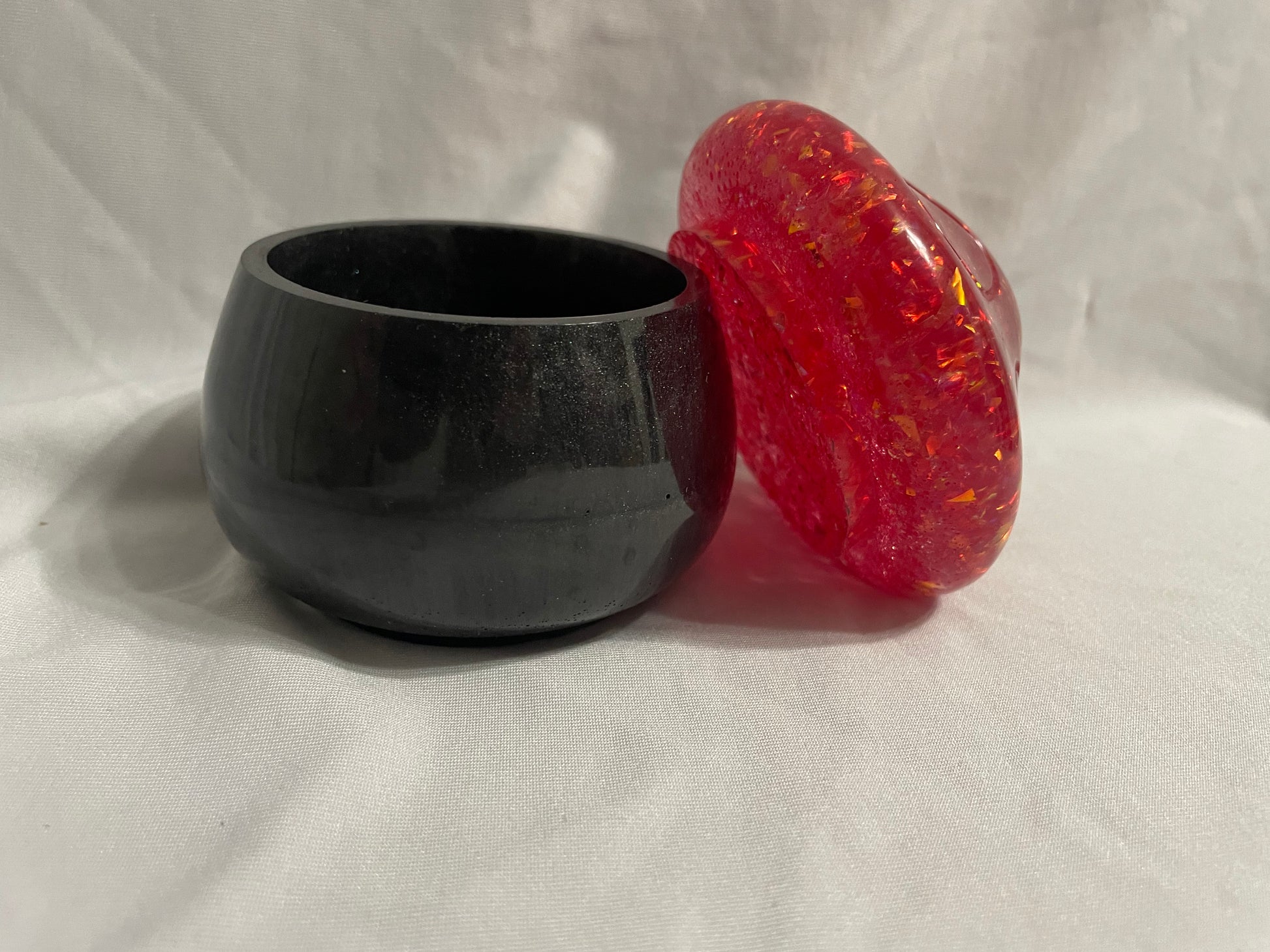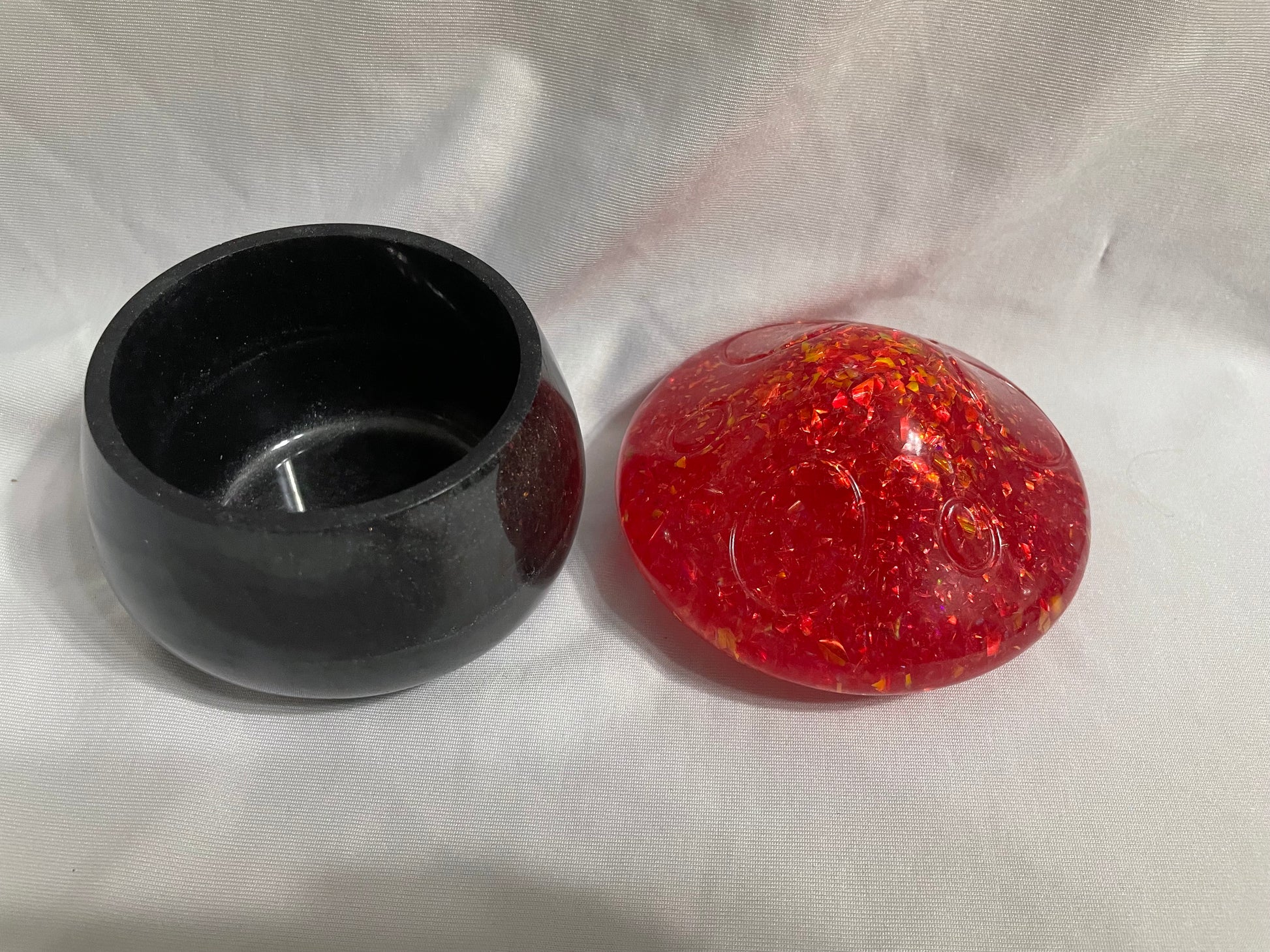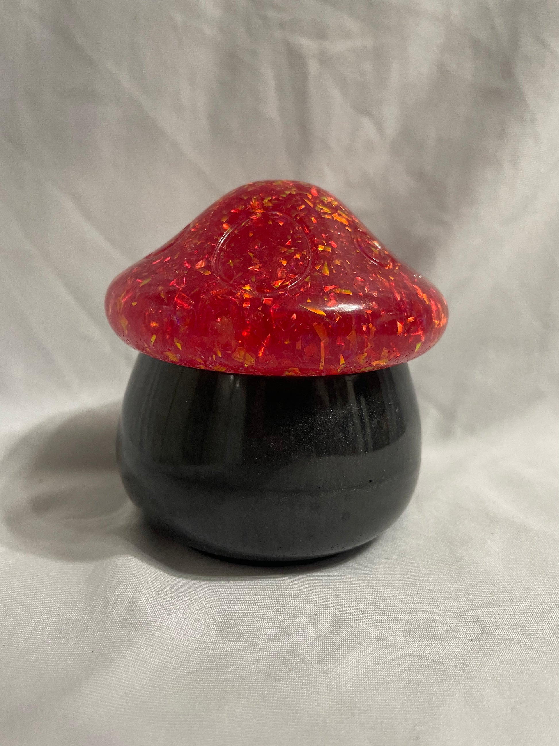 Ajoutez une touche de fantaisie et d'élégance à votre espace avec ce pot champignon en résine fait à la main . Doté d'une base noir brillante et d'un couvercle rouge scintillant, cet objet est à la fois fonctionnel et décoratif. La poudre de mica qu'il contient lui confÚre un fini subtil et lumineux qui capte magnifiquement la lumiÚre.