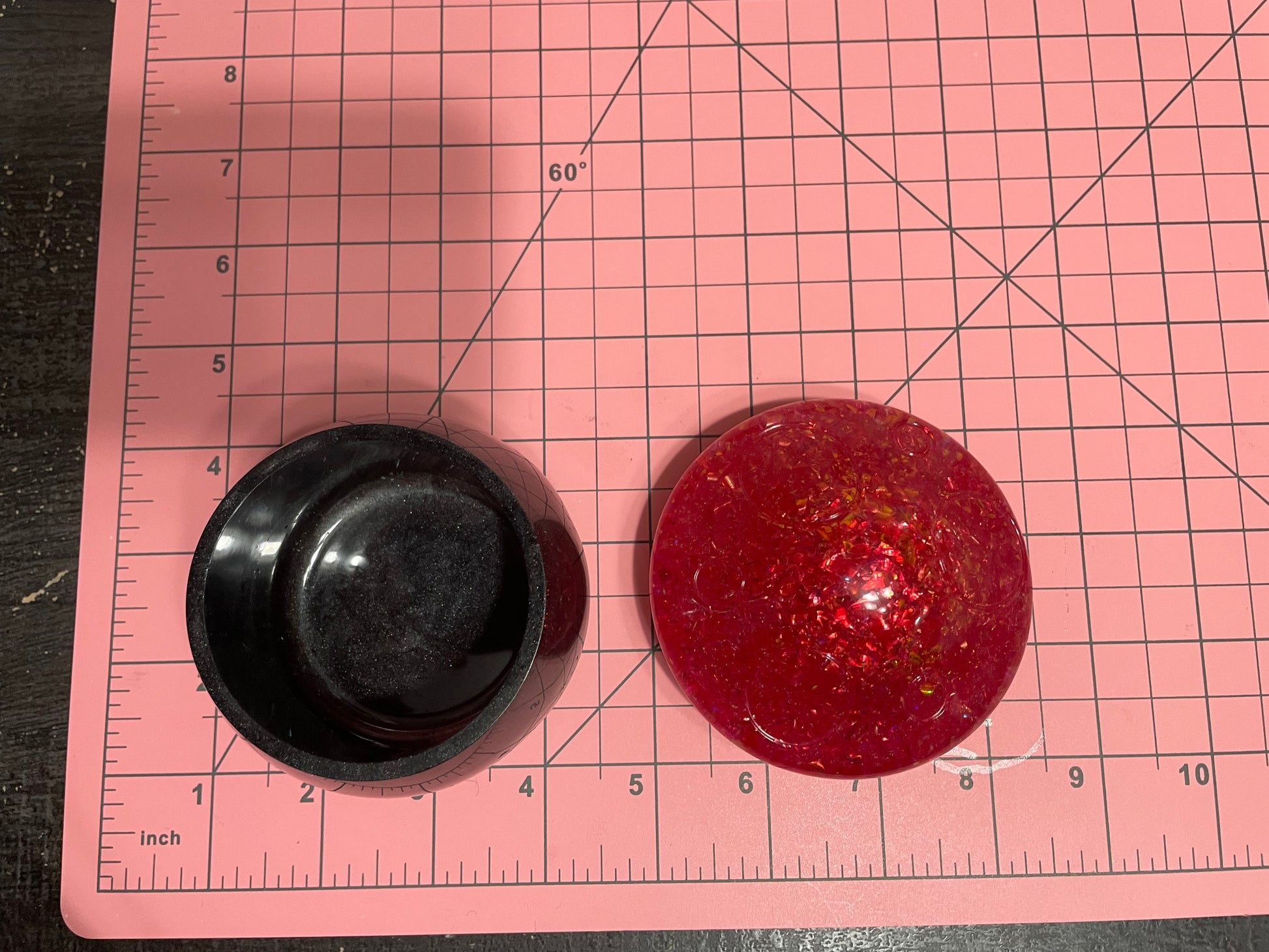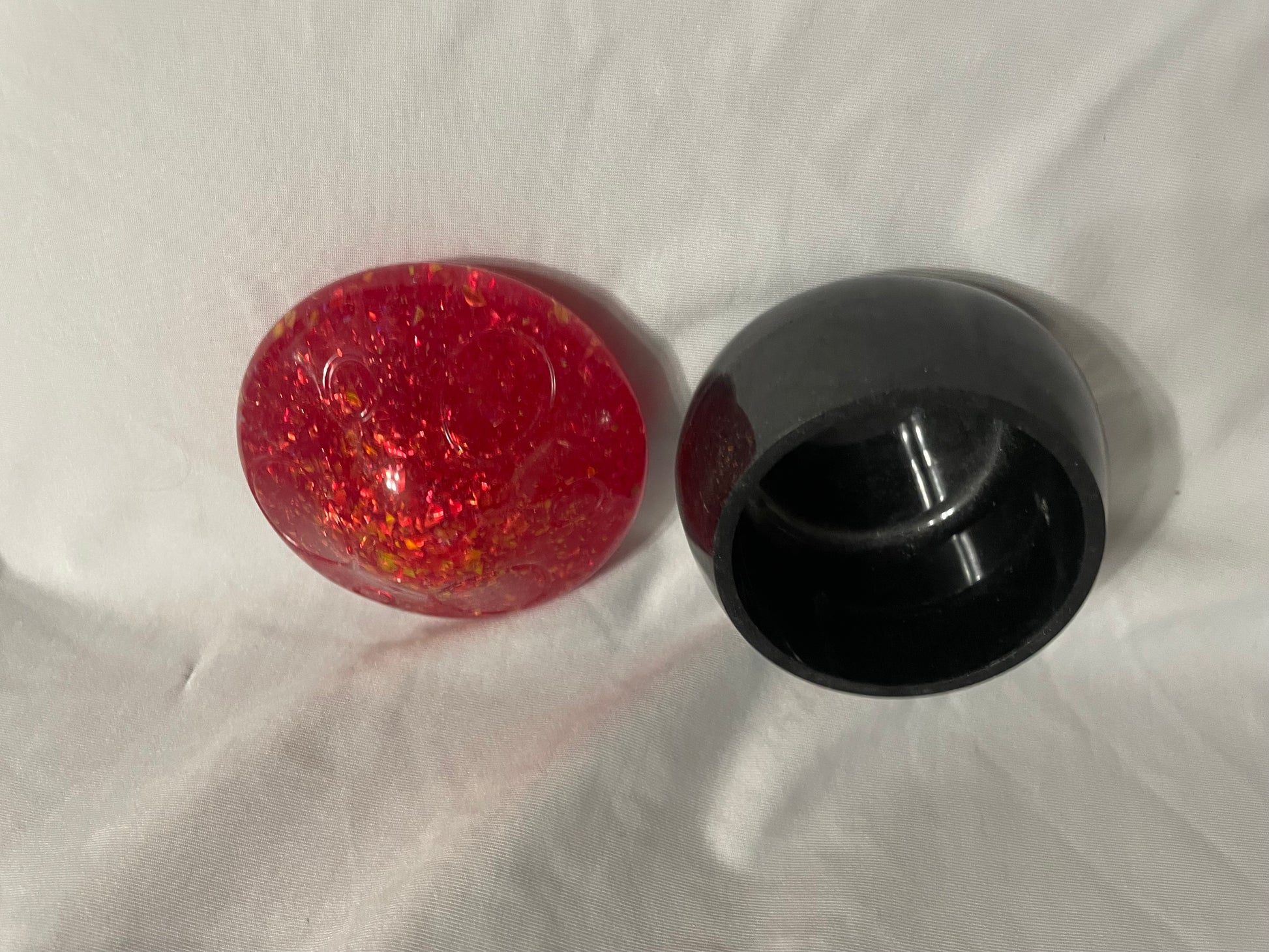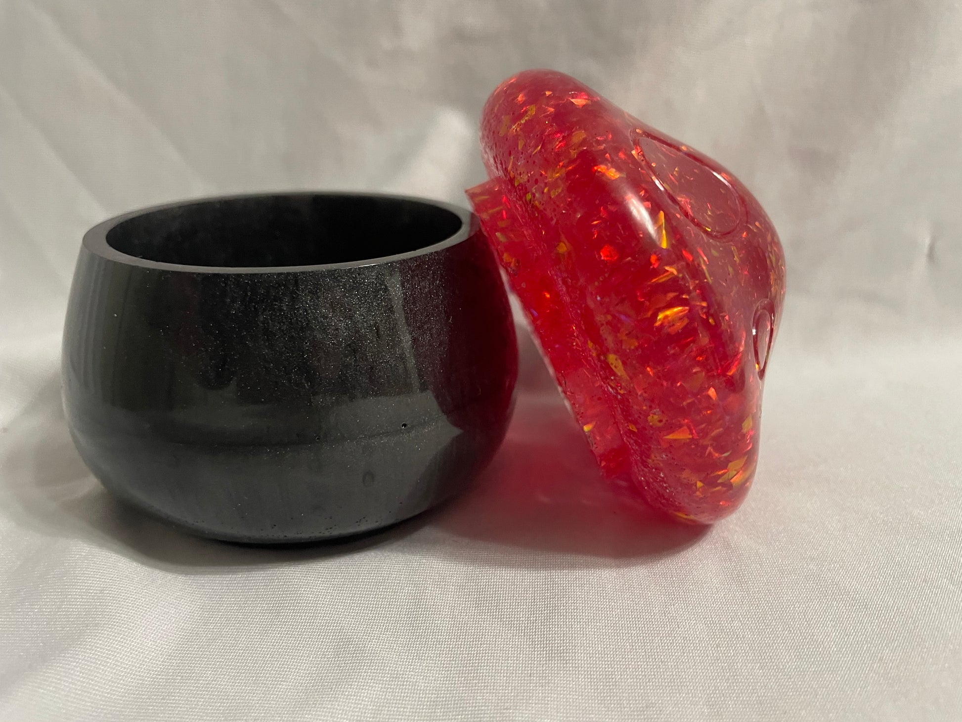 Ajoutez une touche de fantaisie et d'élégance à votre espace avec ce pot champignon en résine fait à la main . Doté d'une base noir brillante et d'un couvercle rouge scintillant, cet objet est à la fois fonctionnel et décoratif. La poudre de mica qu'il contient lui confÚre un fini subtil et lumineux qui capte magnifiquement la lumiÚre.