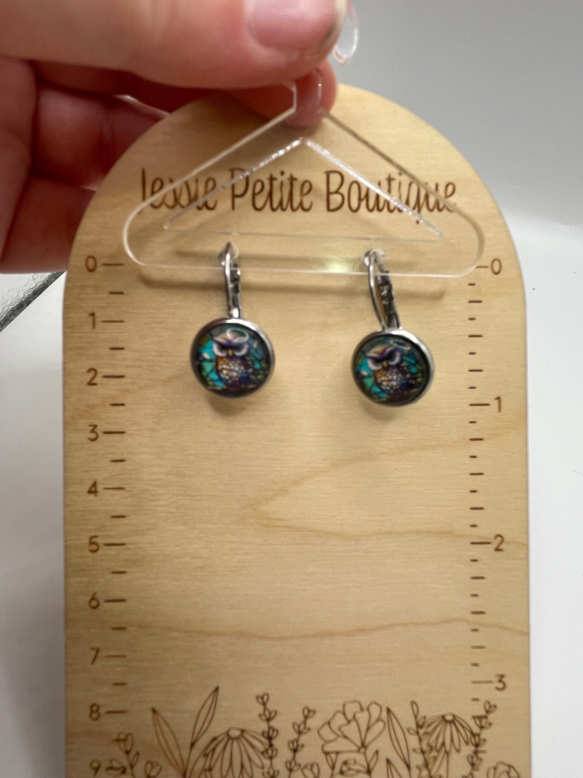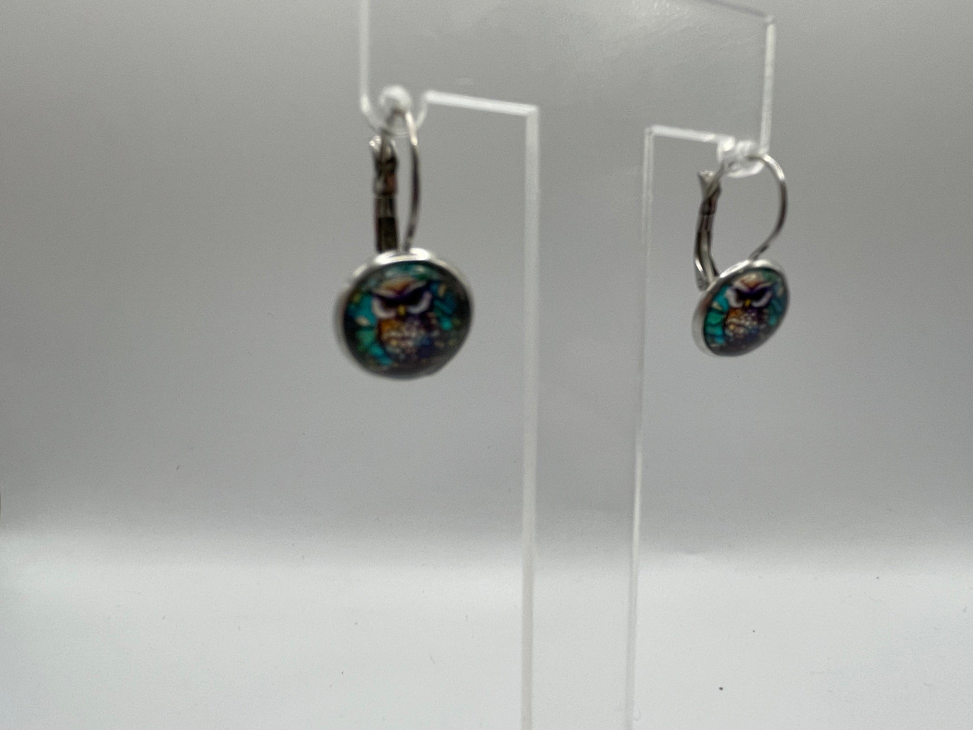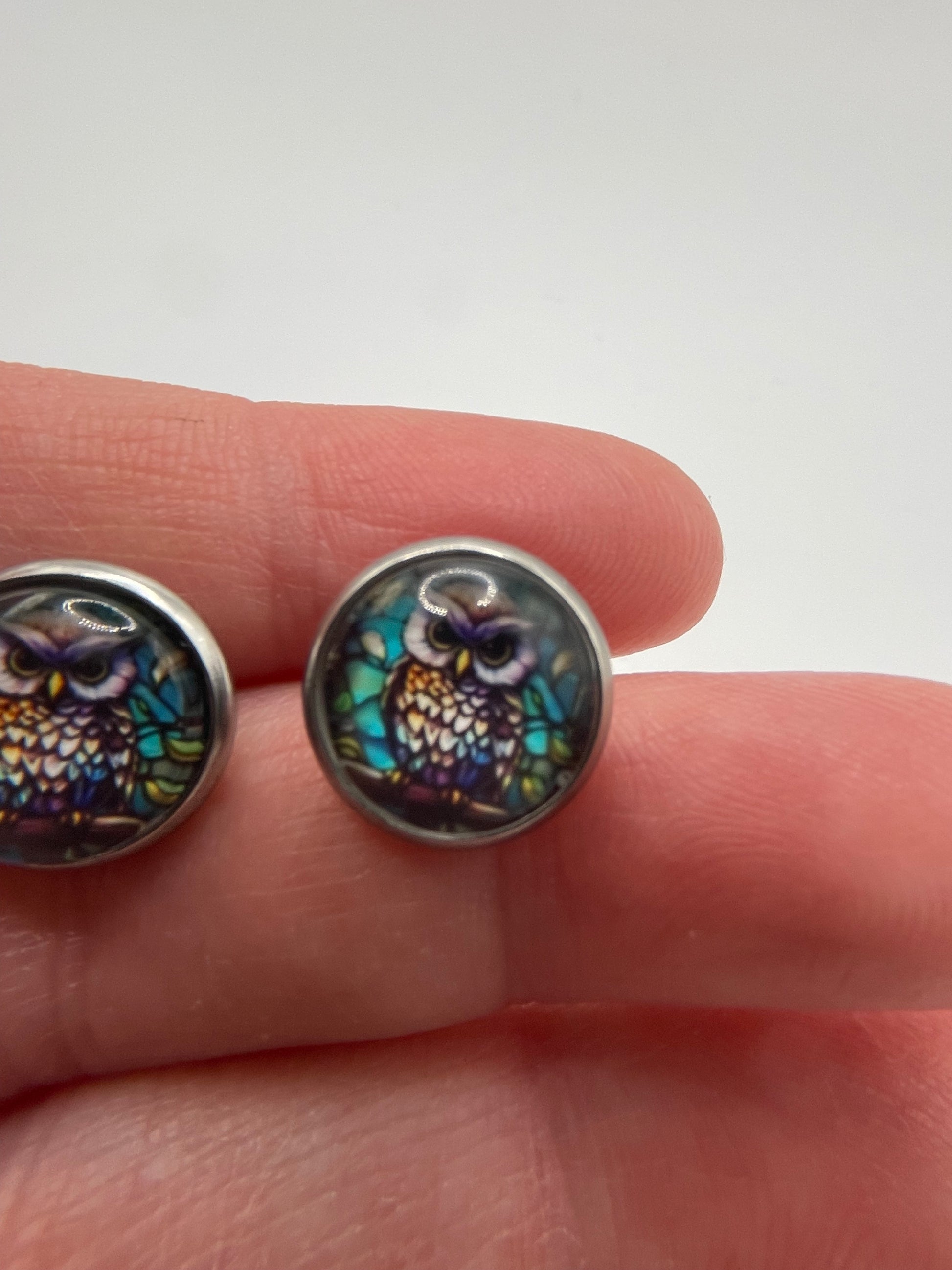 Fabriquées en acier inoxydable+ sans nickel et ornées d’un cabochon en verre de 13 mm, elles présentent un motif de hibou aux tons bleus, violets et dorés.
