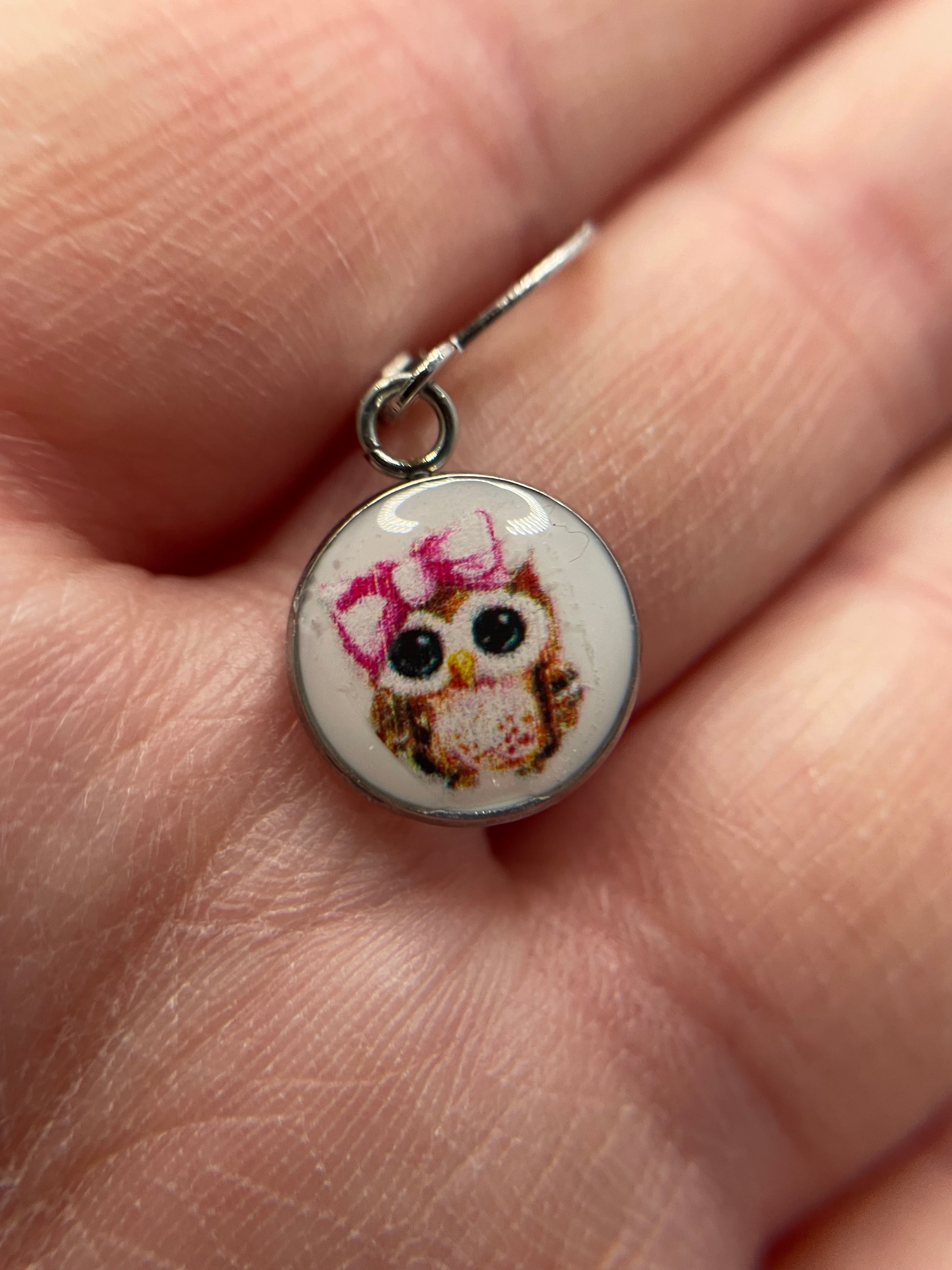 Ces jolies boucles d’oreilles pendantes de petit format présentent une adorable illustration de hibou aux grands yeux expressifs, rehaussée d’une délicate boucle rose. Légères et confortables, elles sont idéales pour un port quotidien ou pour ajouter une touche ludique à votre tenue.