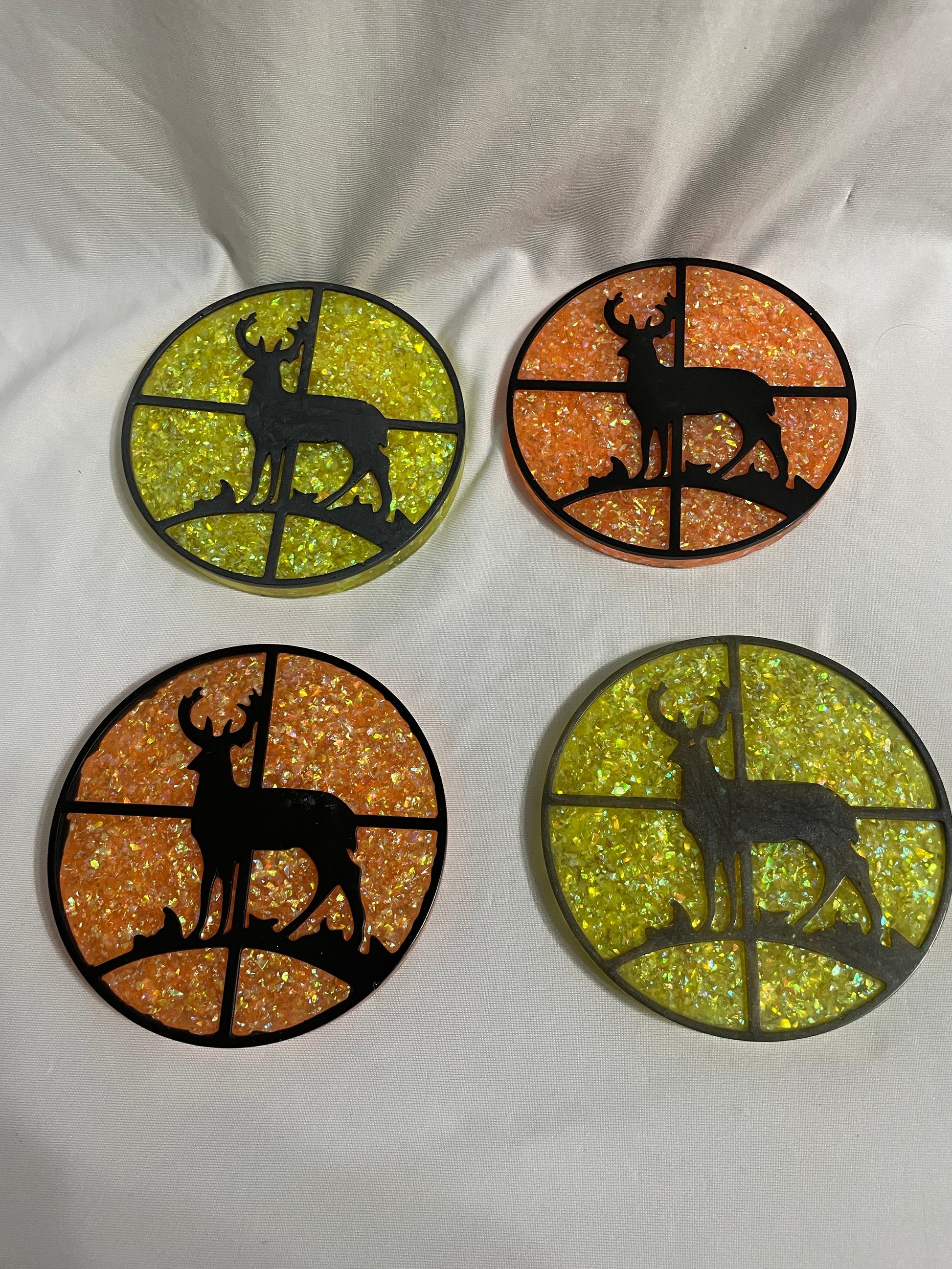 Apportez une touche forestière et chaleureuse à votre table avec ce sous-verre artisanal décoré d’un majestueux cerf. Fabriqué en résine et rehaussé de poudre de mica et de feuilles scintillantes, il présente de magnifiques reflets dans une teinte jaune lumineuse et orange coucher de soleil.