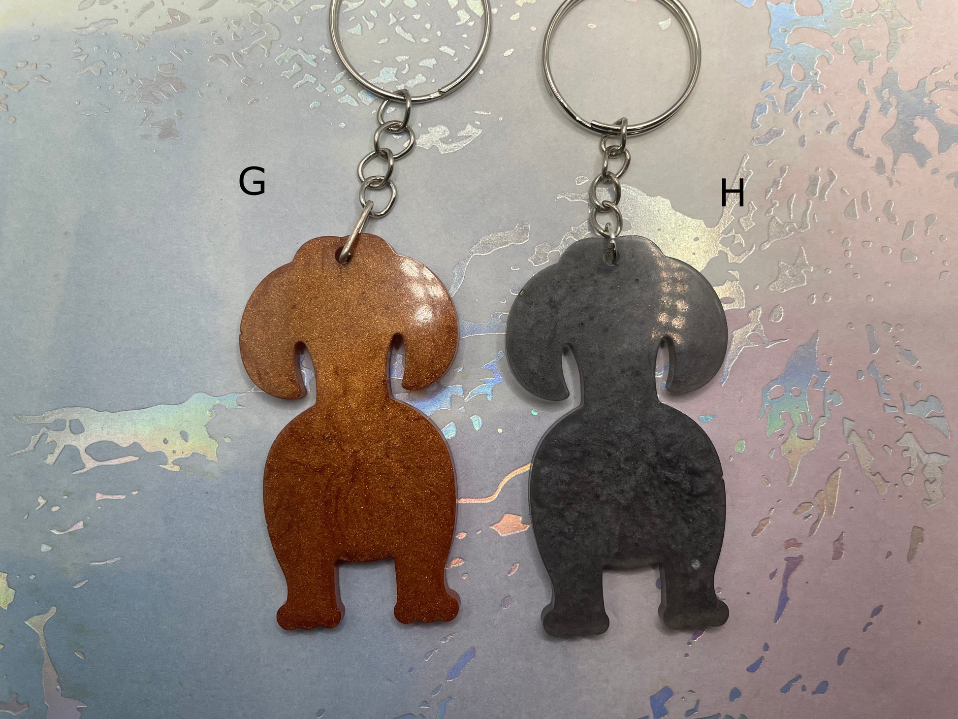 Affichez votre amour pour les chiens avec ces adorables porte-clés en forme de chien, entièrement faits à la main. Réalisés en résine et par de la poudre mica, ils offrent une finition douce et lumineuse. Disponibles en deux styles différents et en plusieurs variantes de couleurs, chaque pièce est unique, avec ses propres nuances, marbrures ou inclusions délicates comme des fleurs séchées.