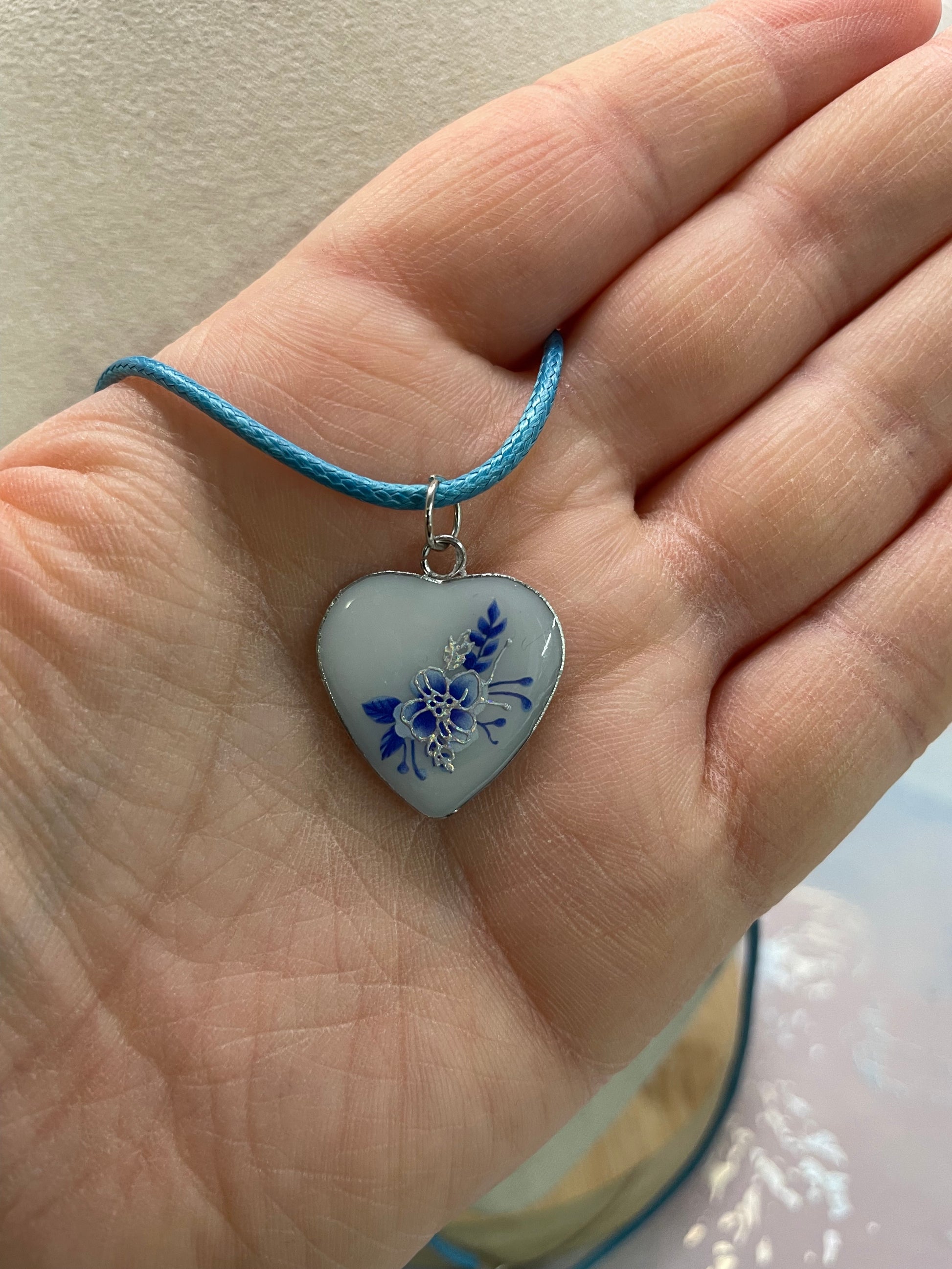 Ce collier délicat est orné d’un pendentif en forme de cœur aux lignes douces et raffinées. Réalisé en résine avec une finition soignée, il est sublimé par des accents de poudre de mica qui ajoutent une touche de lumière et de profondeur. Le motif floral bleu, finement détaillé, se détache avec élégance sur le fond clair du pendentif, créant un contraste à la fois doux et sophistiqué.