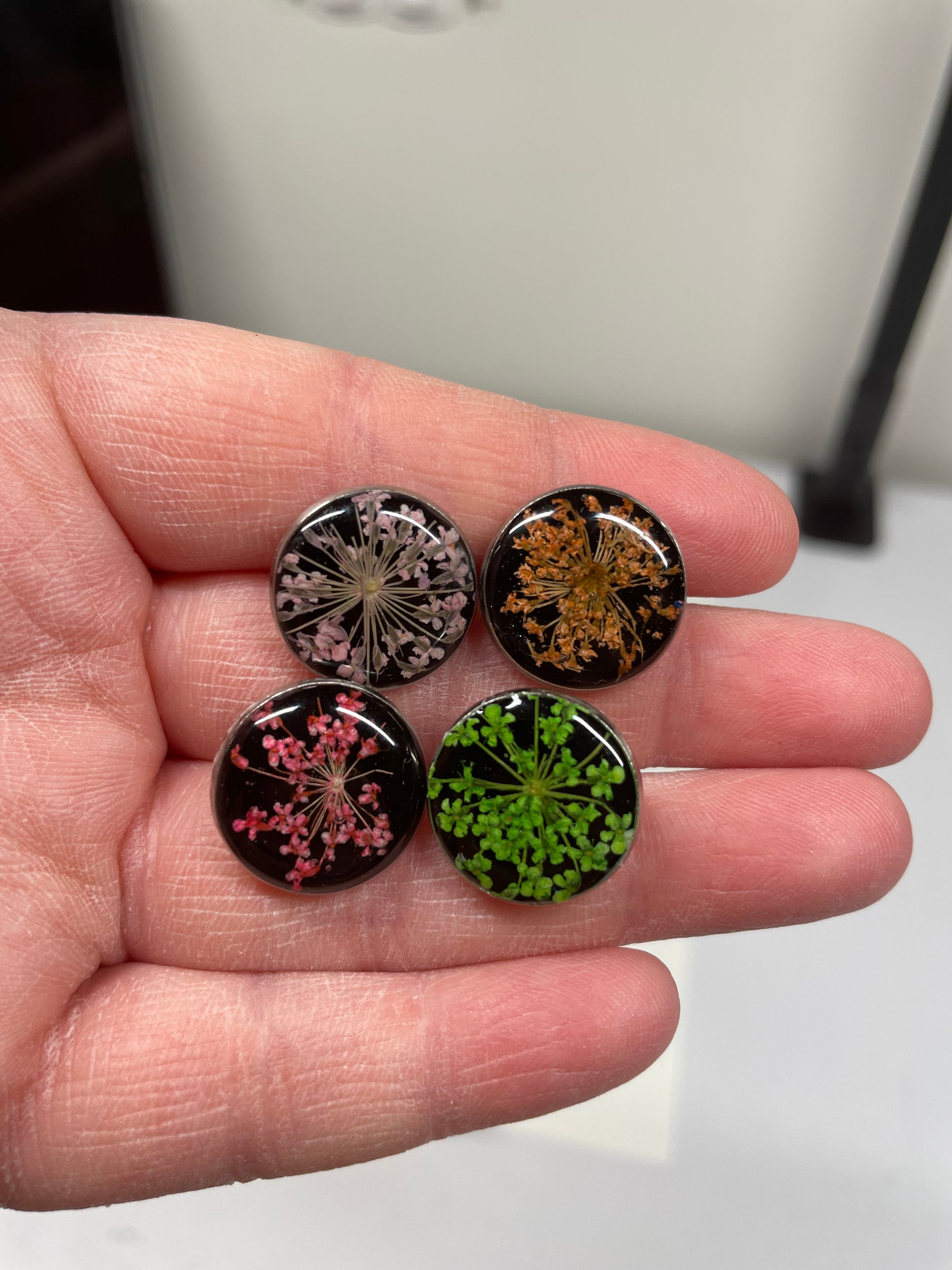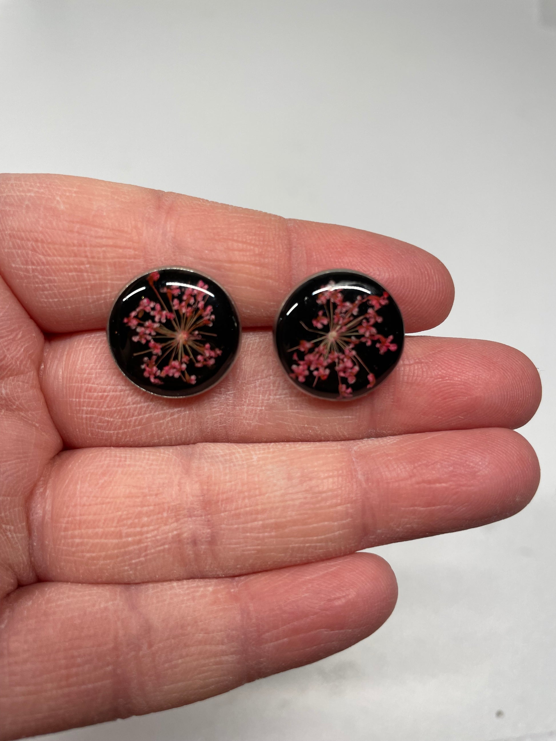 Ces boutons d’oreille en fleur de dentelle de la Reine-Anne mettent en valeur une véritable fleur séchée, soigneusement préservée dans la résine sur un fond noir profond. Le contraste accentue la finesse et la structure naturelle de la fleur.