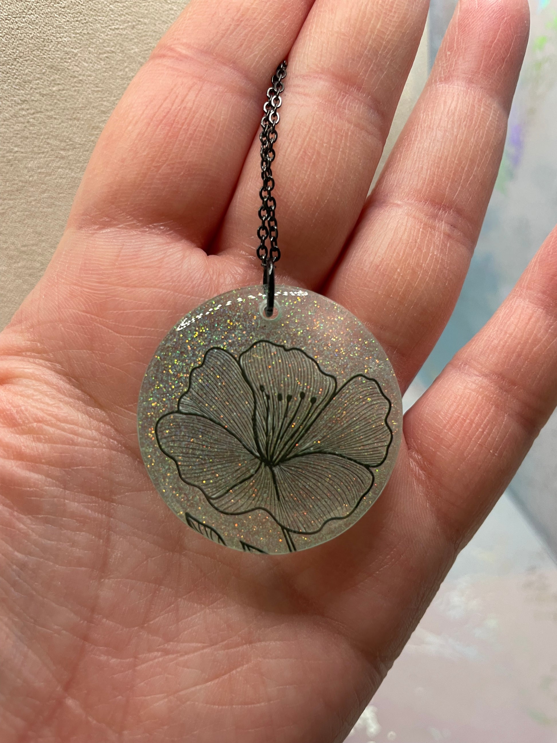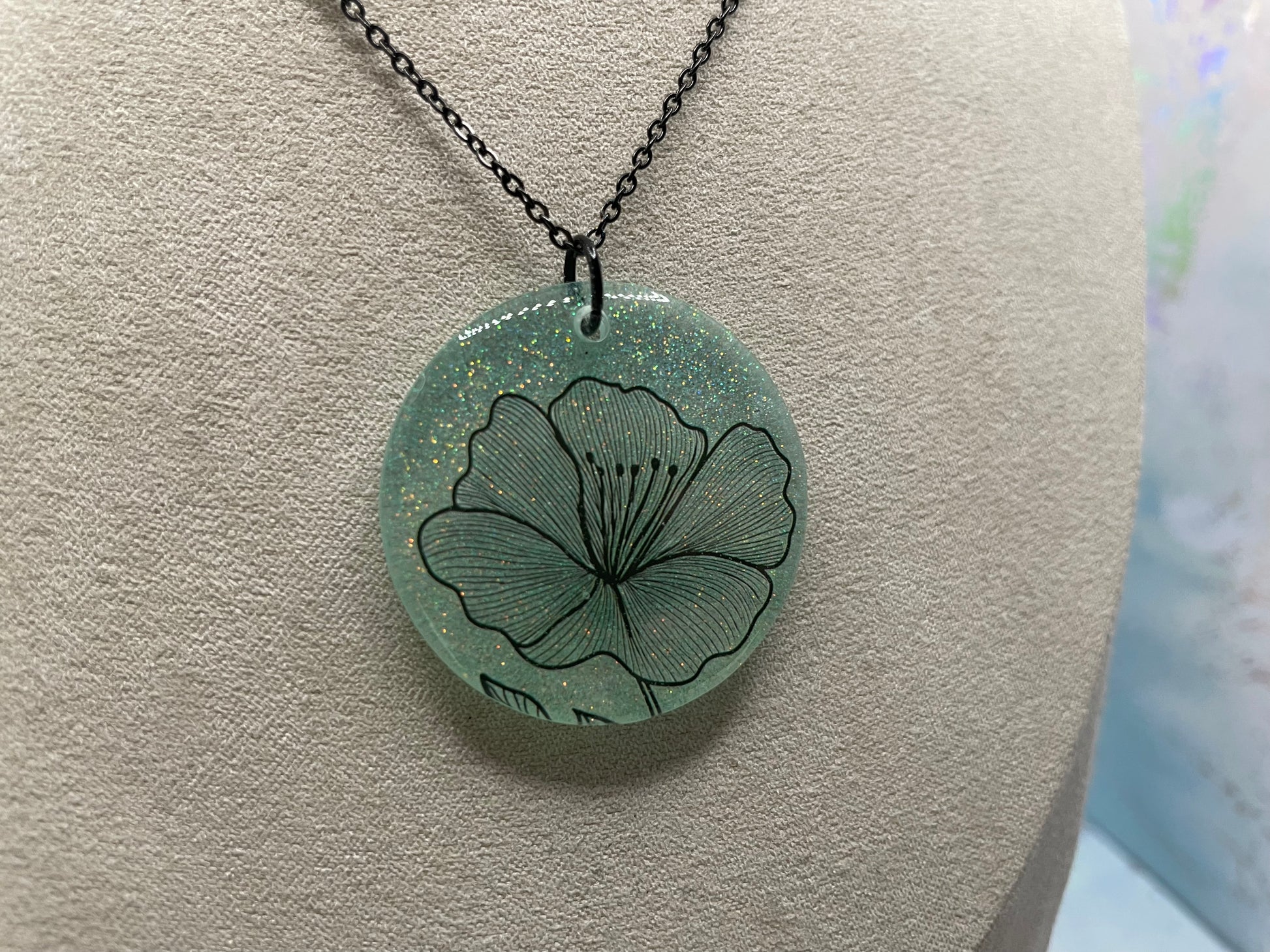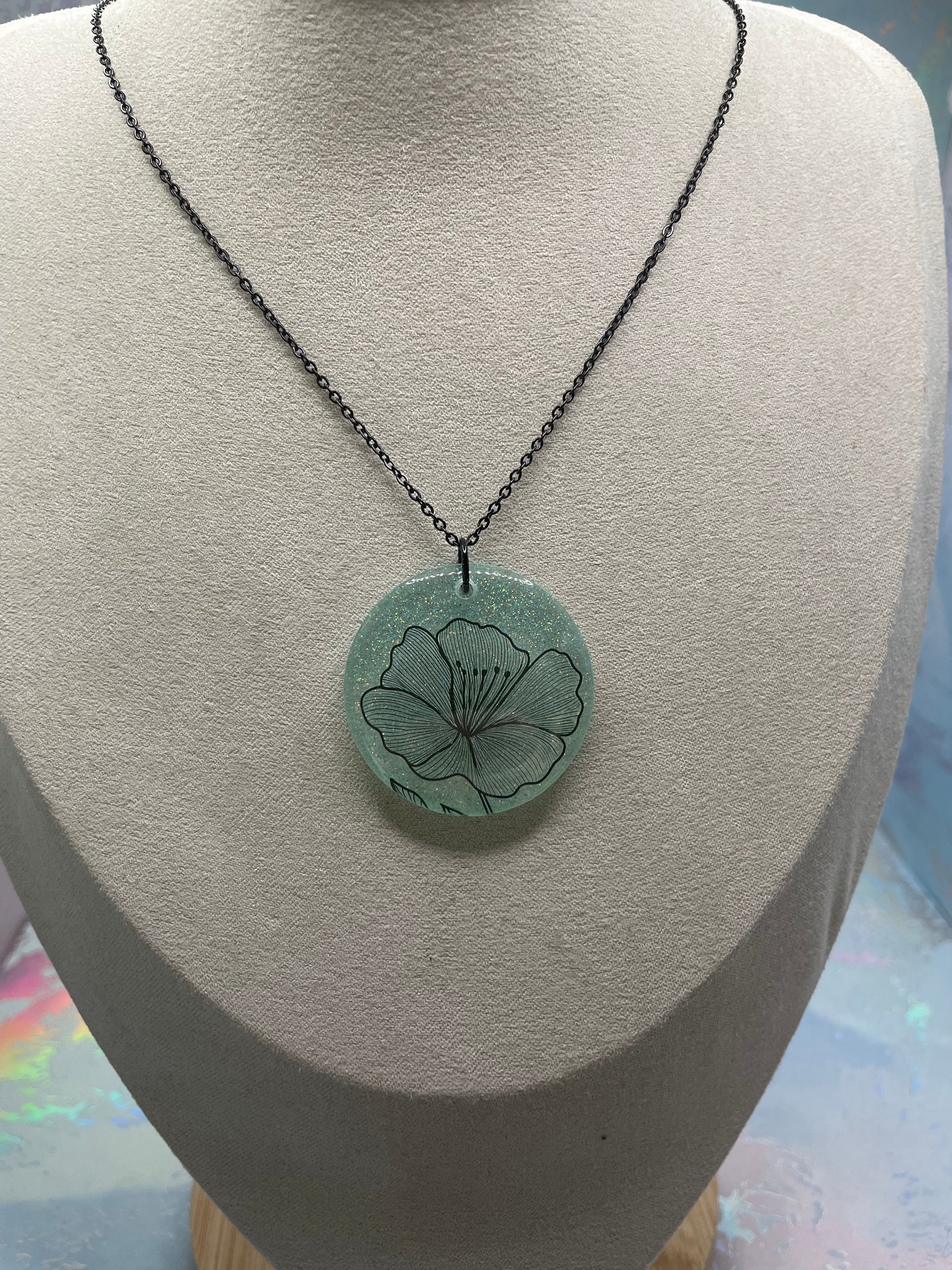 Ce collier rond en résine met en valeur une illustration florale délicate, posée sur un fond vert menthe doux rehaussé de subtils brillants. Le dessin fin de la fleur se distingue élégamment à travers la résine translucide, offrant un style à la fois épuré, moderne et intemporel.