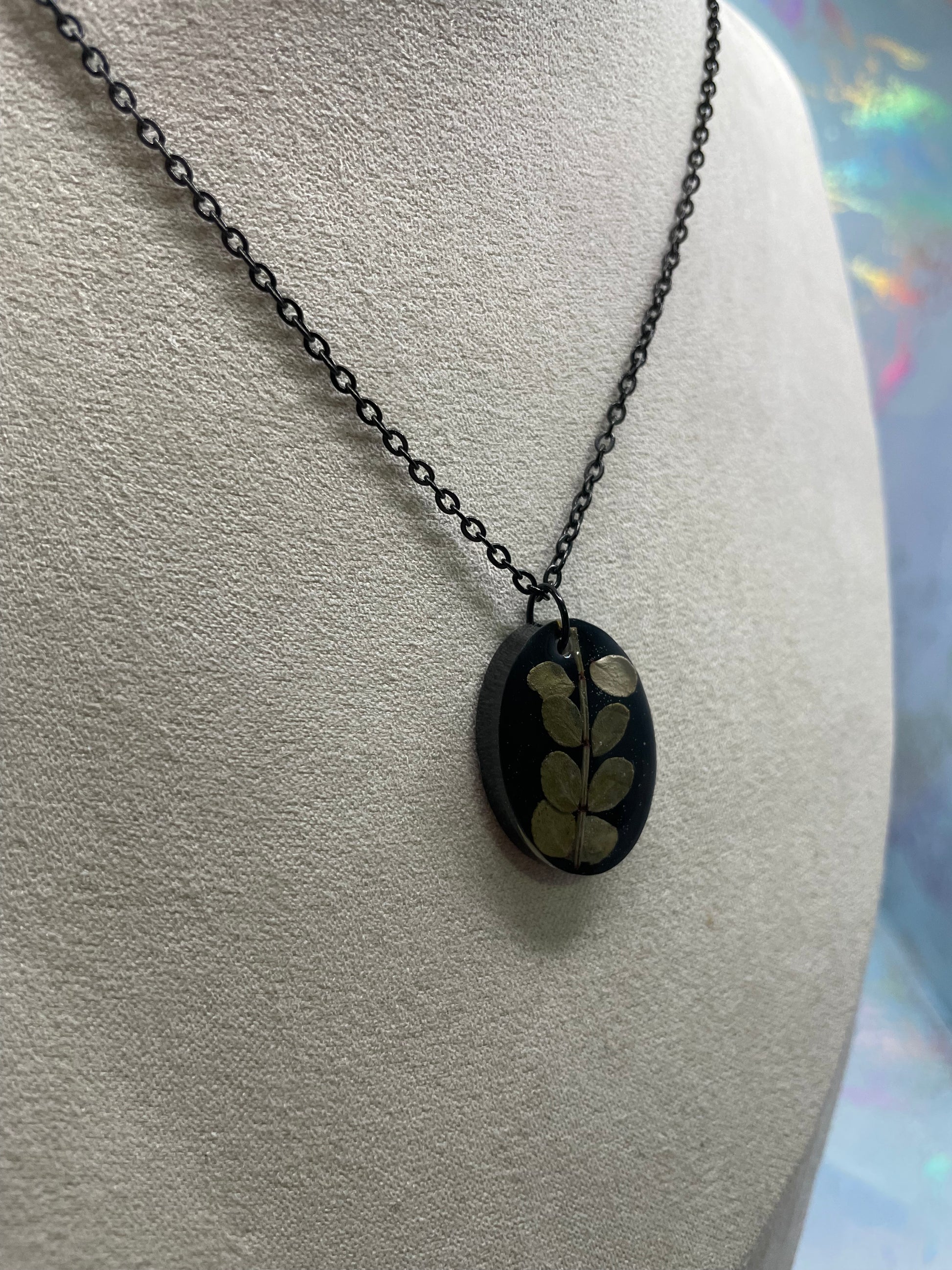 Ce collier ovale délicat met en valeur un véritable feuillage préservé, soigneusement encapsulé dans une résine noire profonde. Le contraste entre le fond sombre et les tons naturels du feuillage crée une esthétique botanique élégante et intemporelle. Chaque pièce est faite à la main, rendant chaque collier unique par ses détails naturels.