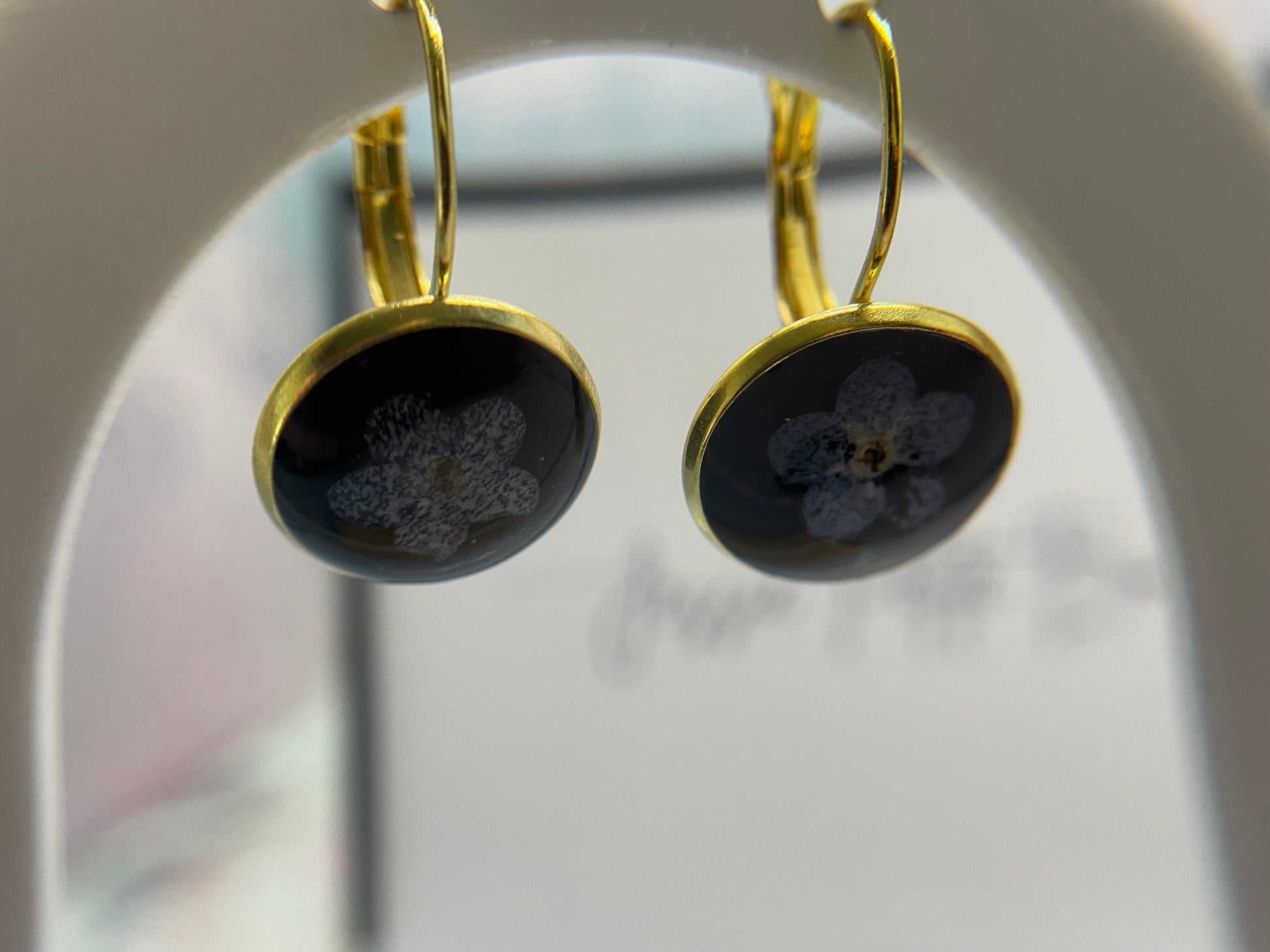 Ces boucles d’oreilles délicates à forme ronde mettent en valeur une véritable fleur de myosotis séchée, soigneusement préservée dans la résine sur un fond noir profond. Le contraste fait ressortir la texture naturelle de la fleur et crée un bijou élégant, discret et intemporel.